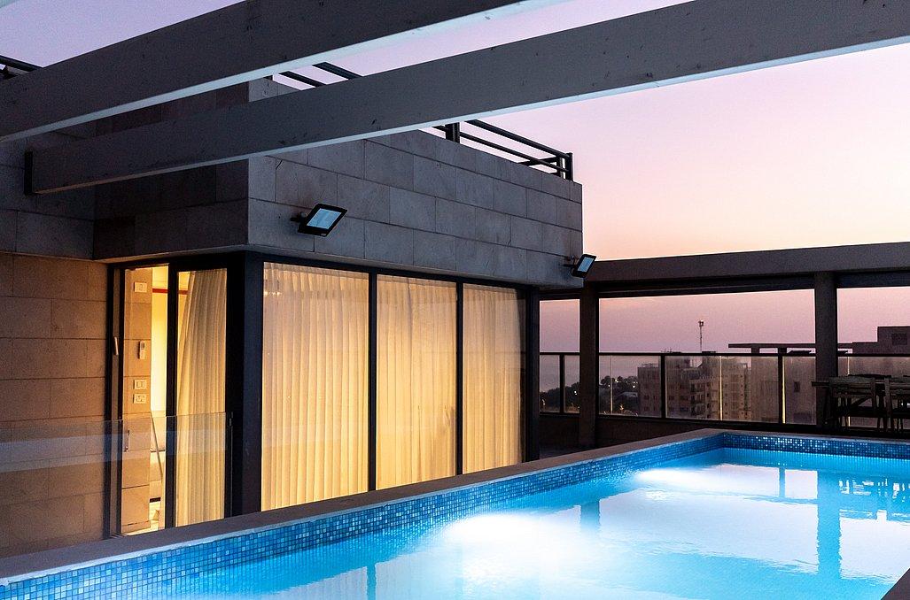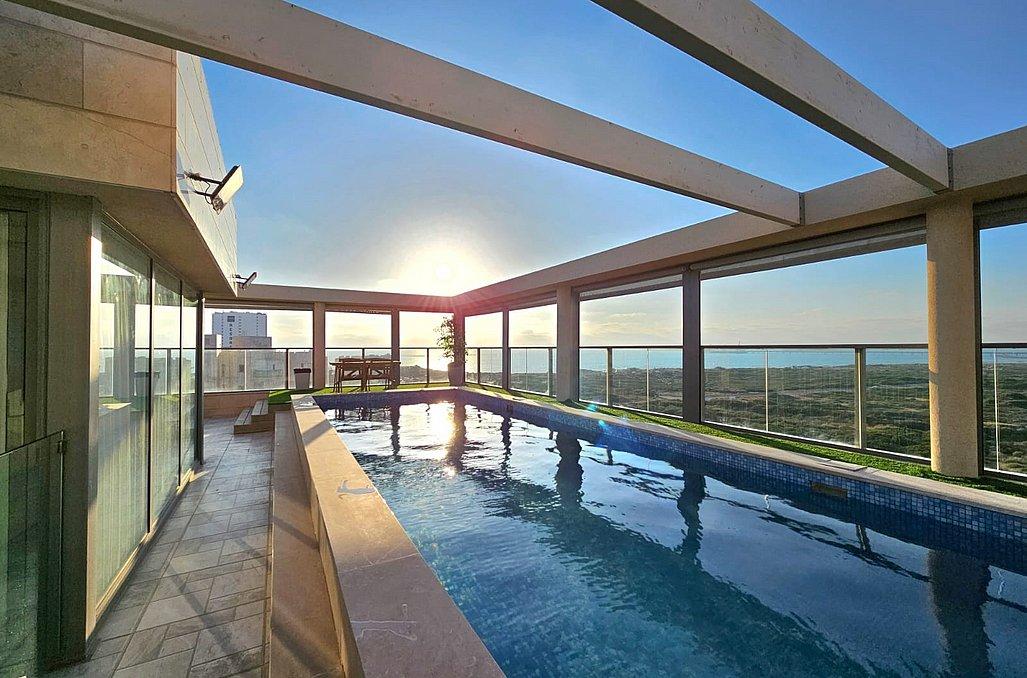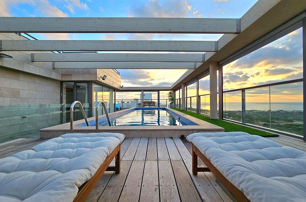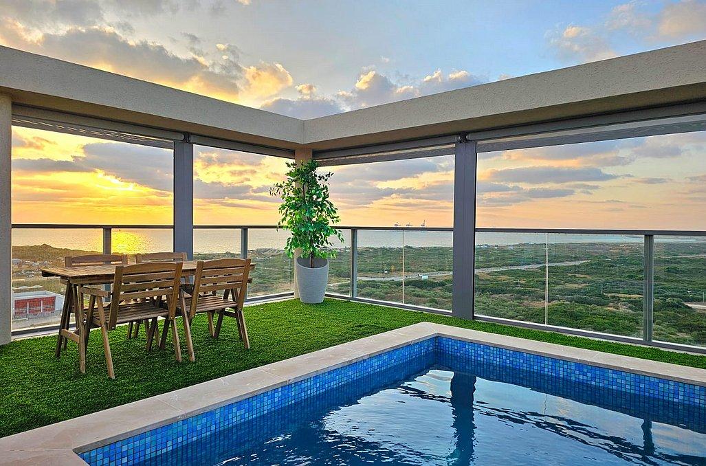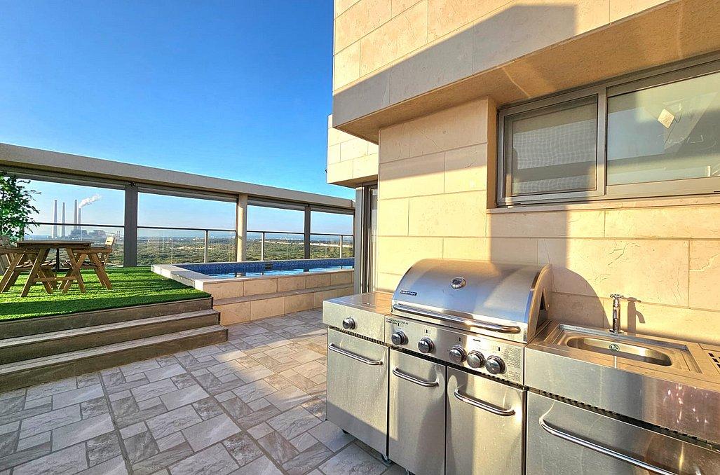 הפנטהאוז מאובזר בכל מה שצריך לחופשה מעולה ורגועה - מטבח, סלון מעוצב, 3 חדרי שינה מפנקים, מתחם חוץ עם עמדת מנגל, בריכת שחייה מחוממת ועוד.