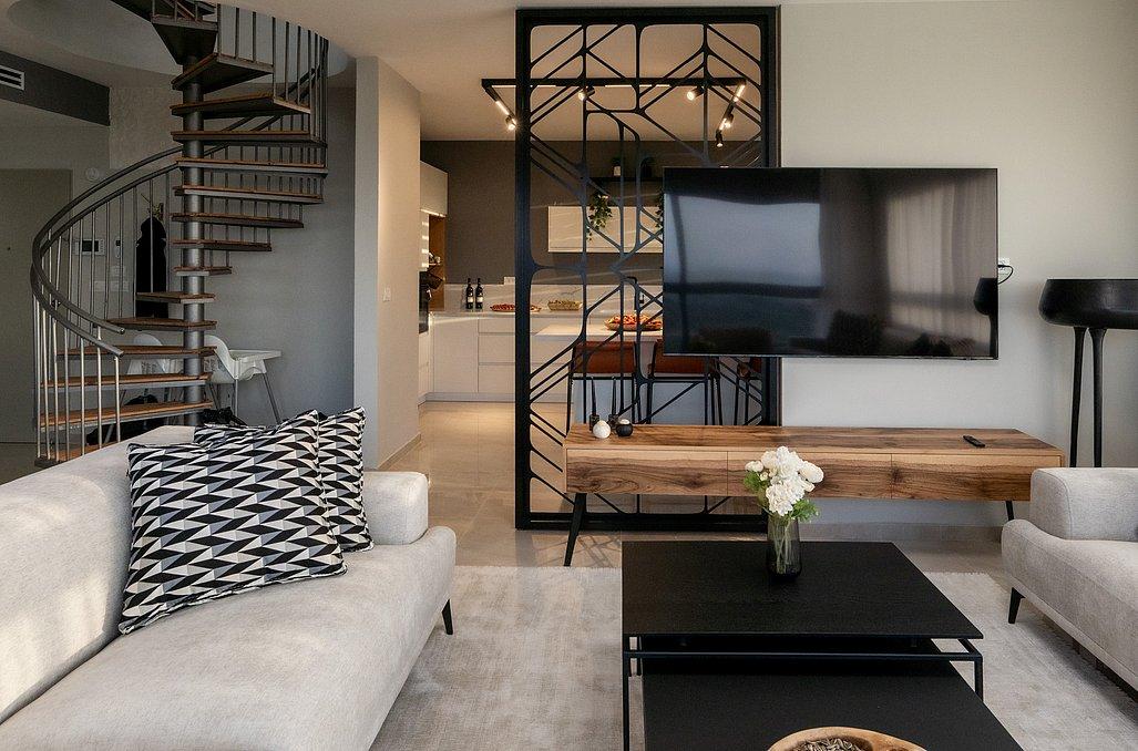 סלון מעוצב ומרווח עם מערכת ישיבה וטלוויזיה בגודל 75"