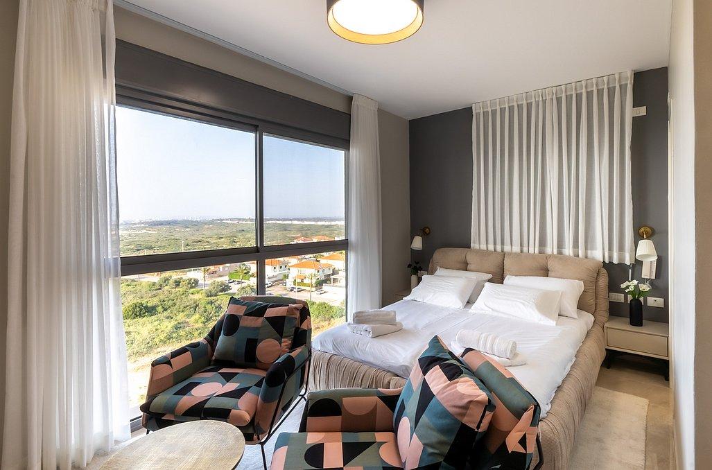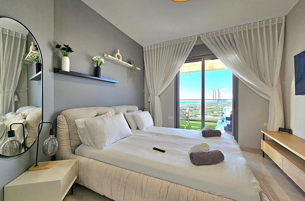 חדר שינה 1 - מיטה זוגית בגודל 200 על 200 מטר, 2 מזרני יחיד, לול לתינוקות, מזגן, טלוויזיה, שידות אחסון, חדר רחצה פרטי ונוף מדהים.