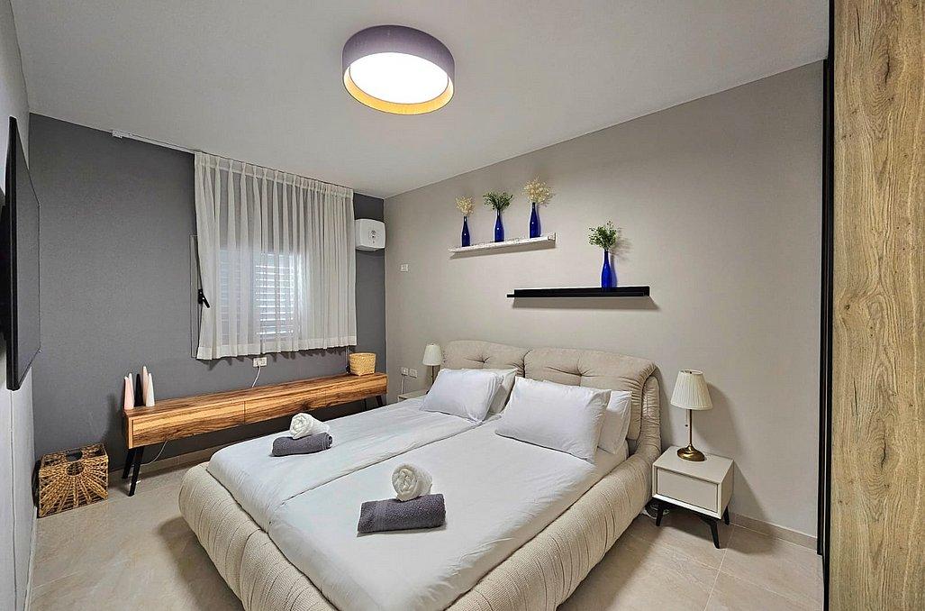 חדר שינה 3 - חדר ממ"ד - מיטה זוגית בגודל 200 על 200 מטר, מזרן יחיד, מזגן, טלוויזיה ושידות אחסון.