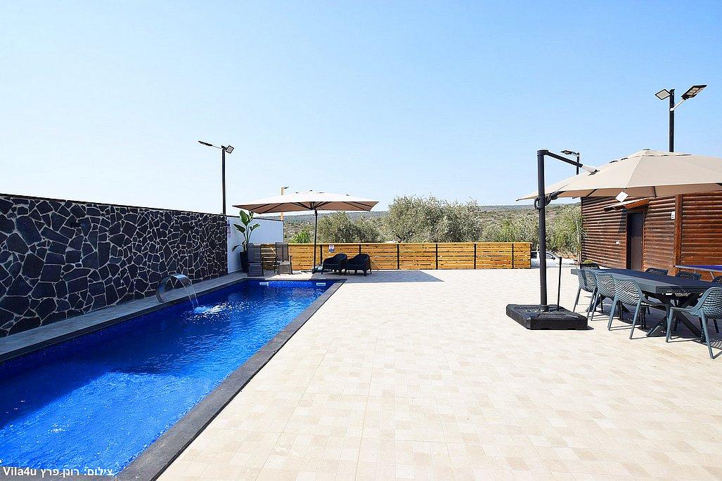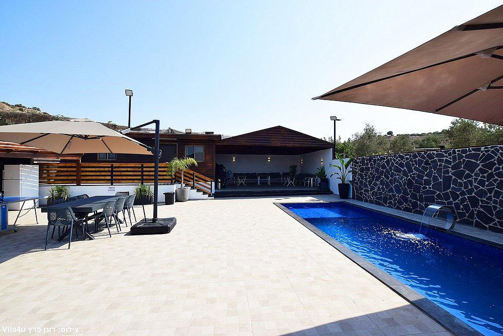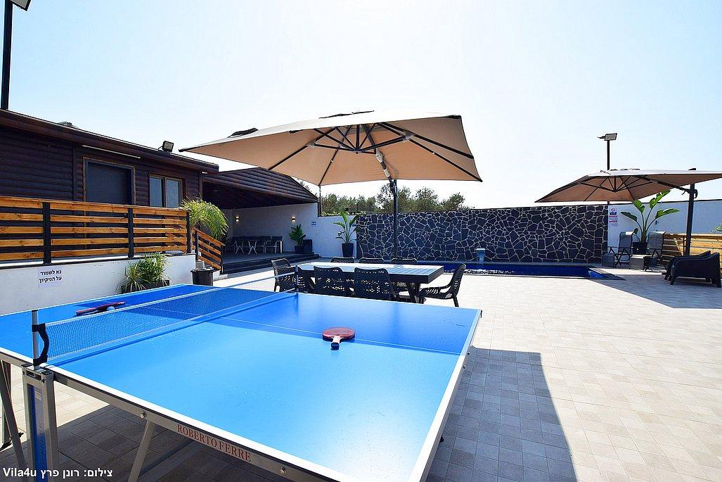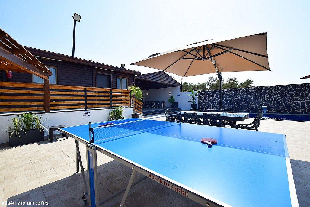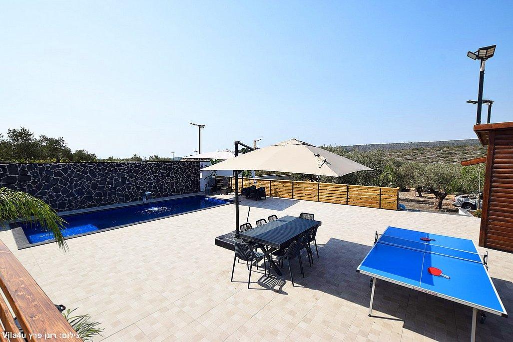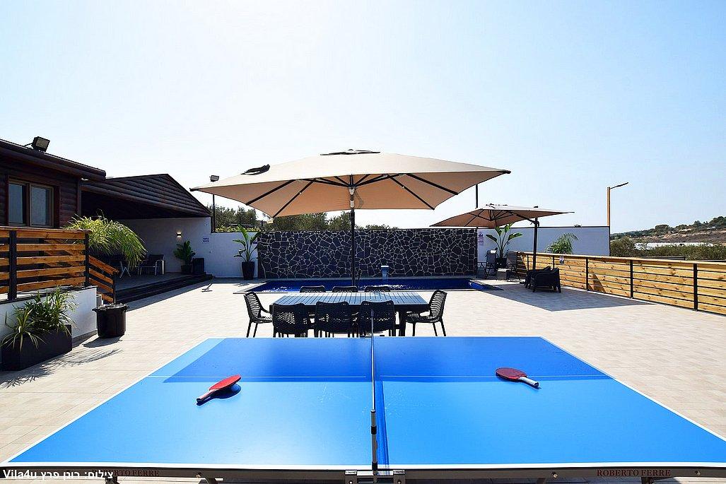 החצר הרחבה מטופחת ומזמינה – עם בריכת שחייה גדולה ונקייה, מיטות שיזוף, פינות ישיבה נעימות, שולחן פינג פונג, מטבח חיצוני מאובזר, עמדת BBQ ועוד המון פינוקים.