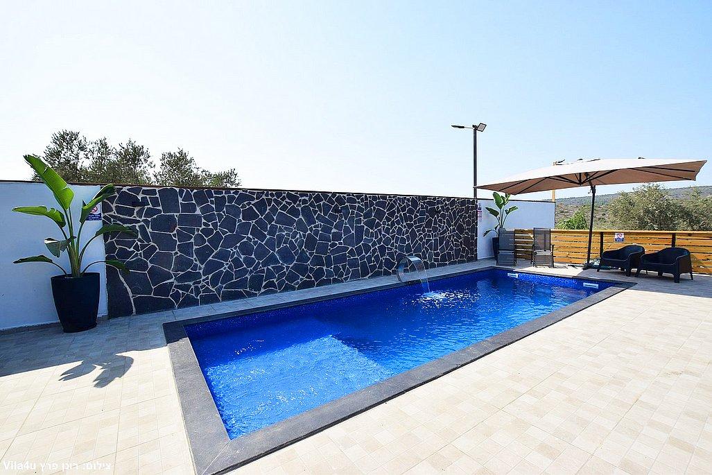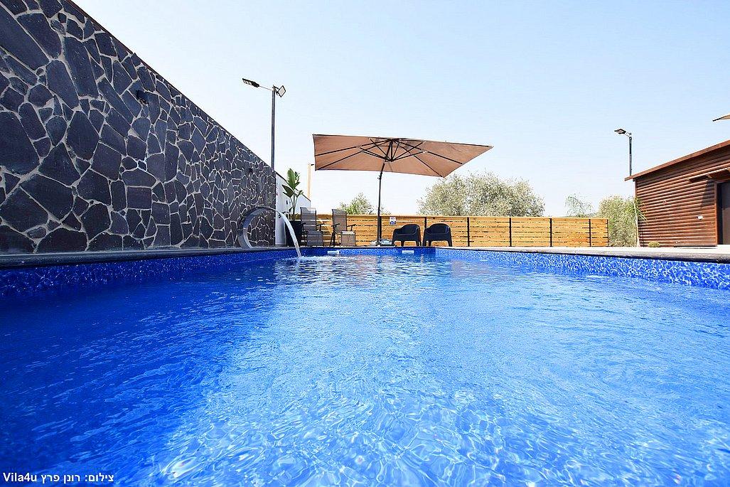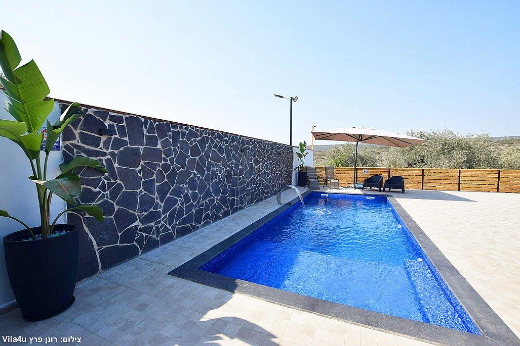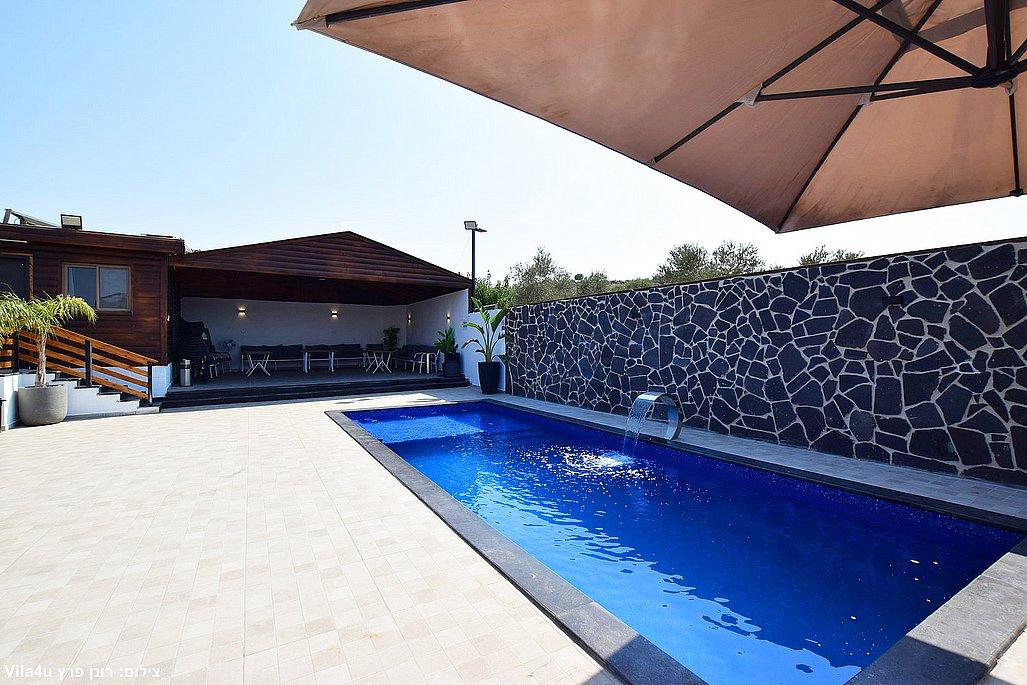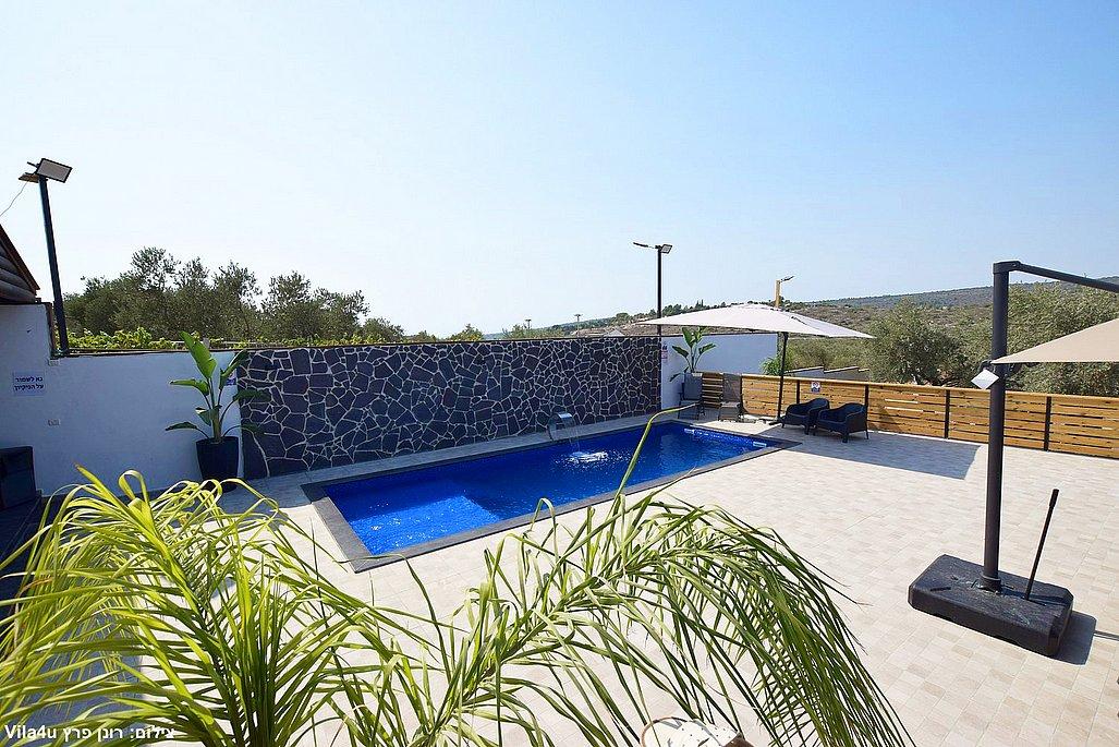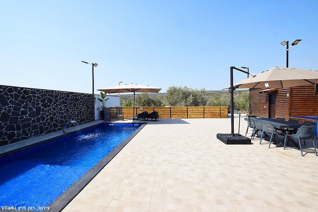 החצר הרחבה מטופחת ומזמינה – עם בריכת שחייה גדולה ונקייה, מיטות שיזוף, פינות ישיבה נעימות, שולחן פינג פונג, מטבח חיצוני מאובזר, עמדת BBQ ועוד המון פינוקים.