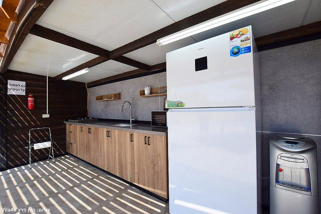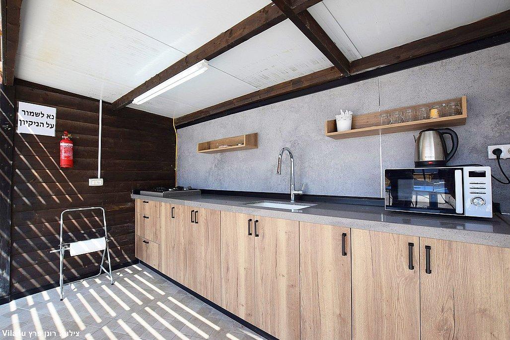 - מטבח חוץ מאובזר הכולל: מקרר, מקפיא, כיריים, כיור, מיקרוגל, קומקום, פינת קפה ועוד