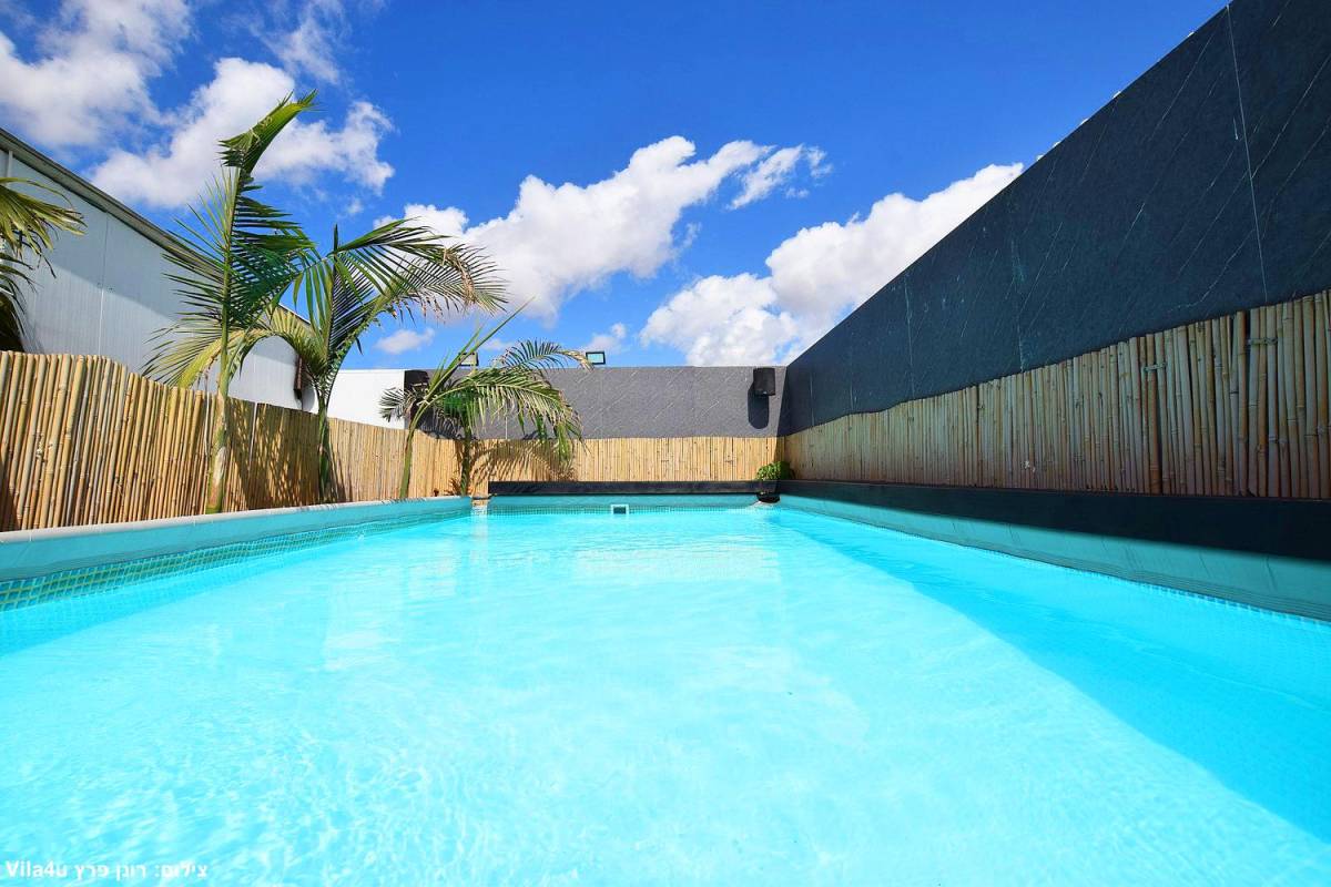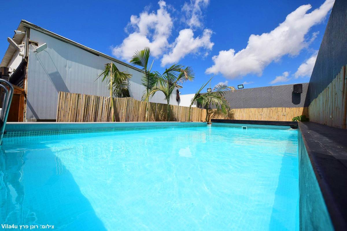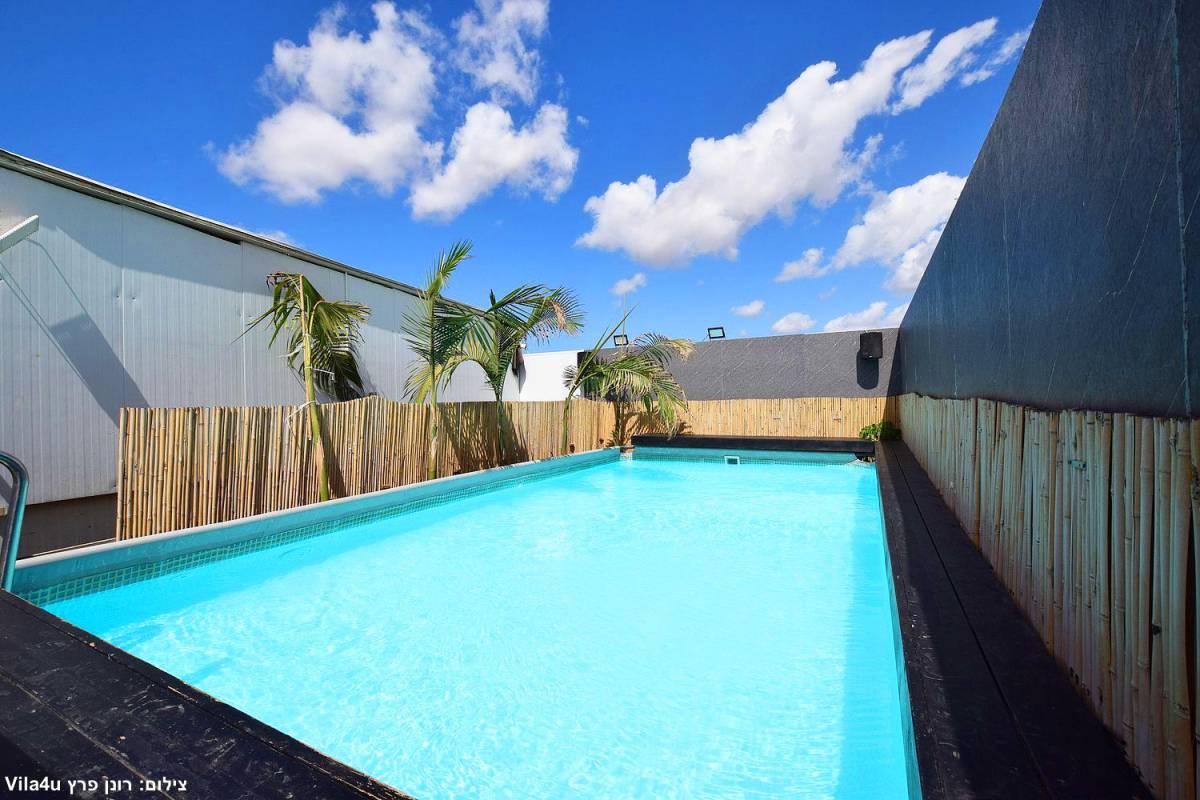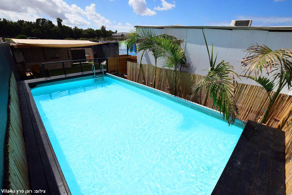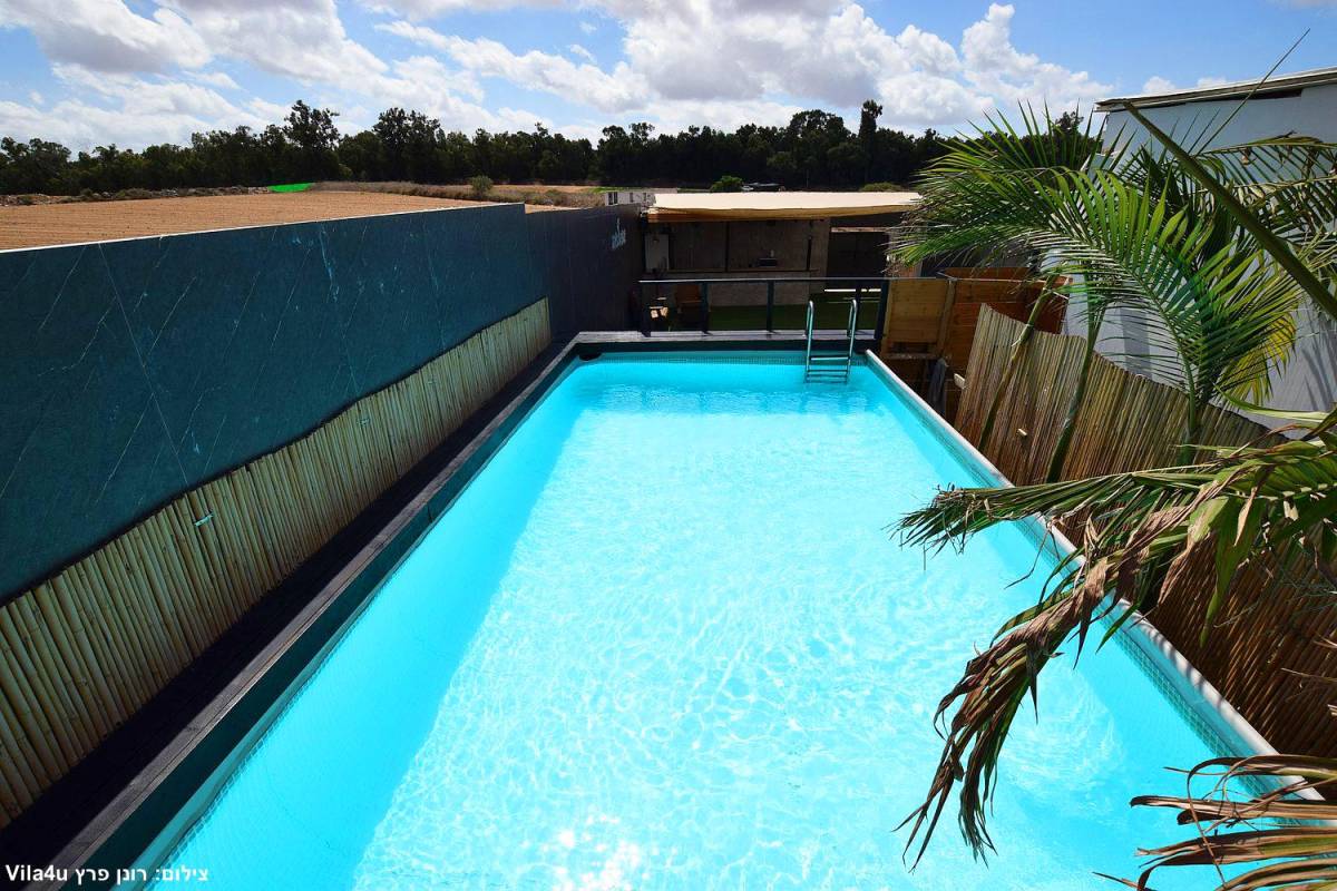 בריכת שחייה מחופה בדק עם מיטות שיזוף