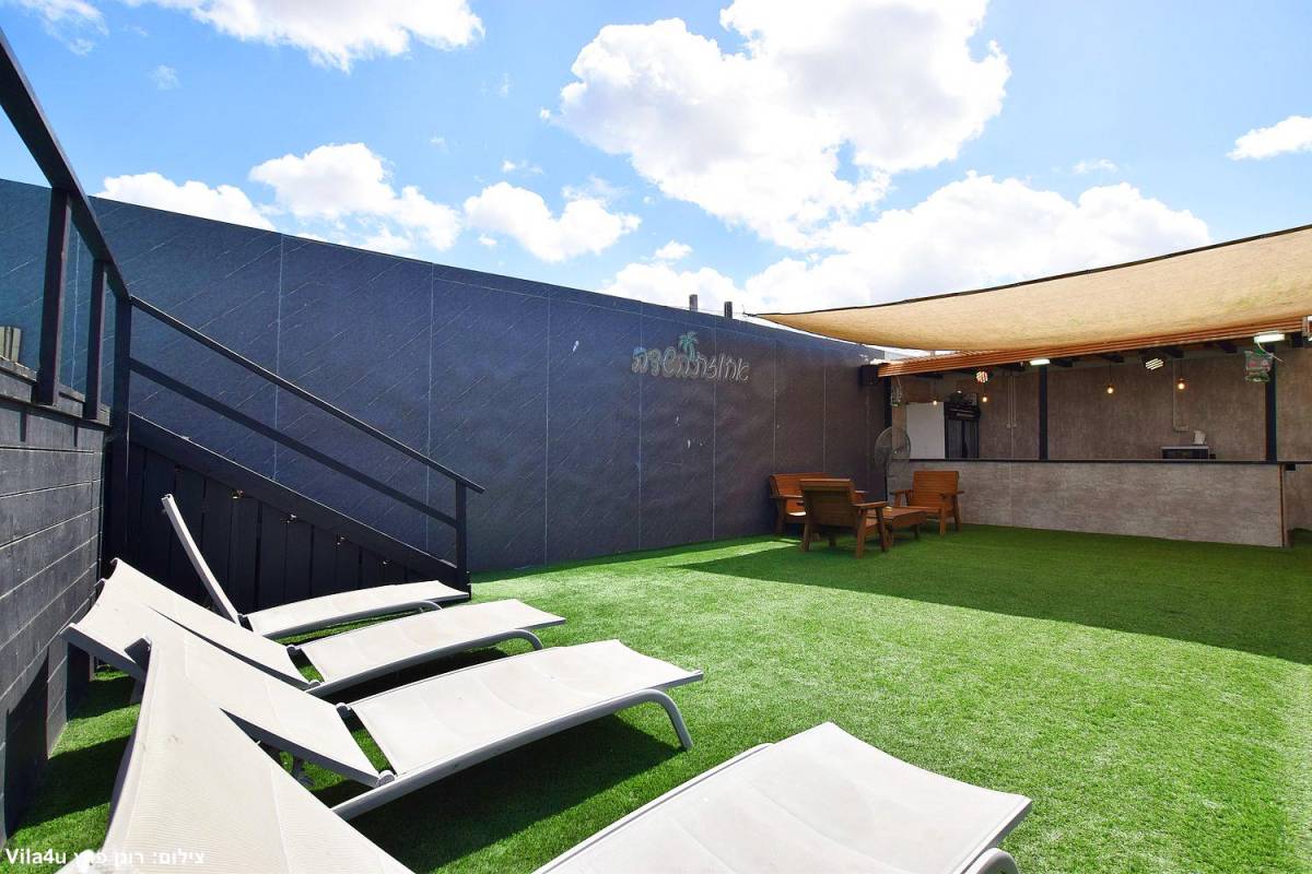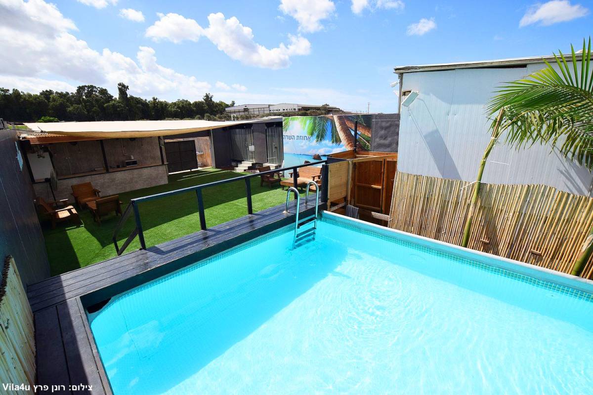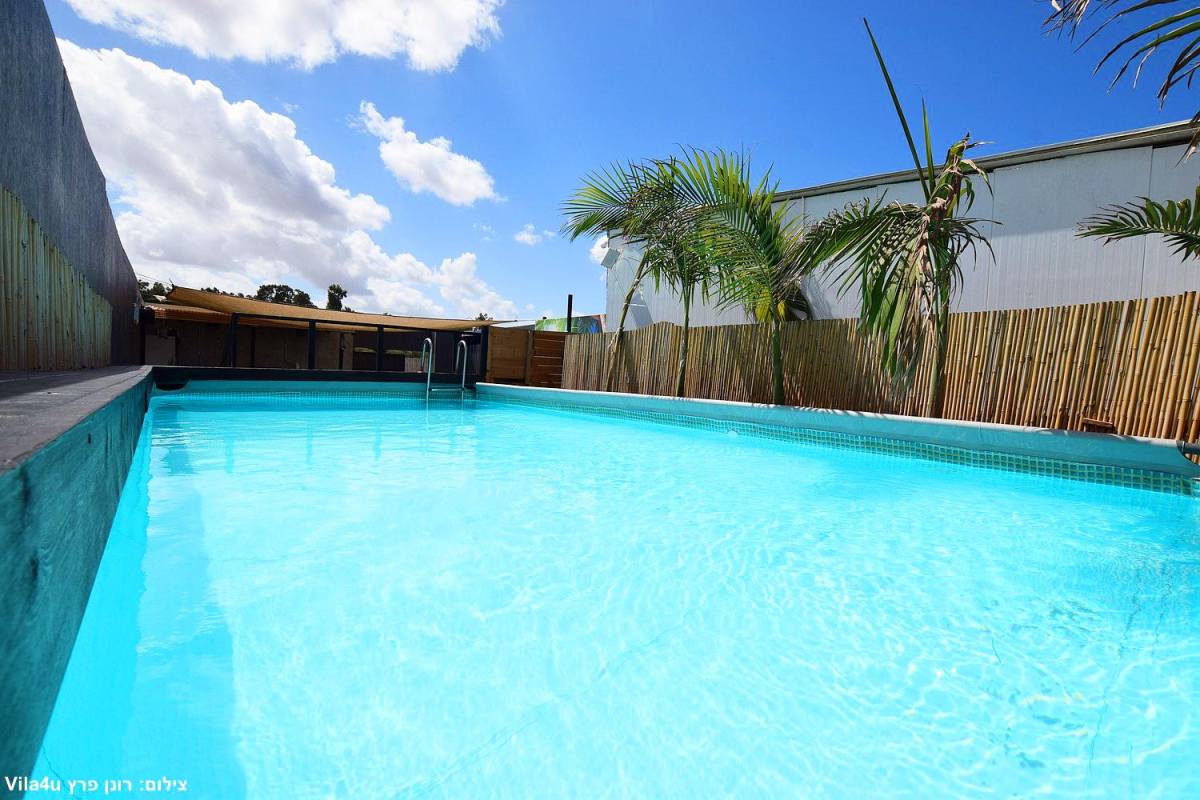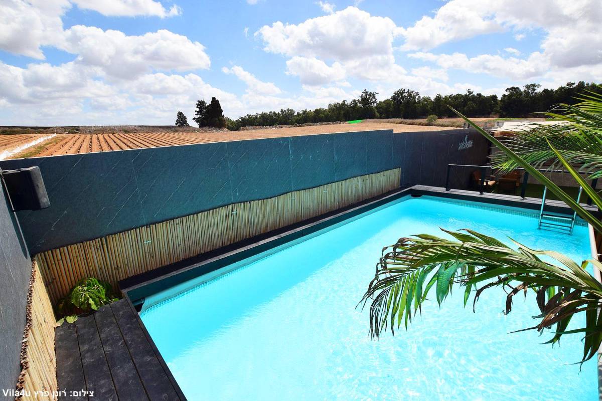 בריכת שחייה מחופה בדק עם מיטות שיזוף