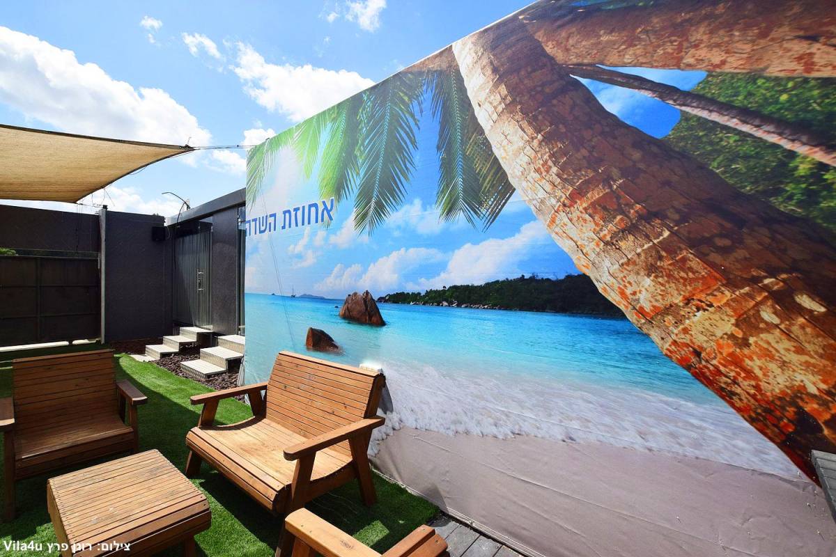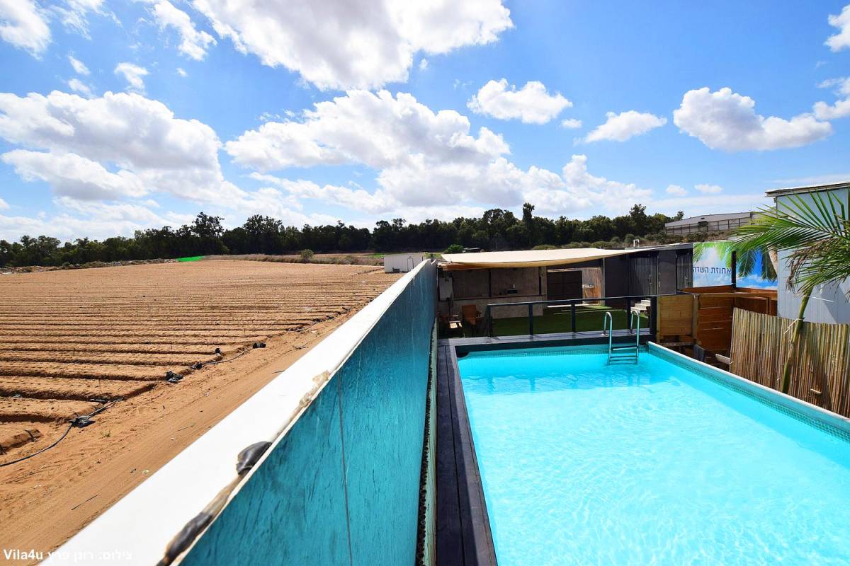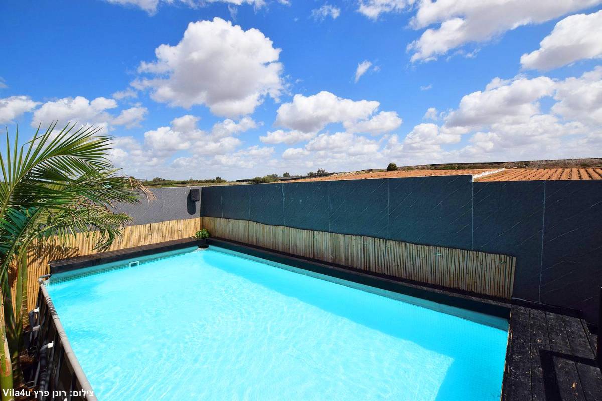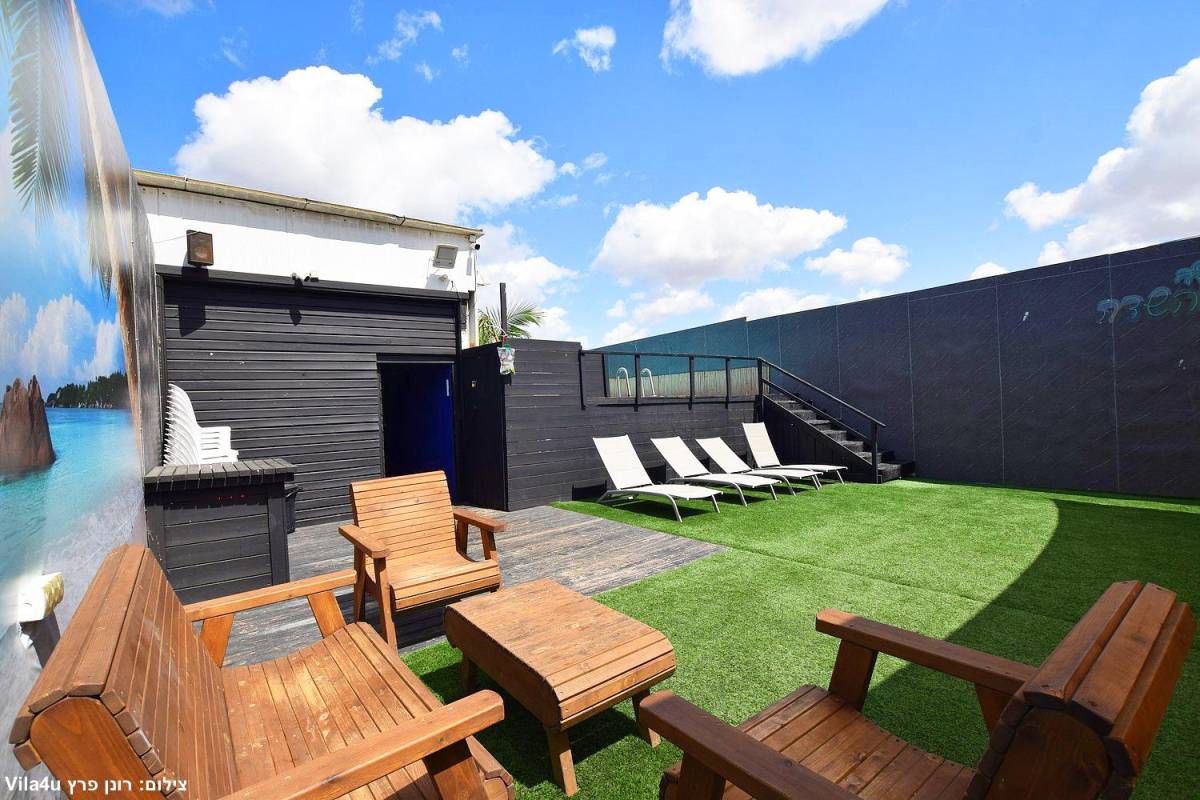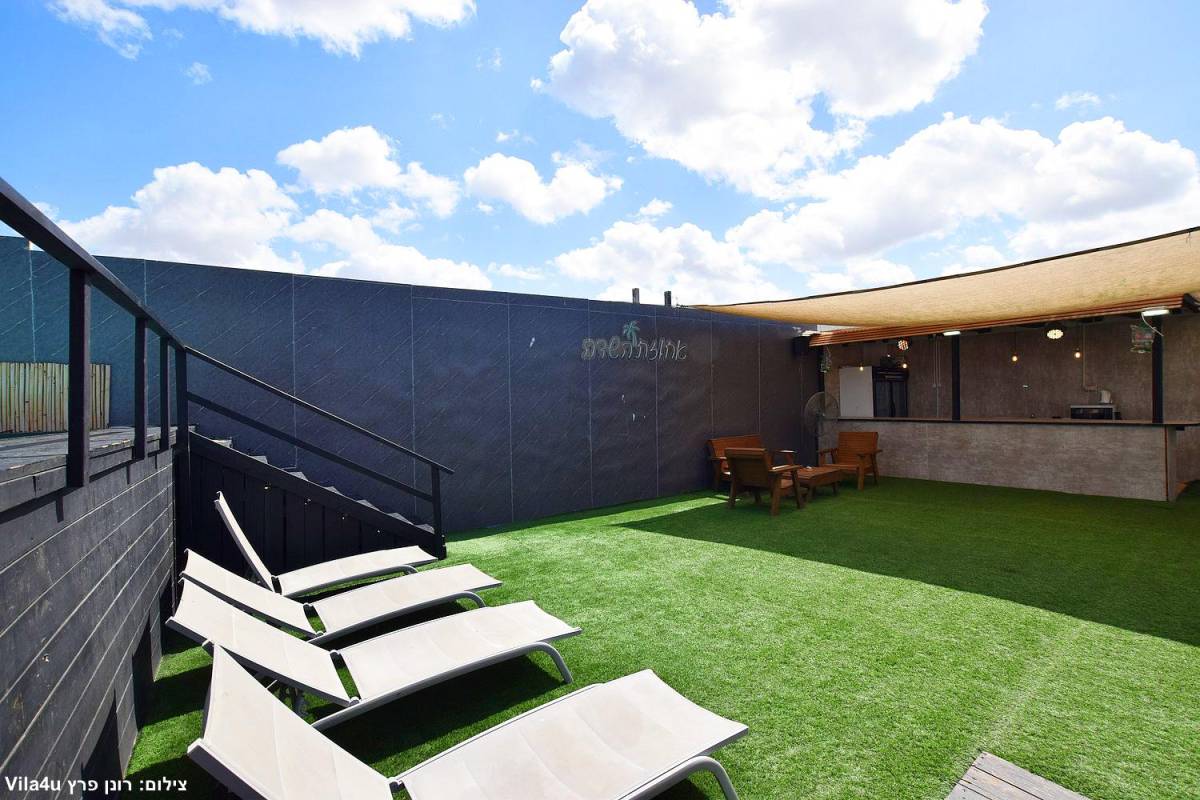 בריכת שחייה מחופה בדק עם מיטות שיזוף