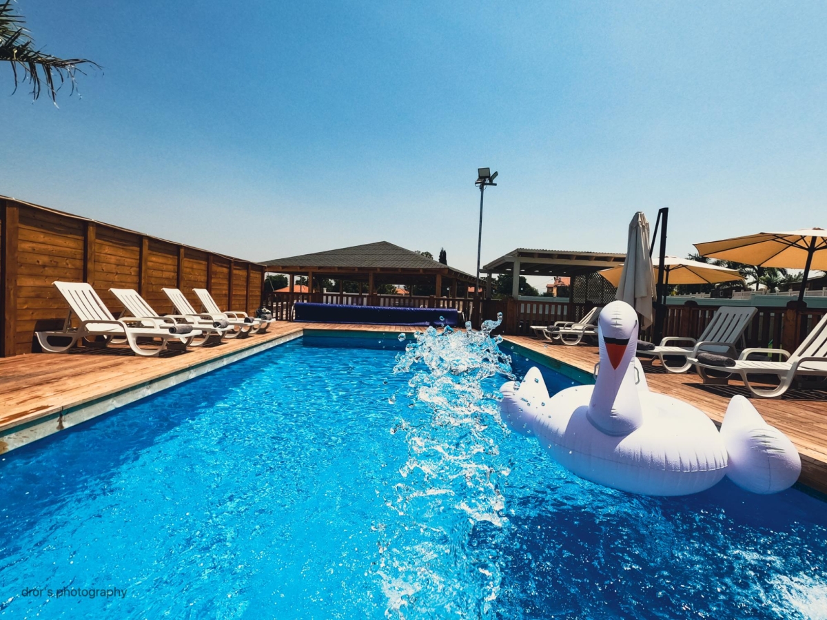מיטות וכיסאות שיזוף סביב הבריכה