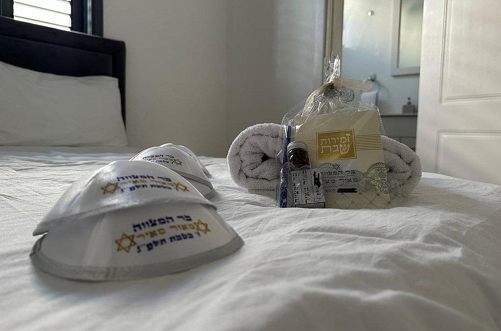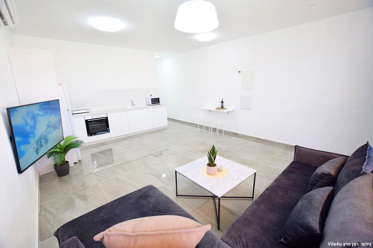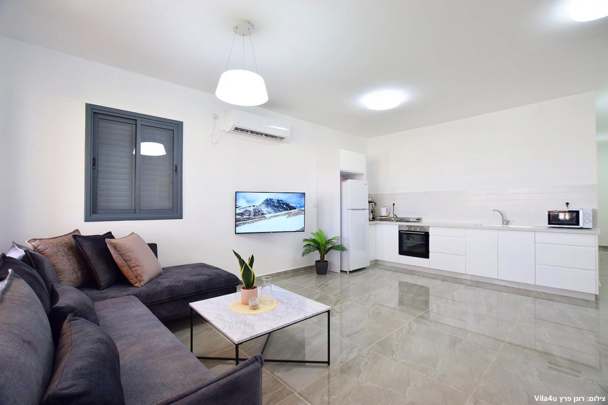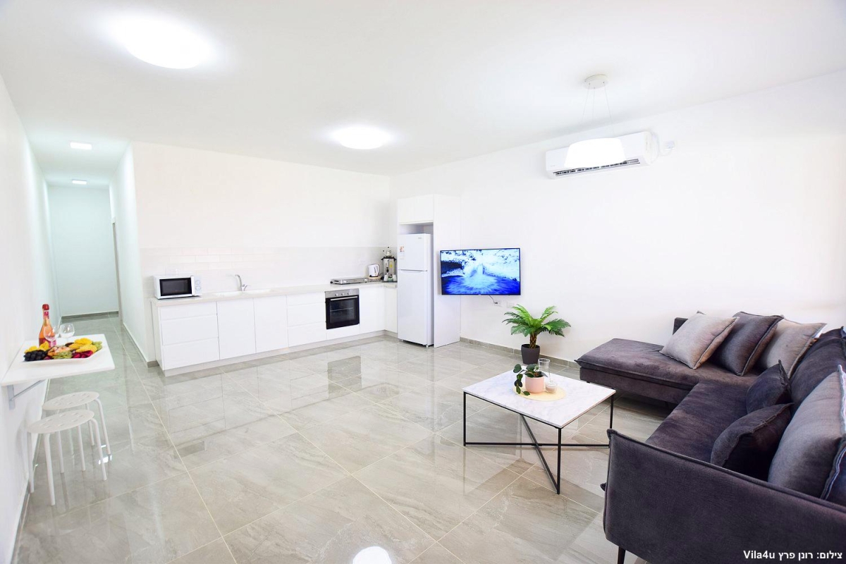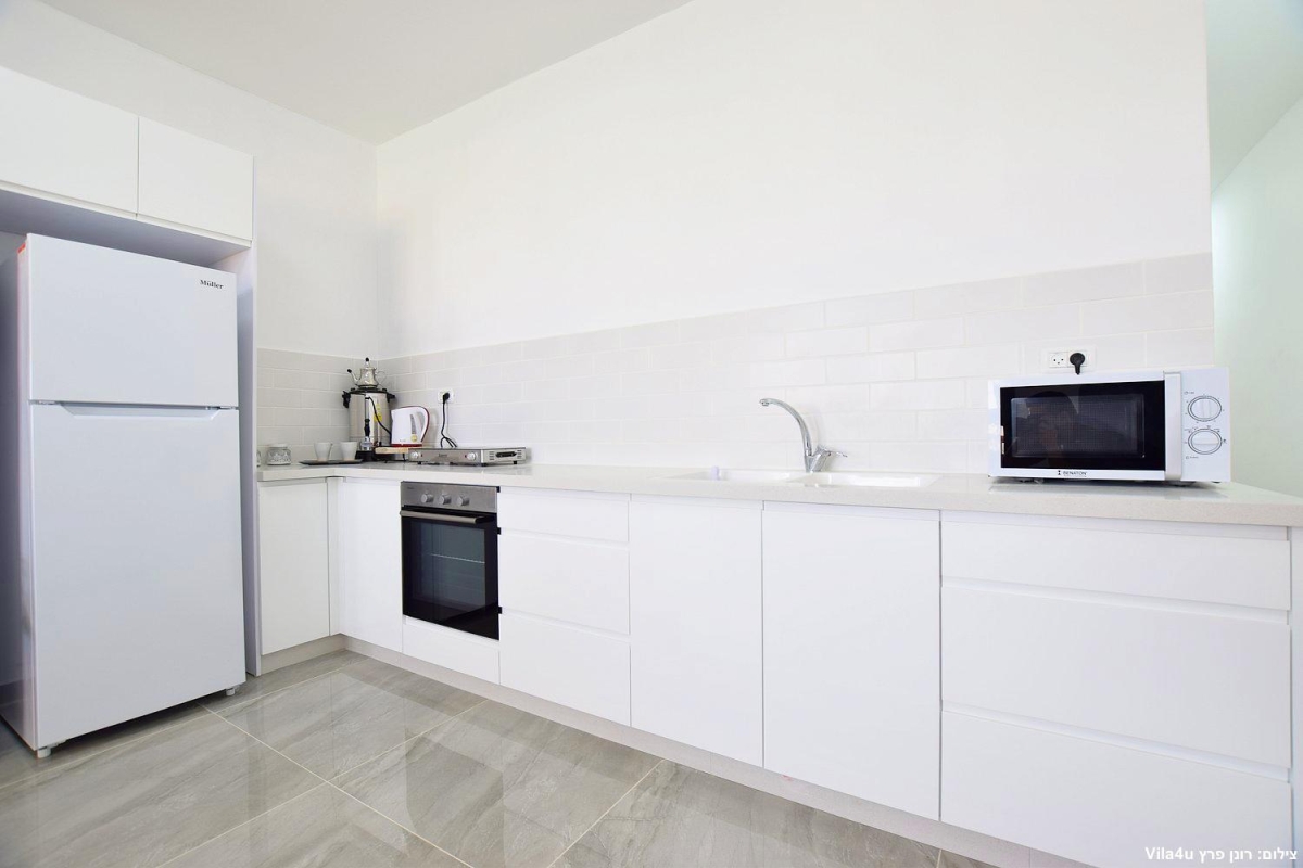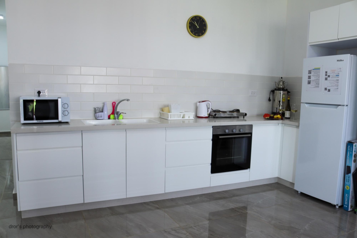 מטבח מאובזר עם כיור כפול (חלבי ובשרי) , מיקרוגל, תנור אפייה, כיריים חשמליות לבישול, מקרר, כלי אוכל והגשה, מיחם ופלטה לשבת, קומקום חשמלי.