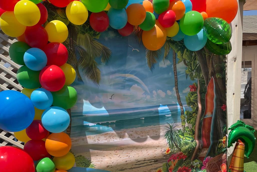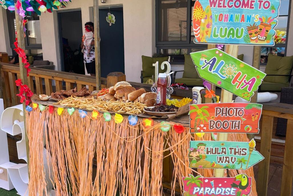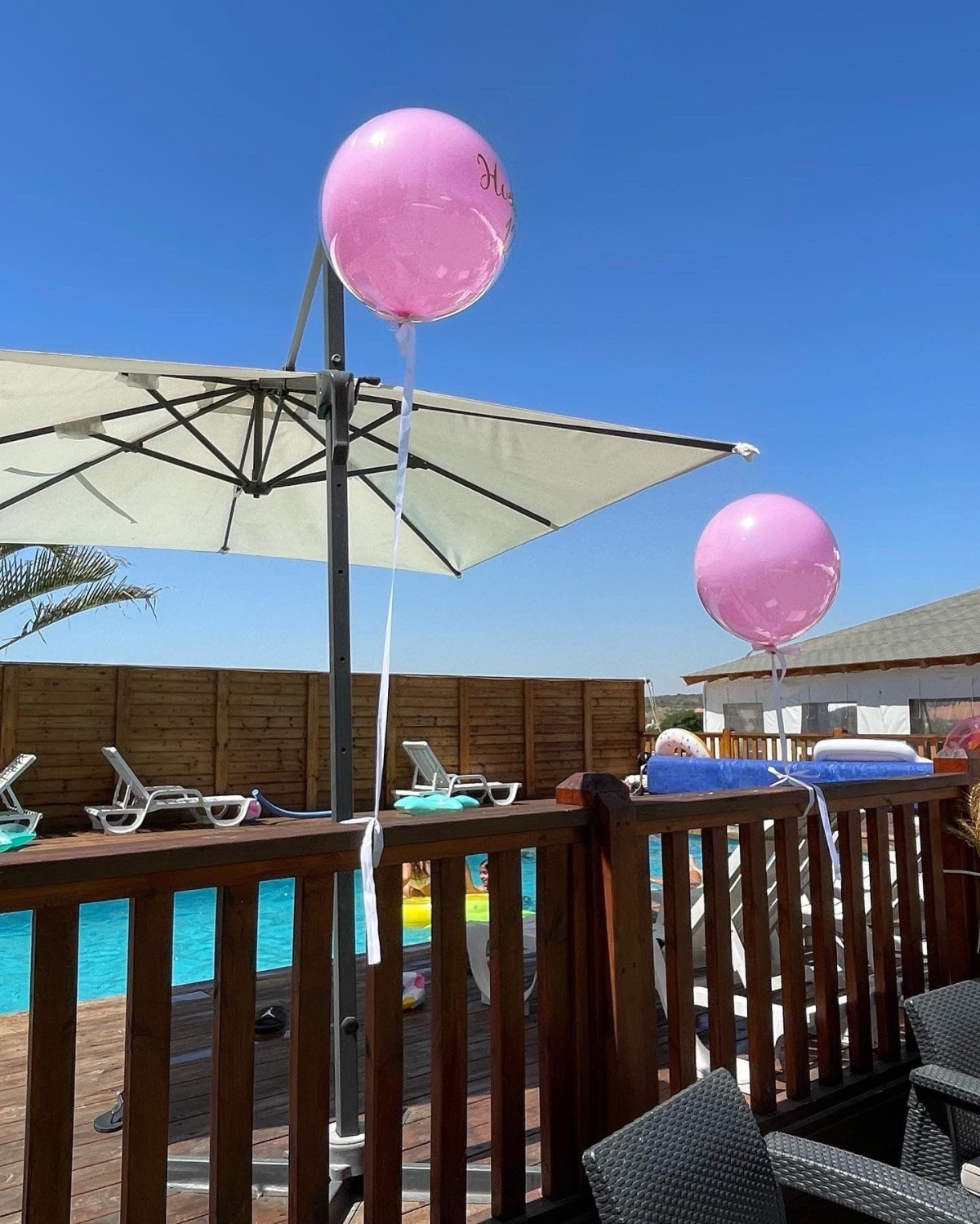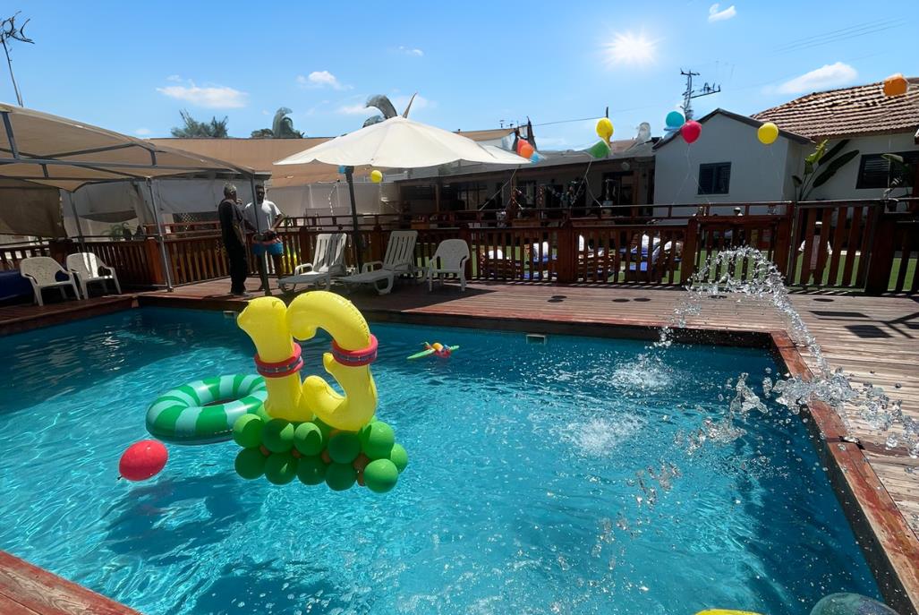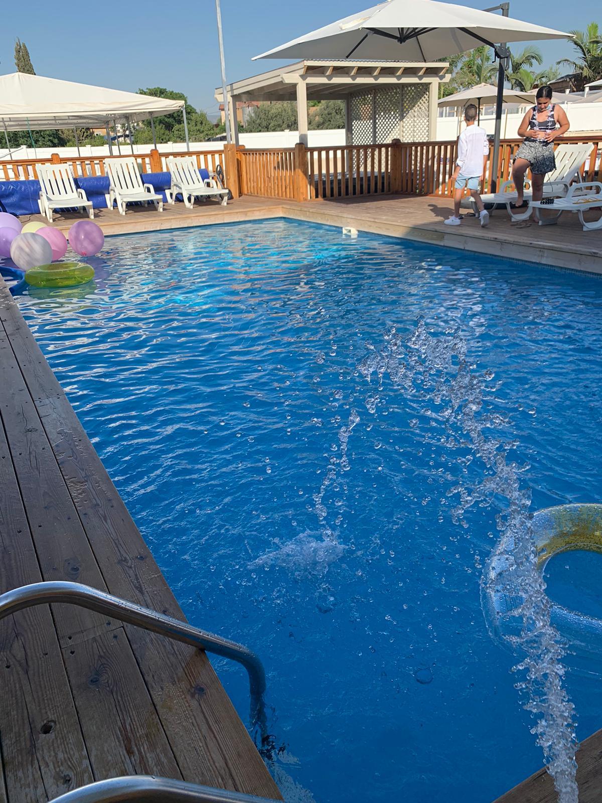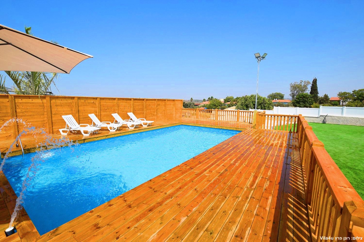 בריכה בנויה סביב דק מפואר הכוללת מפלי מים. גודל בריכת השחייה 10 על 5