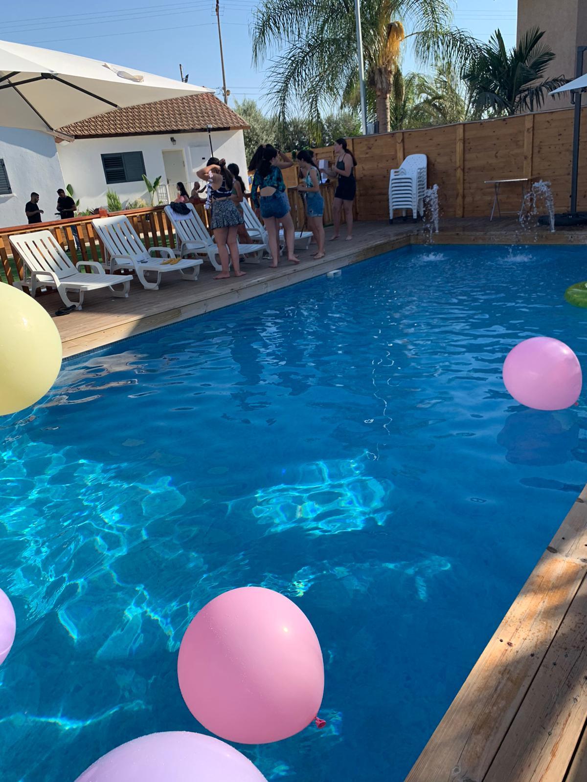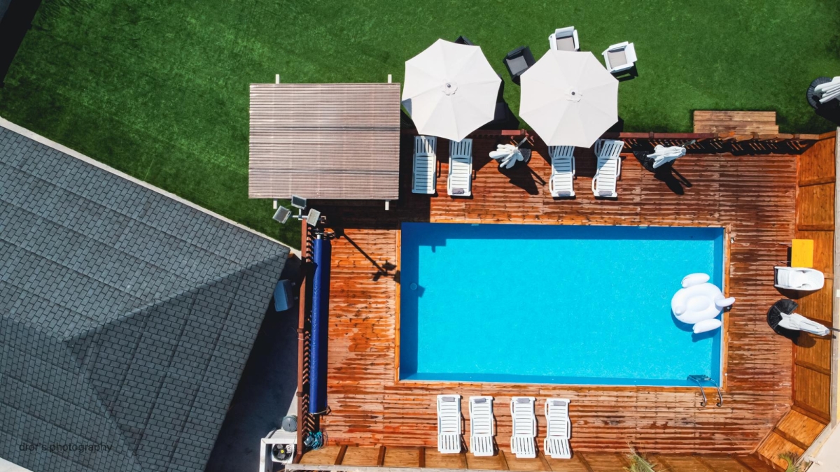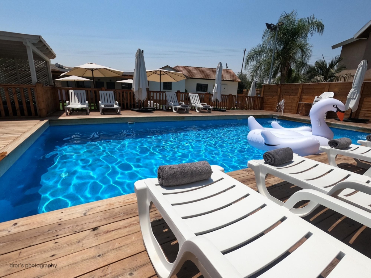 מיטות וכיסאות שיזוף סביב הבריכה