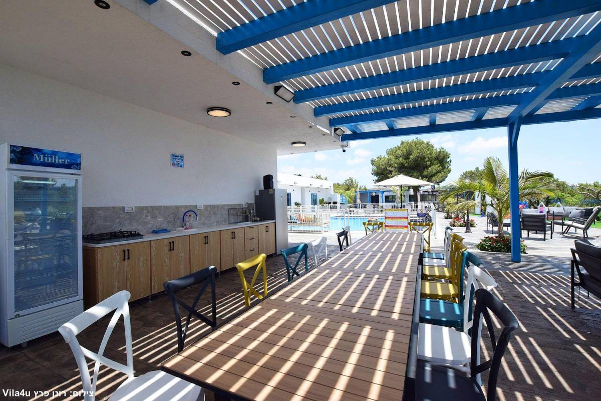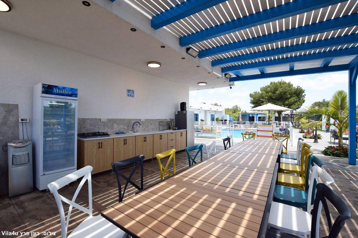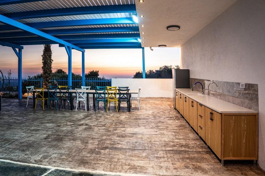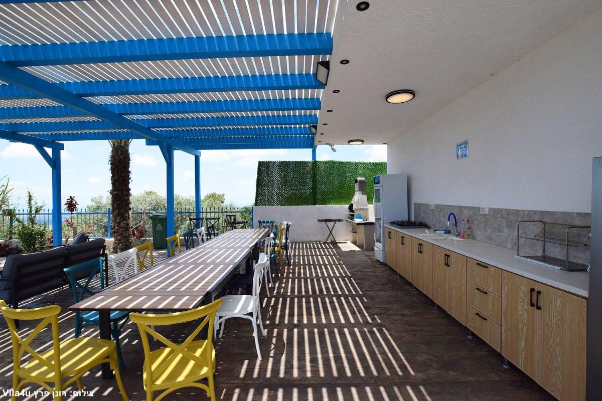 מטבח חוץ מקורה הכולל משטח עבודה, מקרר, כיור ופינת אוכל גדולה