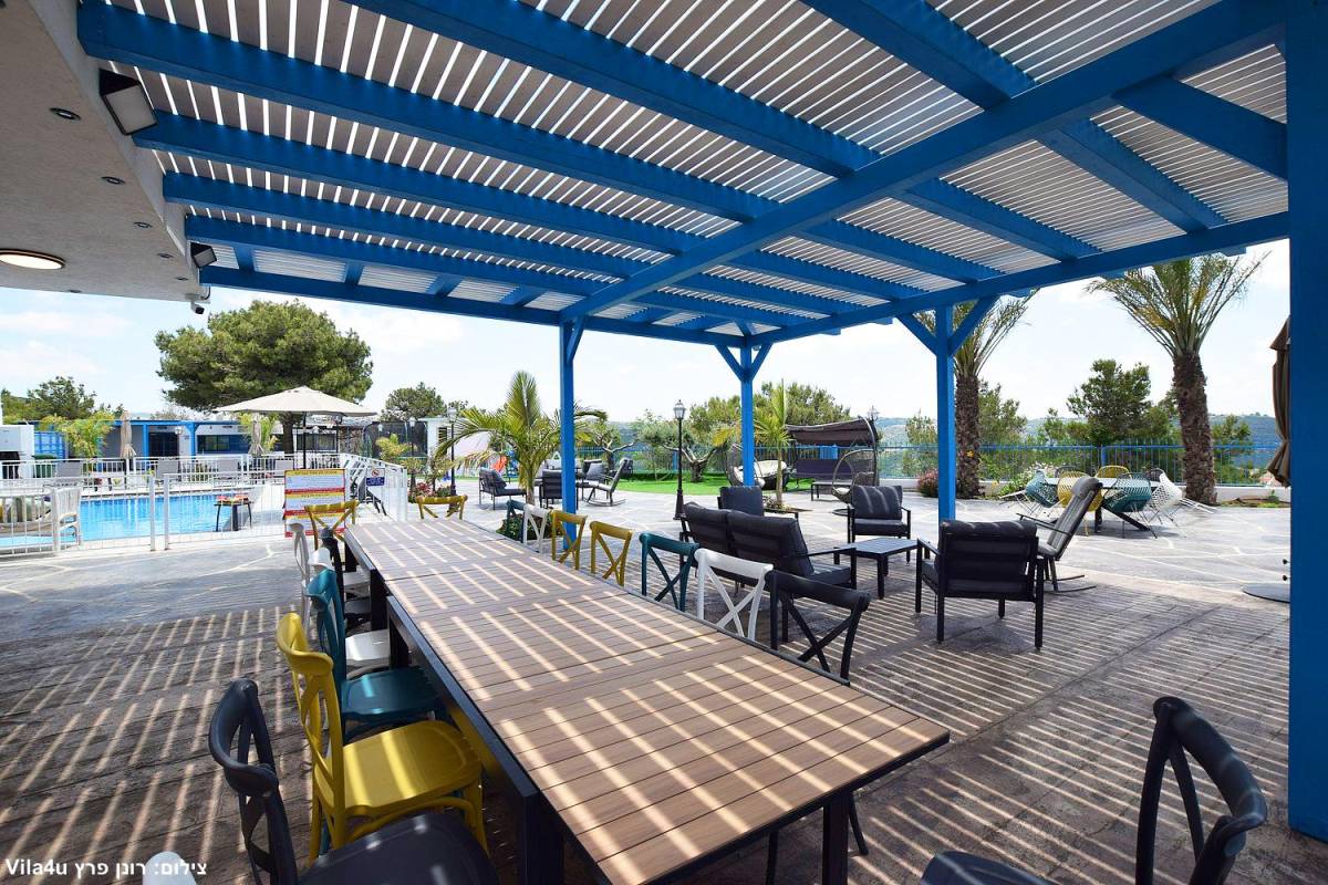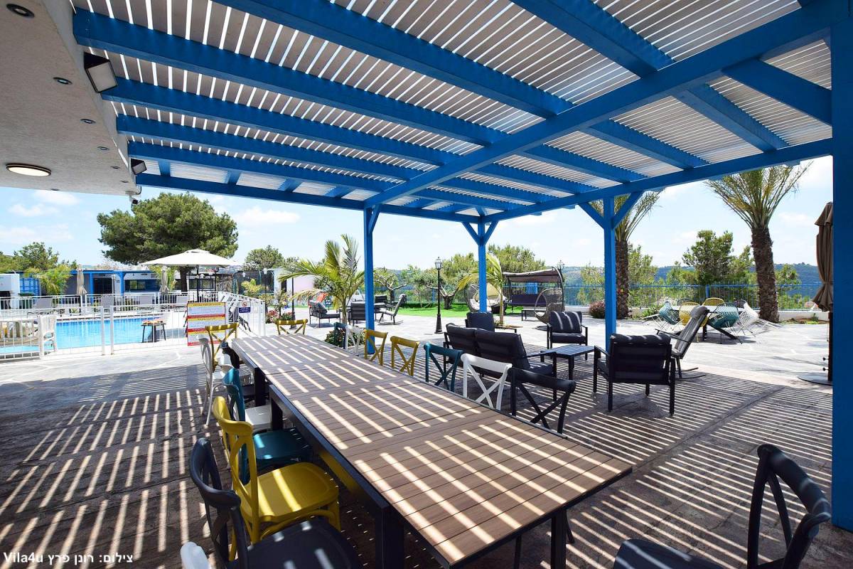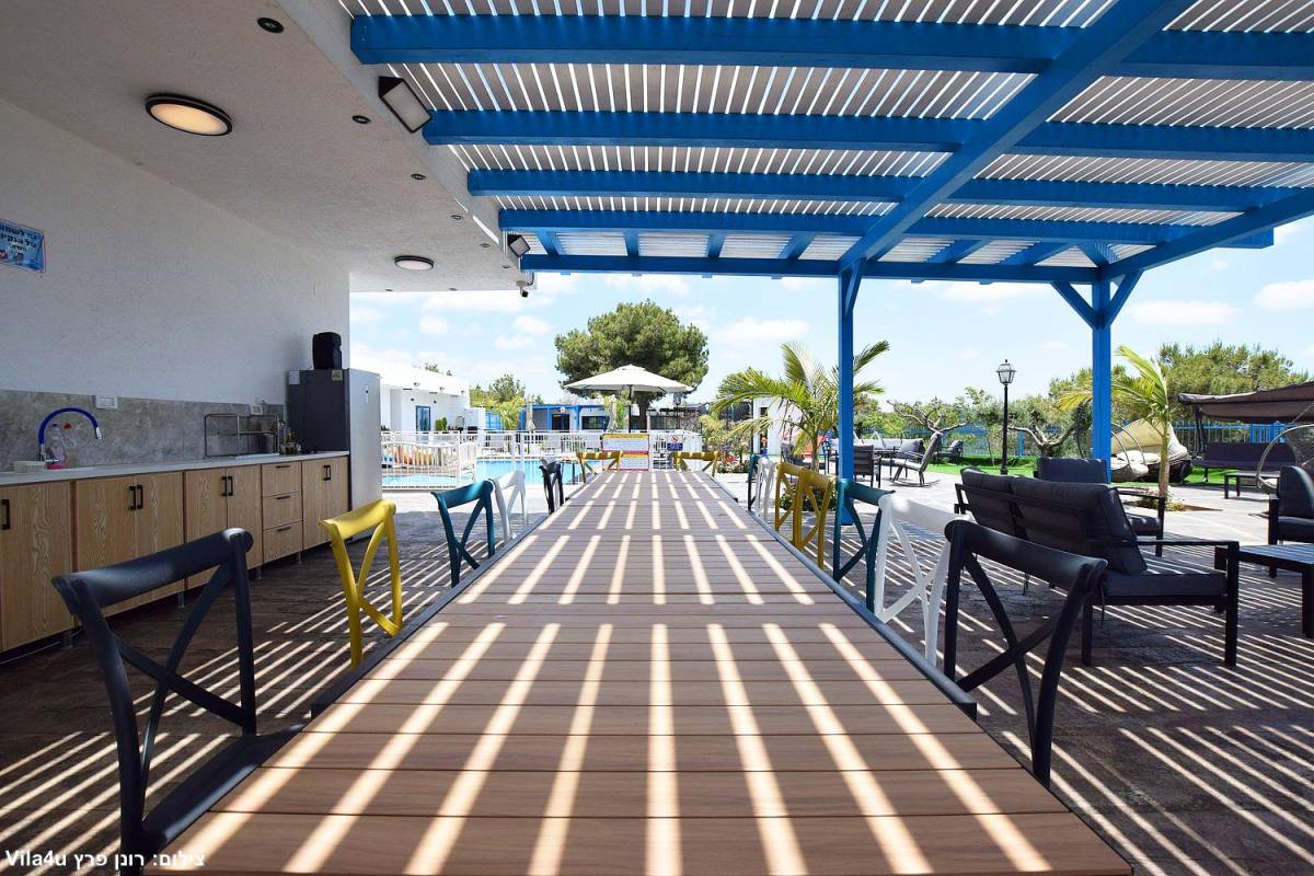 מטבח חוץ מקורה הכולל משטח עבודה, מקרר, כיור ופינת אוכל גדולה