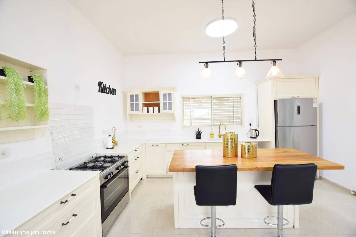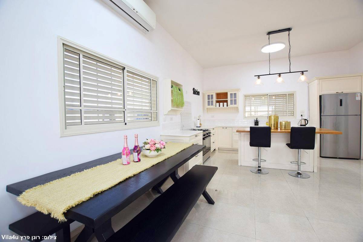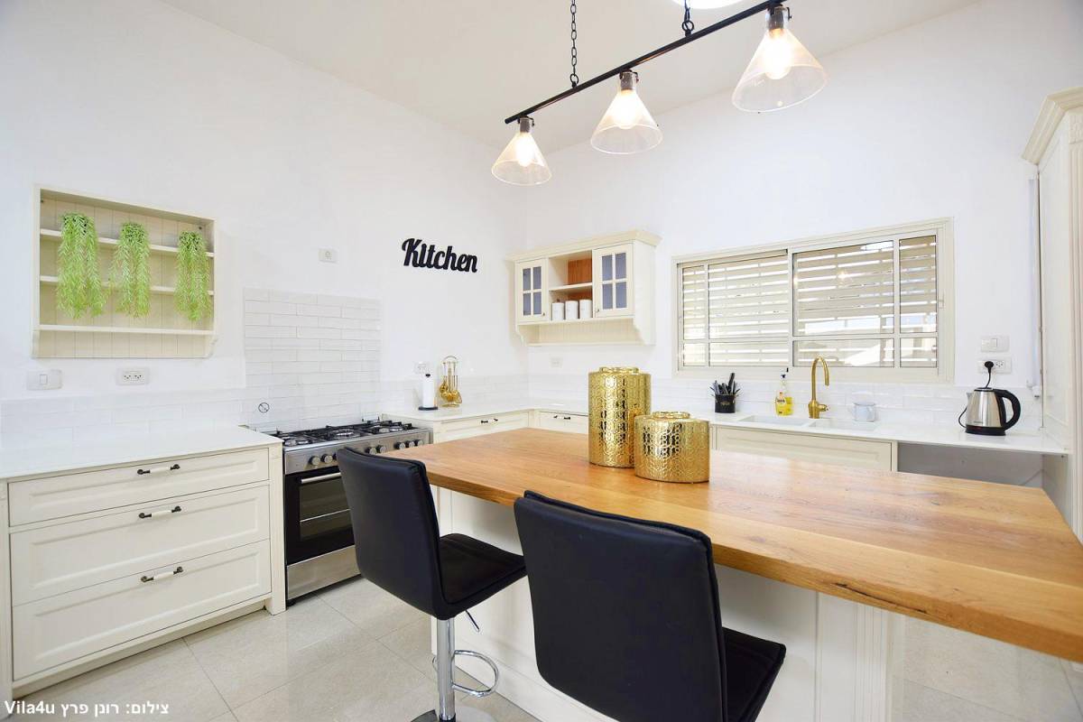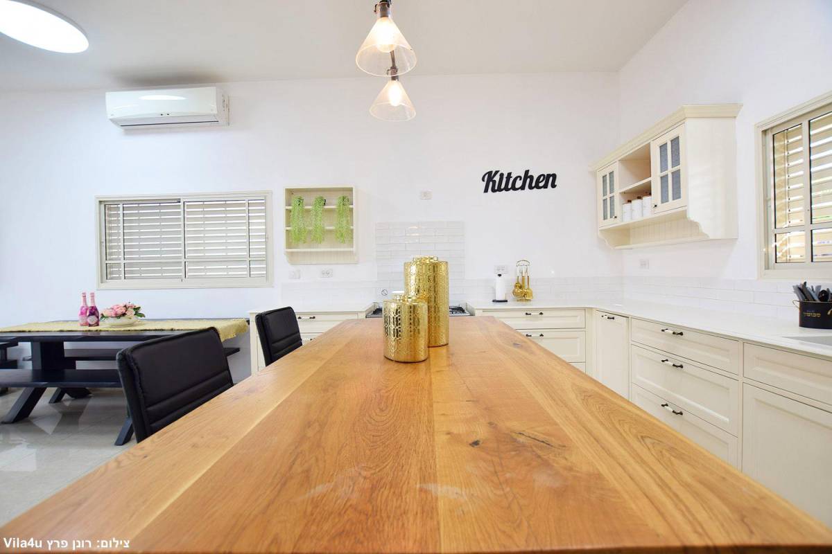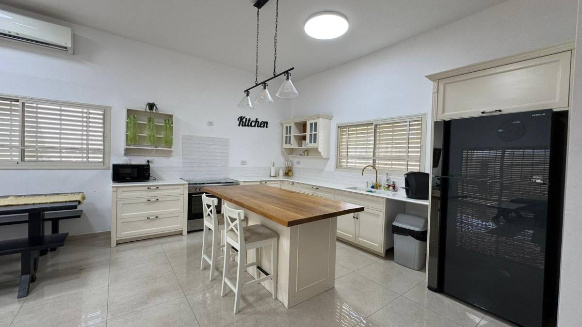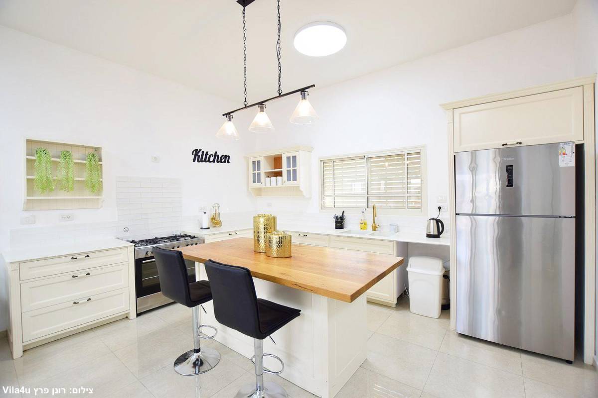 מקרר, מקפיא, תנור, מיקרוגל, כיריים גז, קומקום חשמלי, כלי אוכל והגשה, תמי 4, כיור בשרי חלבי, פינת קפה.