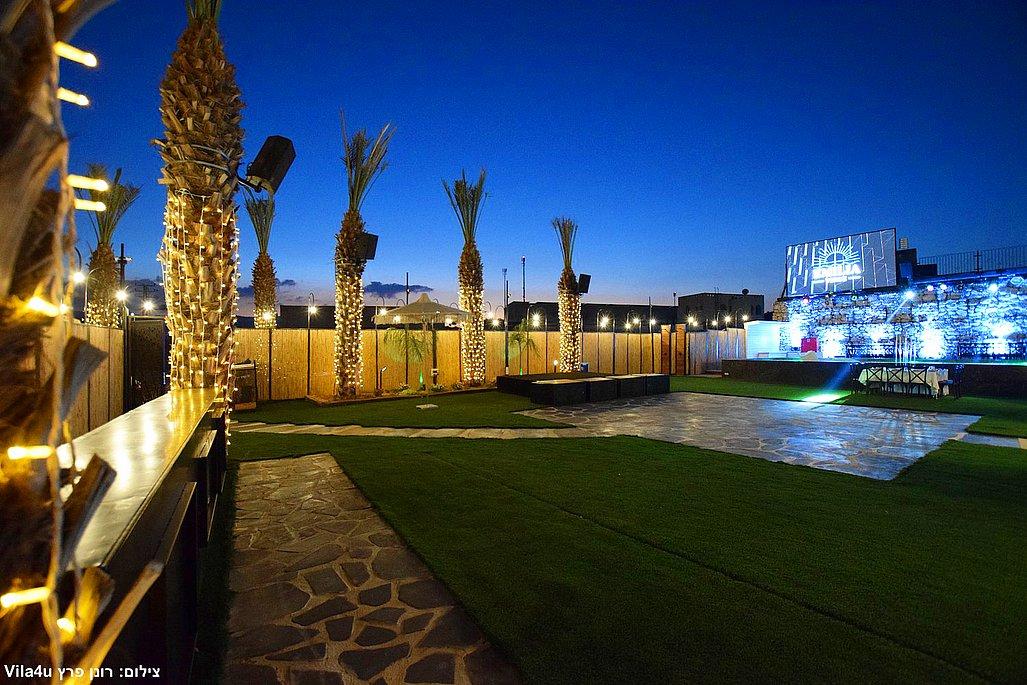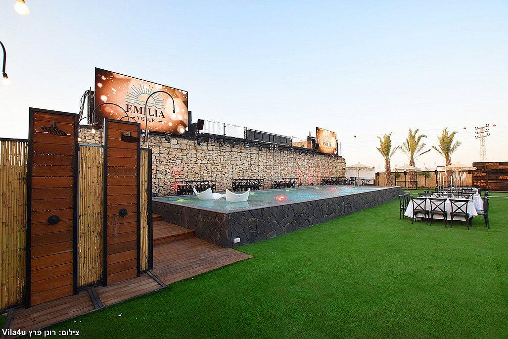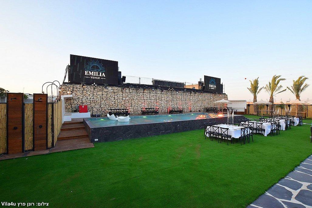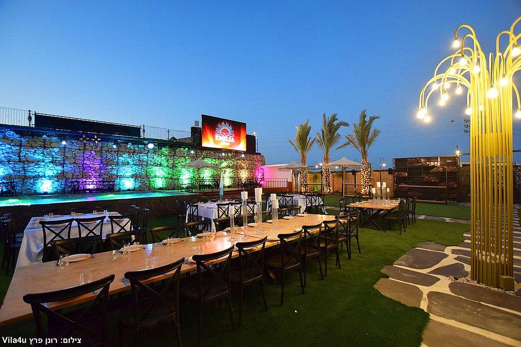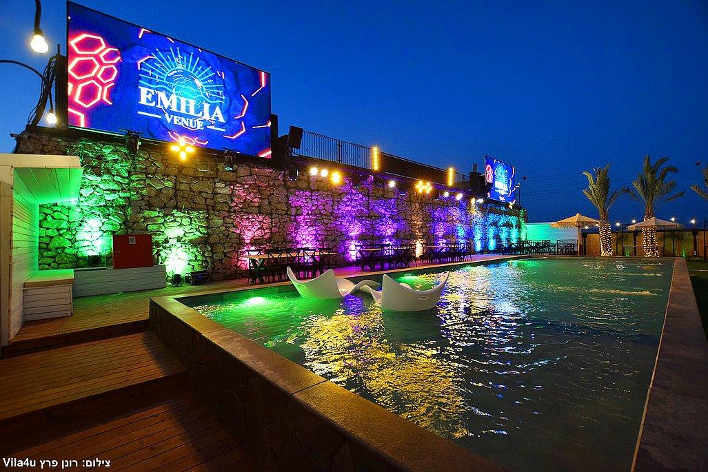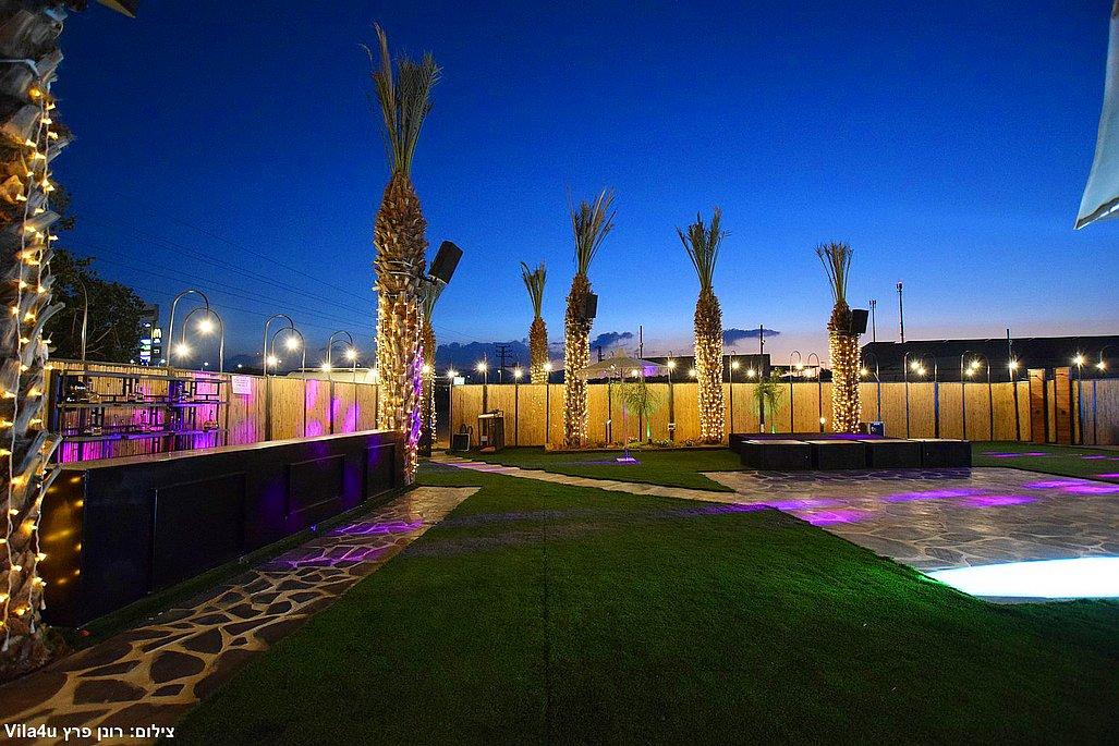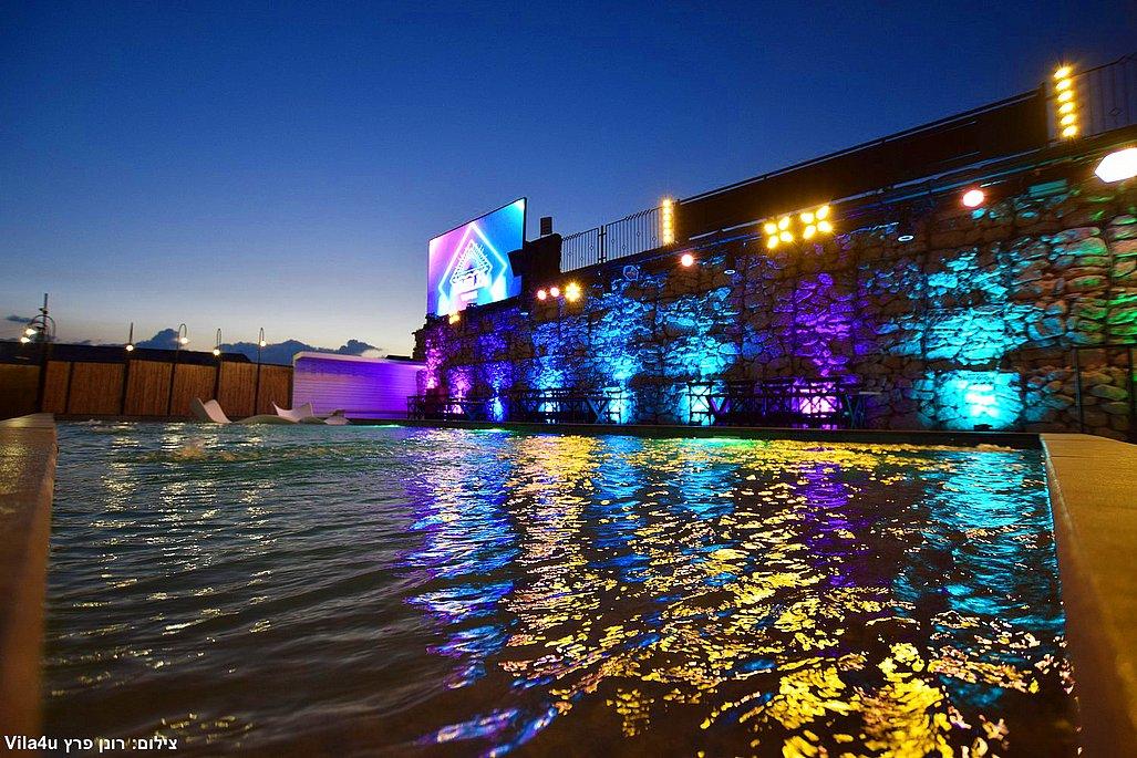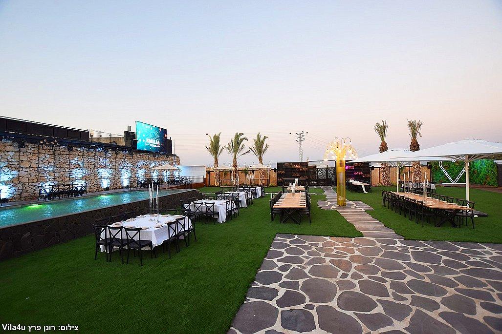 במתחם תיהנו מבריכת שחייה ענקית בגודל 5×15 מטר, מסכי ענק מרשימים, עמדת DJ מקצועית עם במה, פינות ישיבה מעוצבות, מטבח חוץ מאובזר, בר חיצוני מפואר ופינת סלפי מדליקה שתשאיר מזכרות נוצצות מהאירוע.