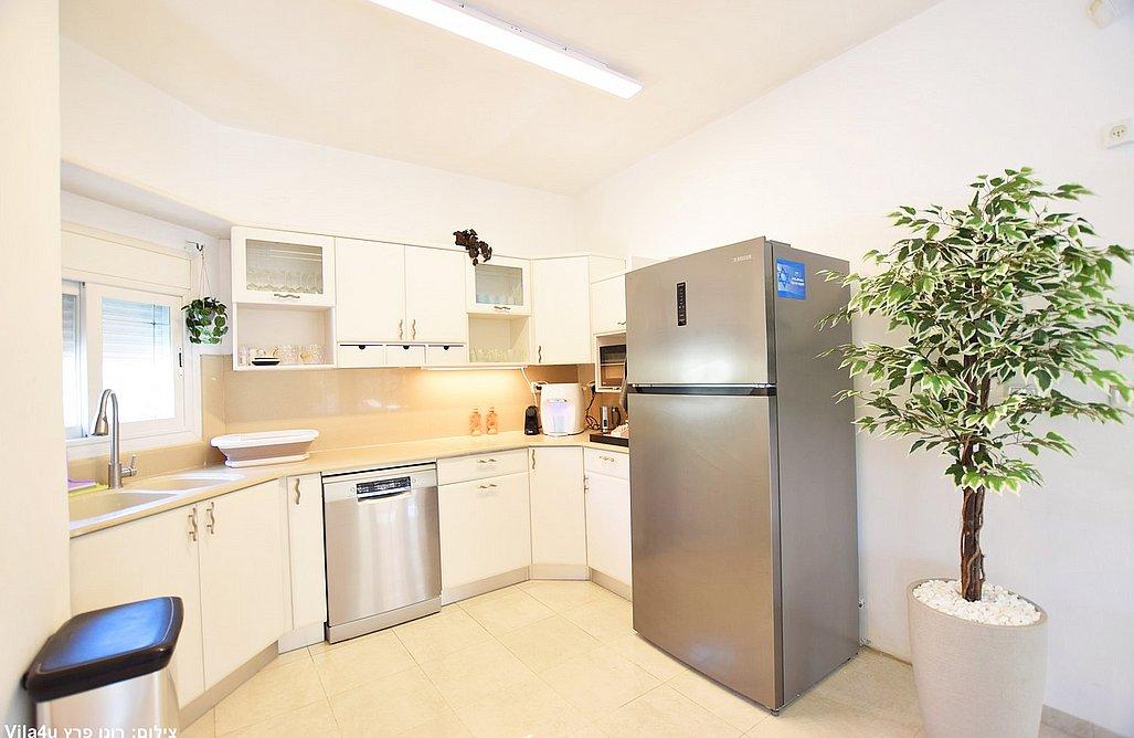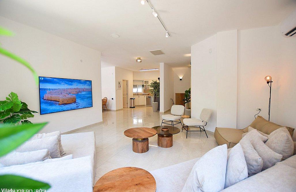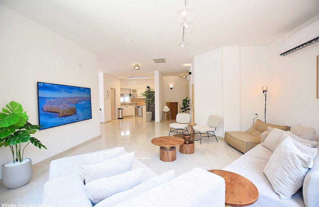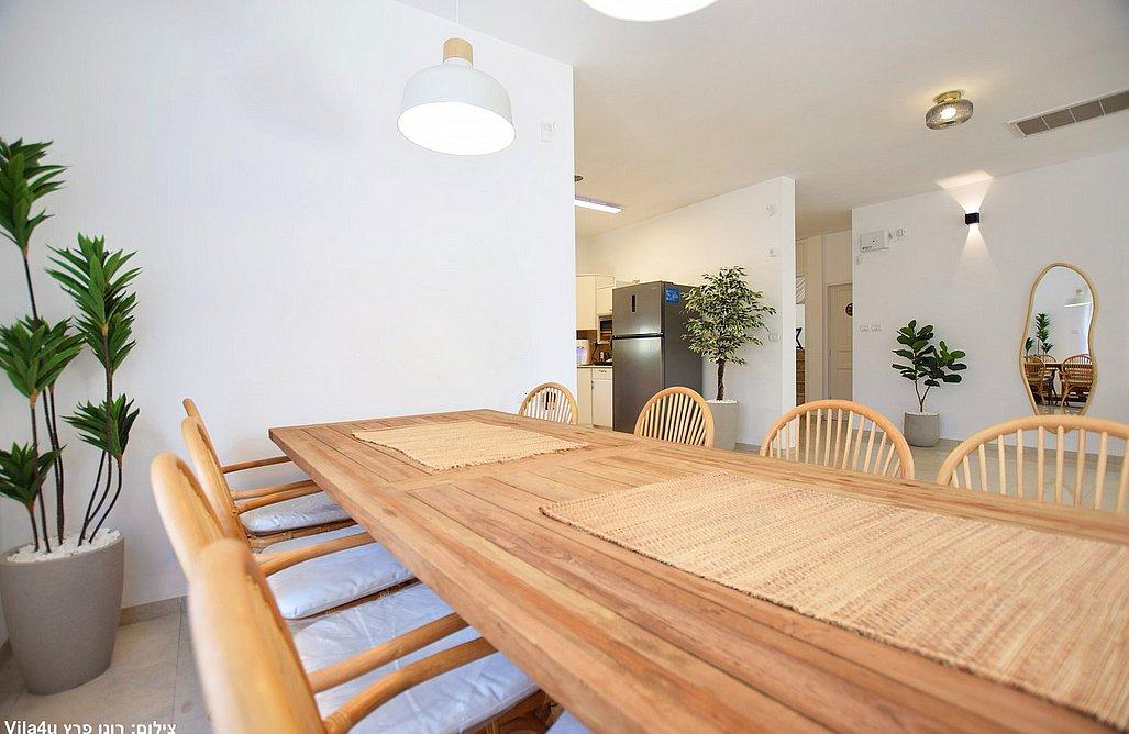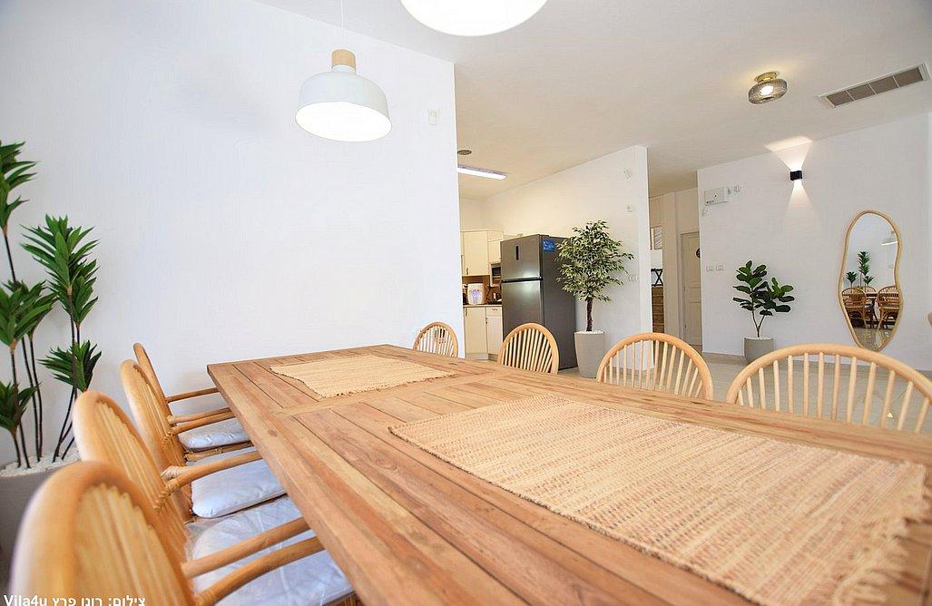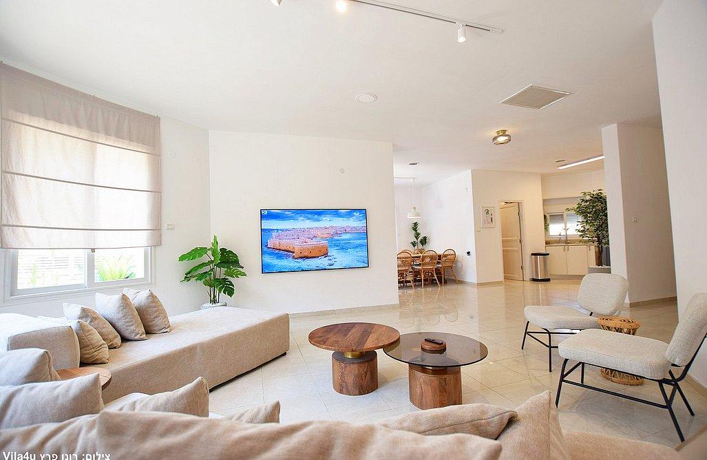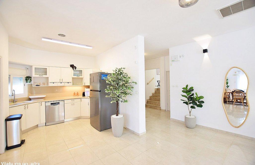 הווילה כוללת סלון מרווח עם טלוויזיה בגודל 75 אינץ' וחיבור לפרי טיוי, פינת אוכל גדולה ומטבח מאובזר הכולל: מקרר, מיקרוגל, תנור, מדיח, כיריים גז, מכונת קפה, בר מים, מקציף חלב, כלי אוכל, 3 פלטות ומיחם.