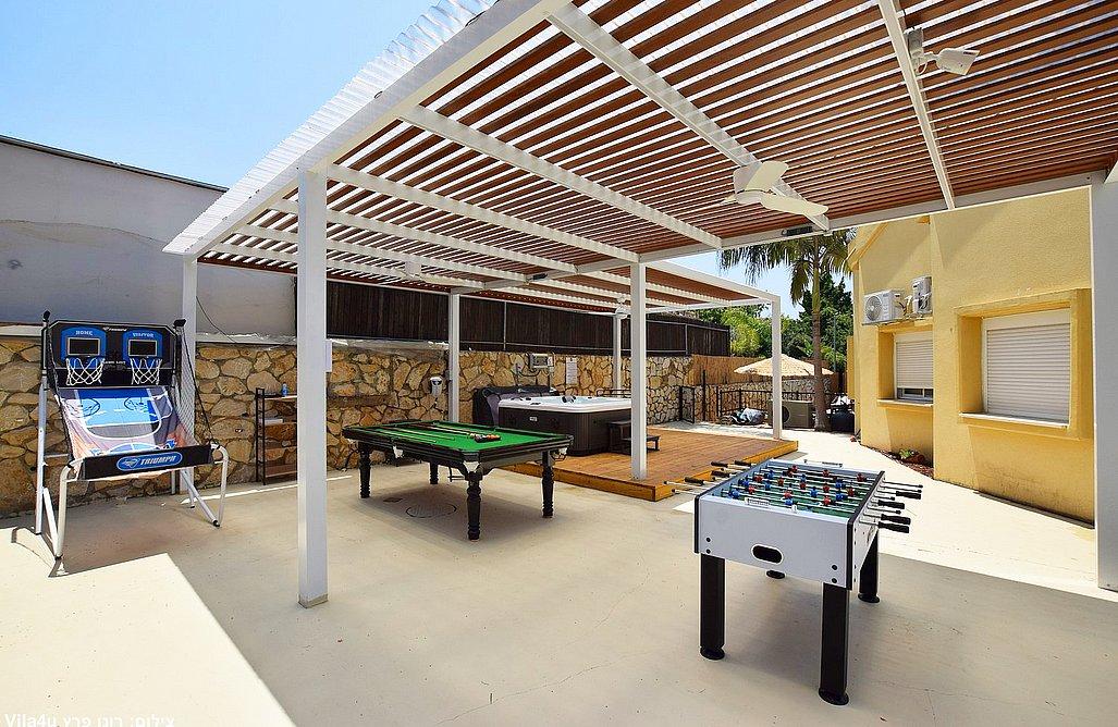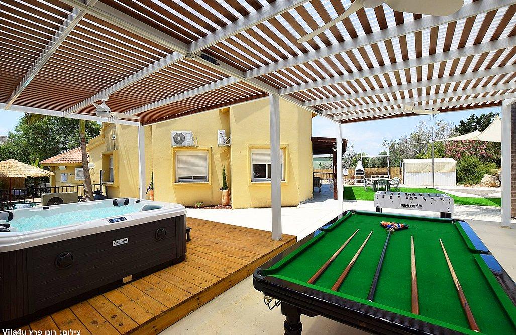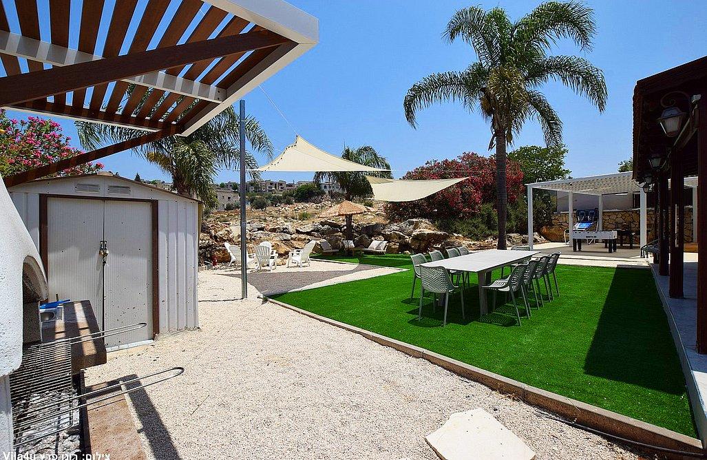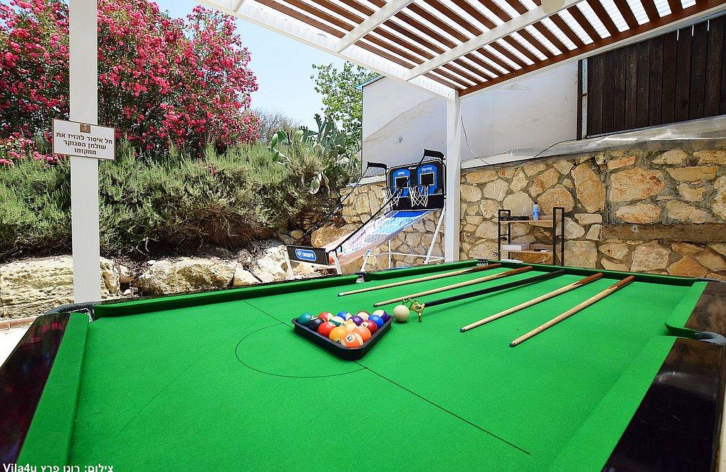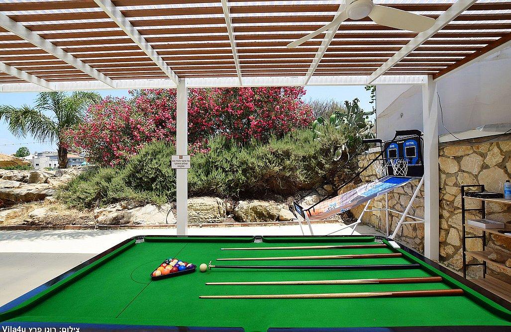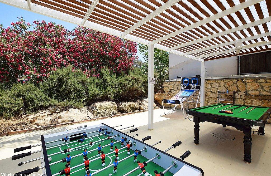 בריכה בגודל 3x7 מטר, ג'קוזי ספא, מדשאות רחבות, פינת מנגל עם עמדת עבודה, פינות ישיבה, שולחן אוכל, משחקי שולחן (סנוקר, כדורגל, הוקי אוויר, כדורסל), פינת מדורה, ציליות ותאורה לילית.