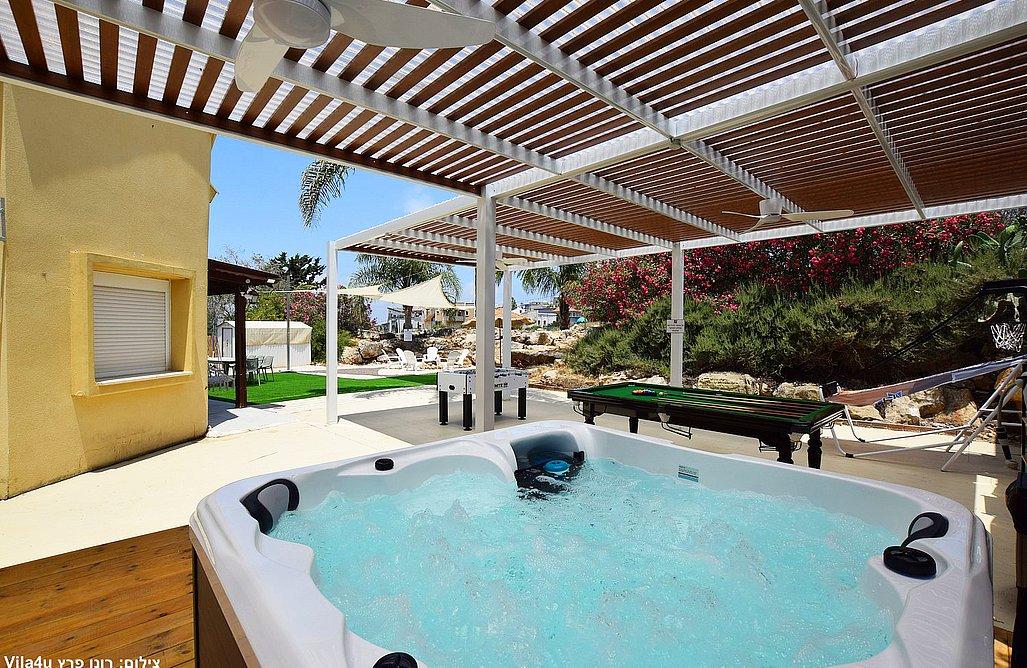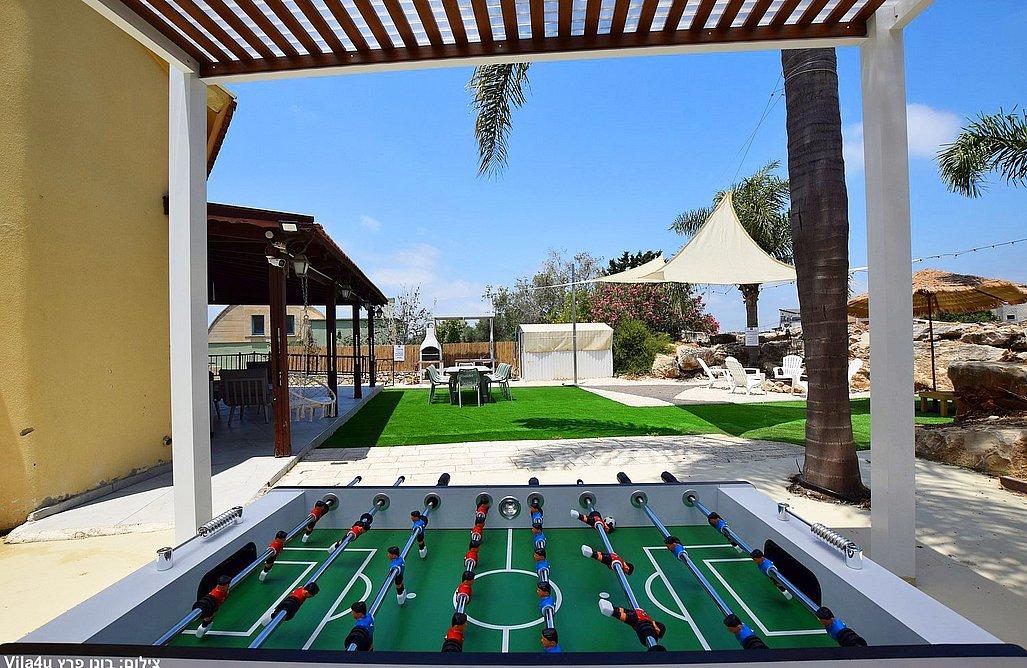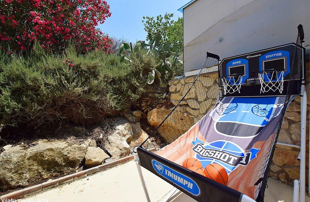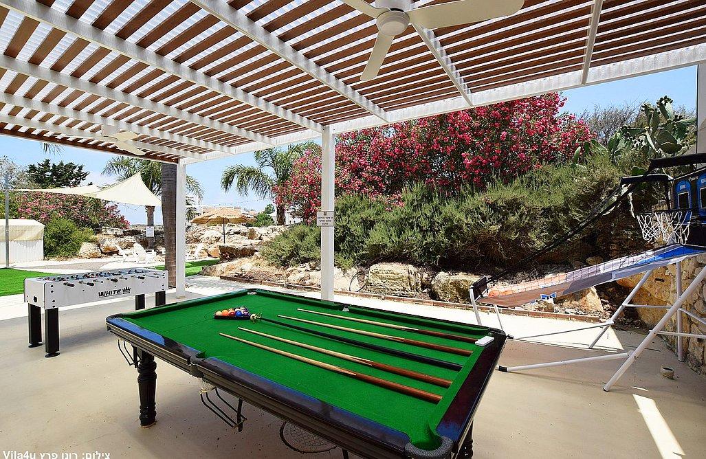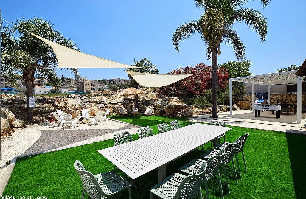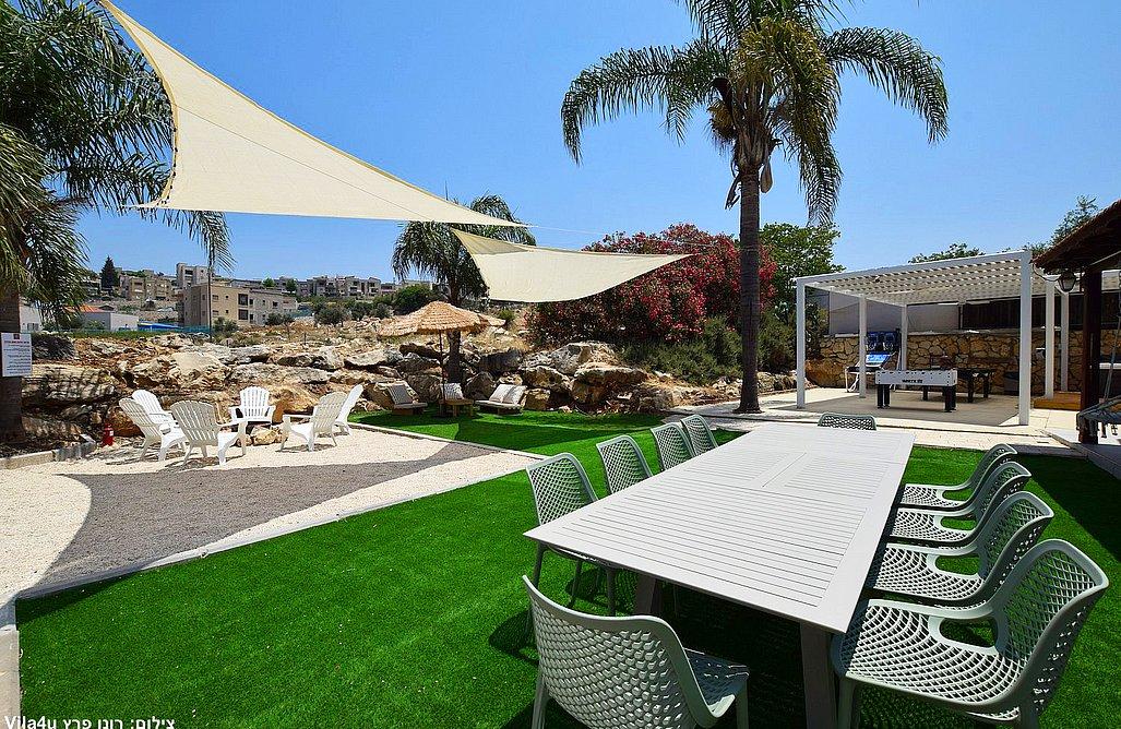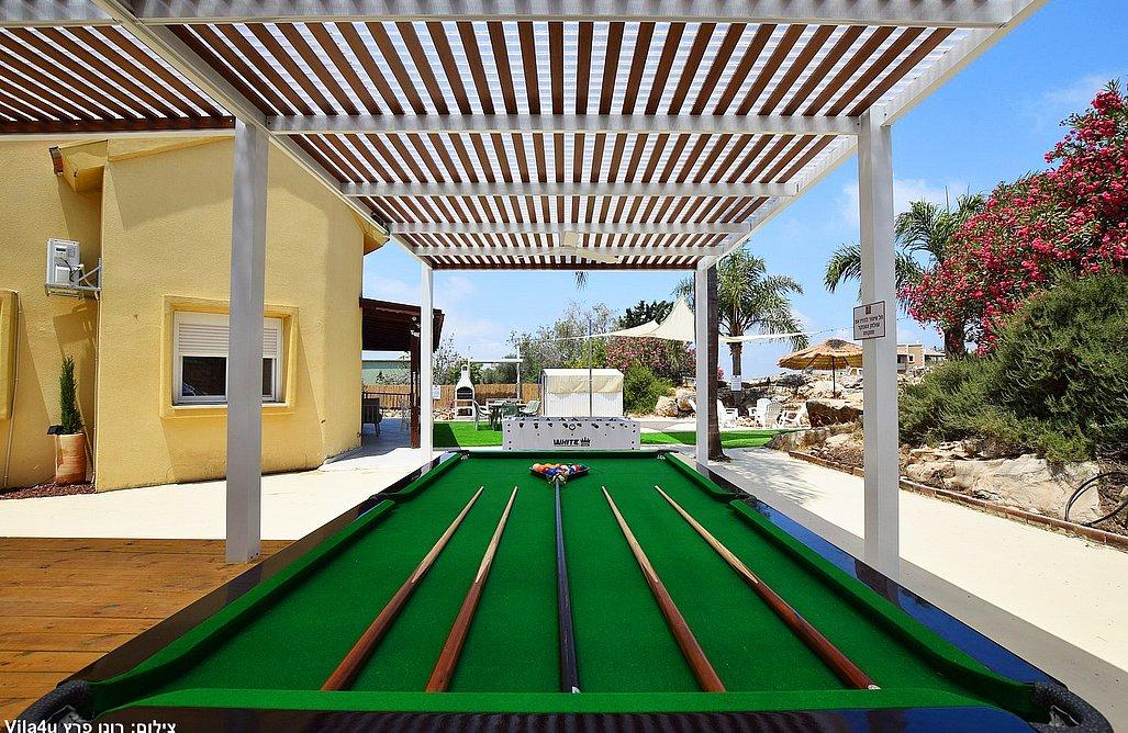 בריכה בגודל 3x7 מטר, ג'קוזי ספא, מדשאות רחבות, פינת מנגל עם עמדת עבודה, פינות ישיבה, שולחן אוכל, משחקי שולחן (סנוקר, כדורגל, הוקי אוויר, כדורסל), פינת מדורה, ציליות ותאורה לילית.