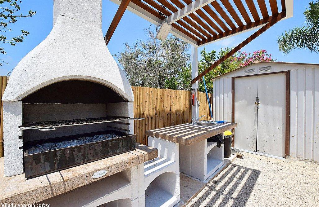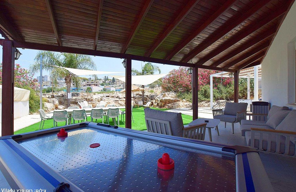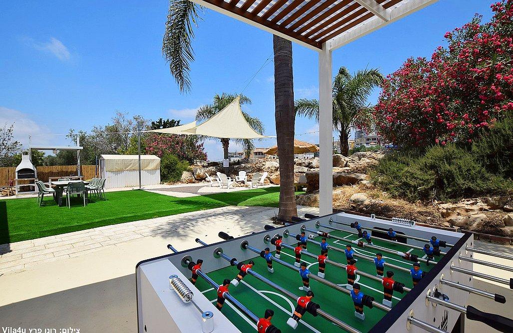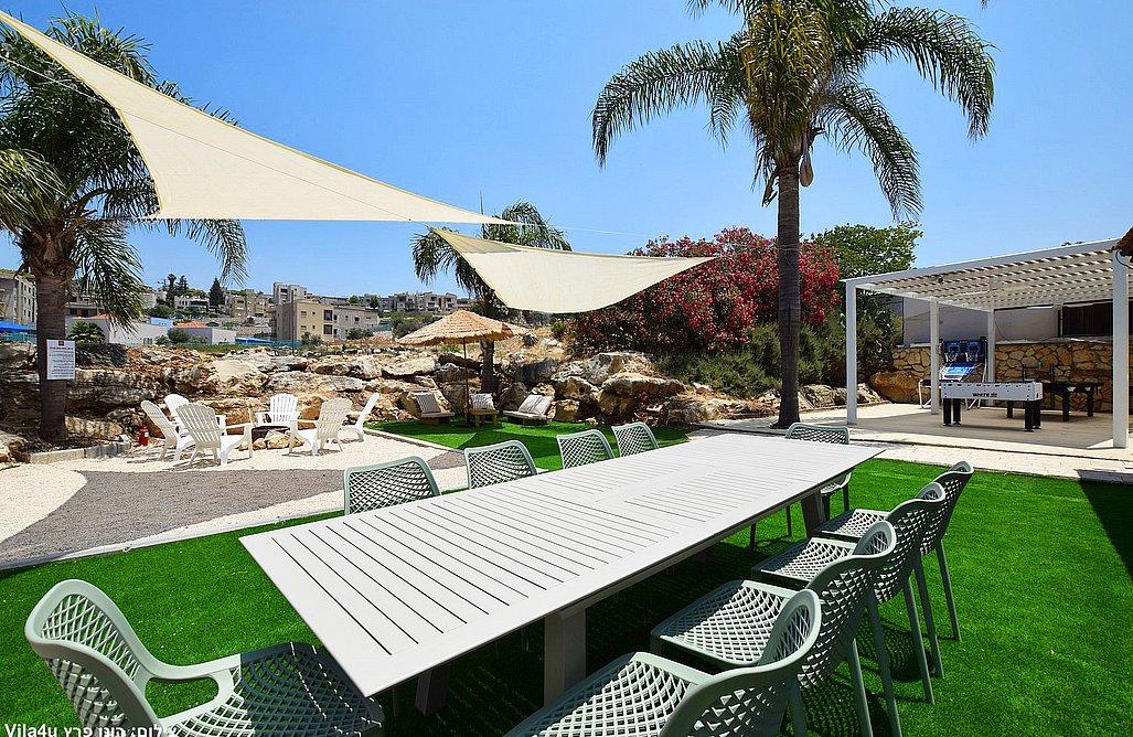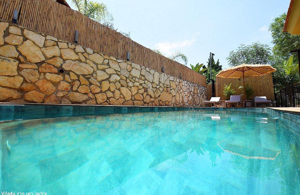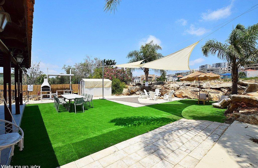 בריכה בגודל 3x7 מטר, ג'קוזי ספא, מדשאות רחבות, פינת מנגל עם עמדת עבודה, פינות ישיבה, שולחן אוכל, משחקי שולחן (סנוקר, כדורגל, הוקי אוויר, כדורסל), פינת מדורה, ציליות ותאורה לילית.