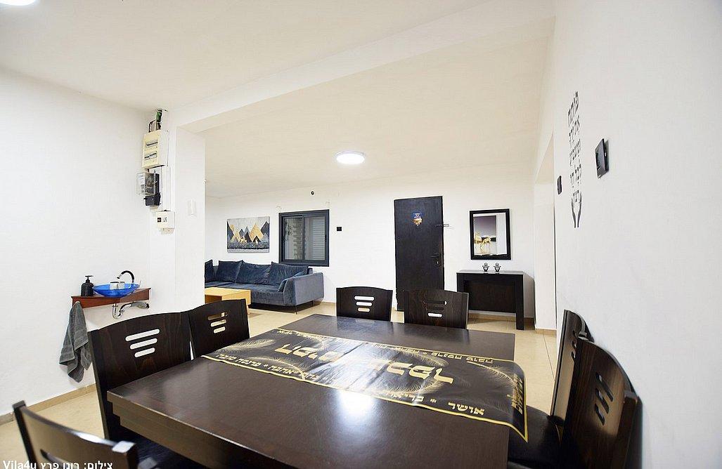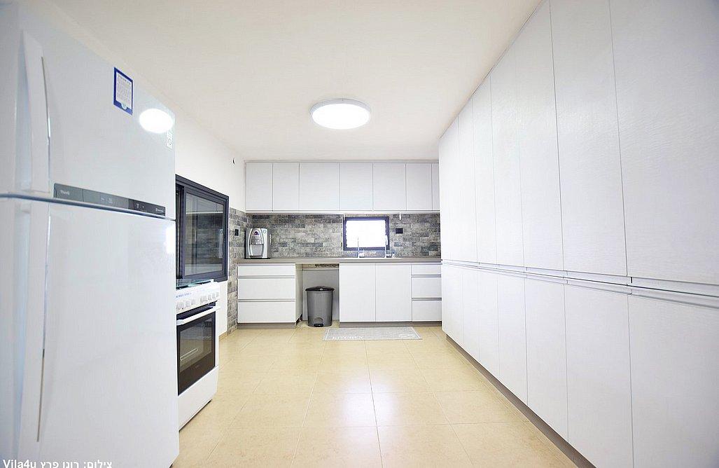 מטבח מאובזר (מקרר גדול, תנור אפייה, מיקרוגל, מדיח כלים, כיריים גז, 2 כיורים, פלטות, מיחם, כלי אוכל והגשה.)