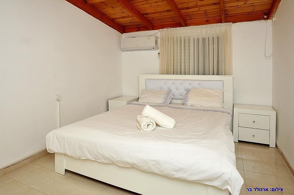 חדר שינה ובו מיטה זוגית וגדולה עם מזגן ומסך טלוויזיה.