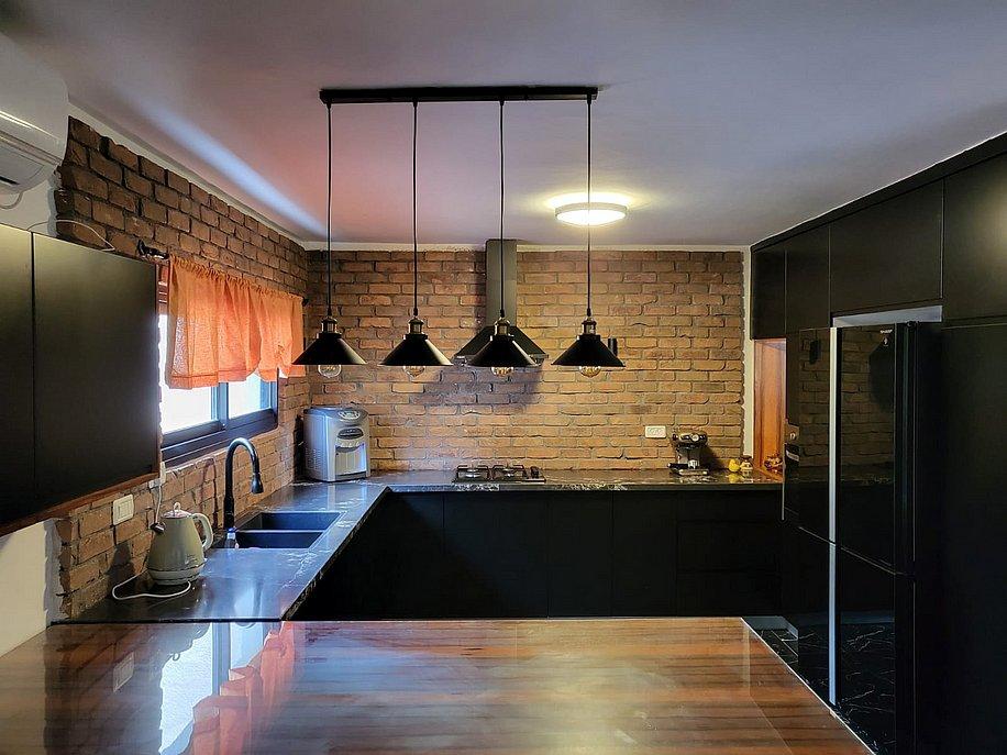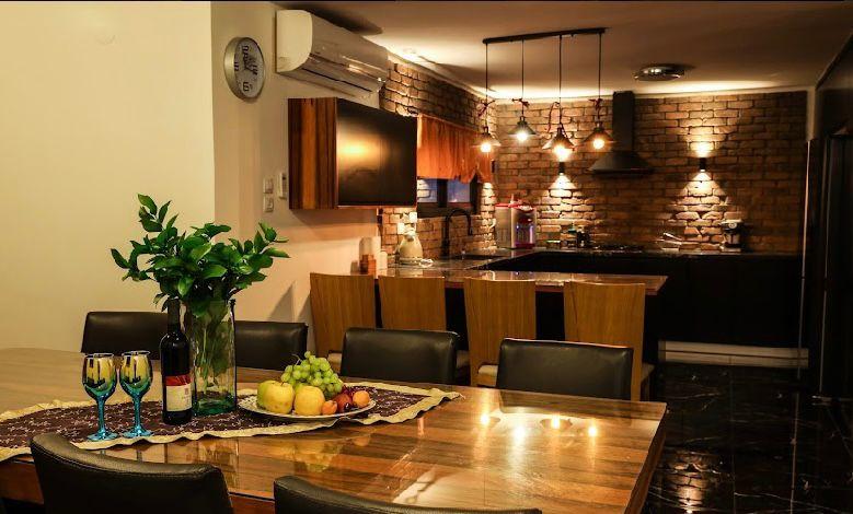 מטבח מאובזר ובו יש מקרר, מיקרוגל, כלי הגשה ובישול, כירים, בר מים ותנור אפייה