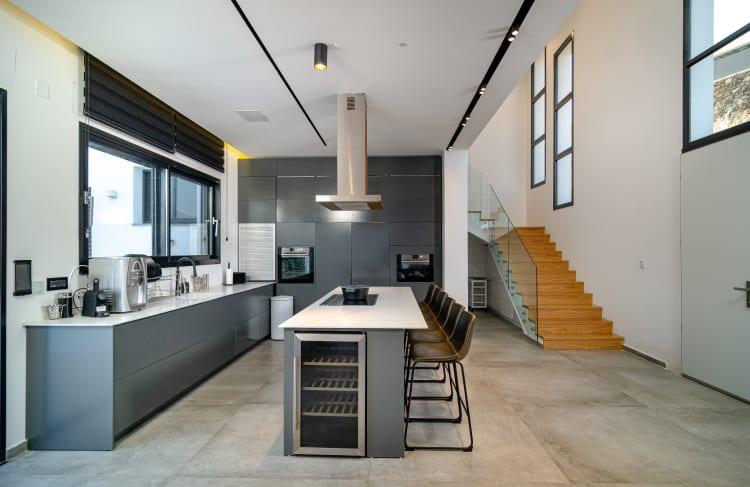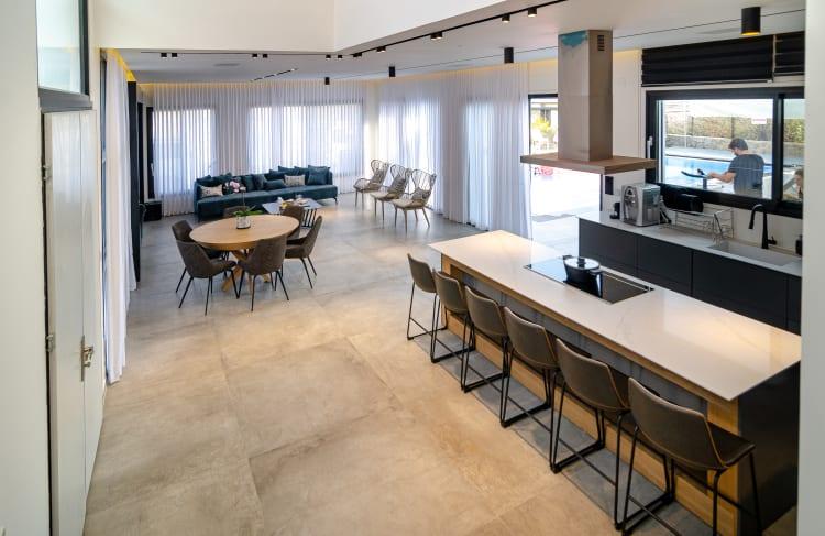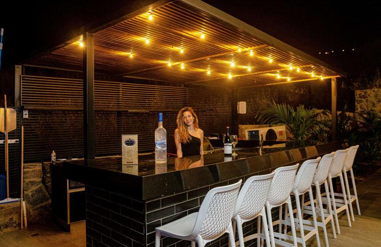 מטבח חיצוני ובו: בר גדול, מנגל, טאבון ומקרר