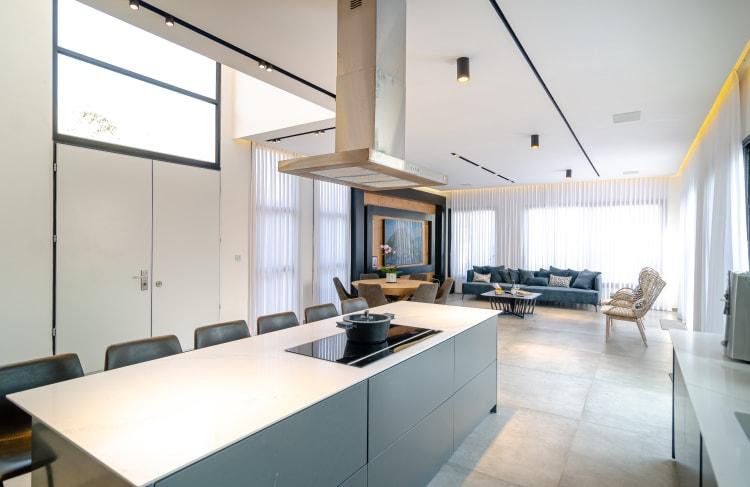 מטבח מאובזר הכולל מקרר גדול, תנור אפייה, כיריים, מיקרוגל, מכונת אספרסו, מיני בר מים, כלי אוכל והגשה