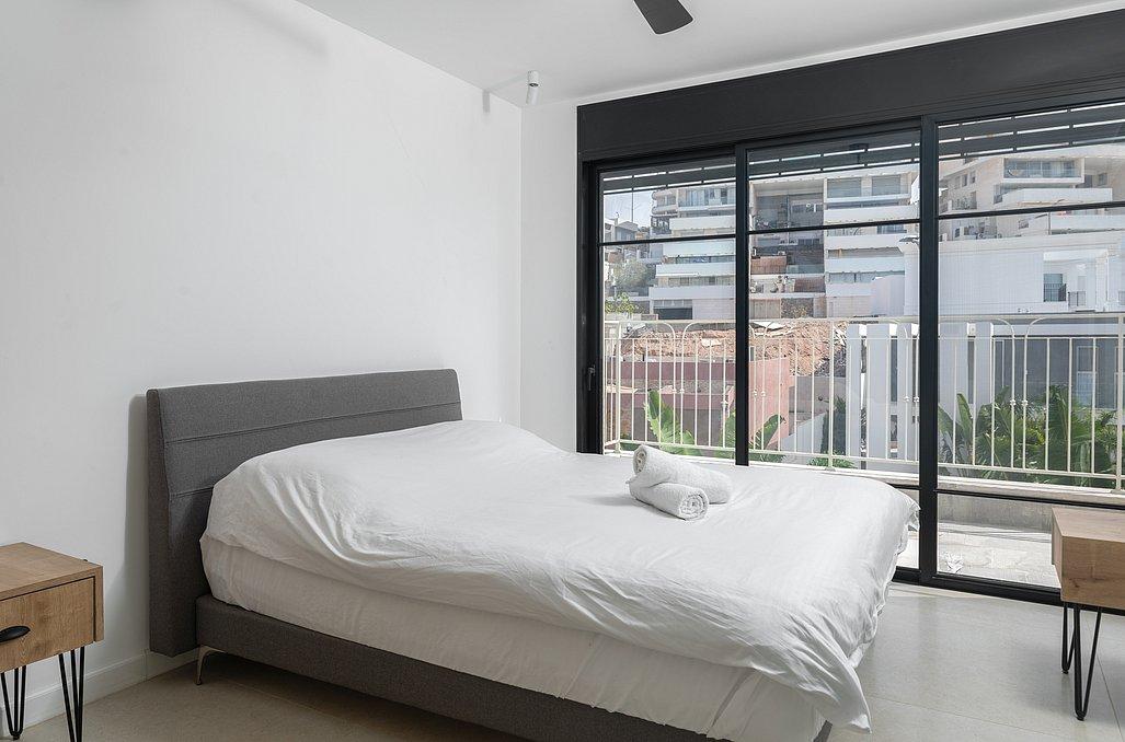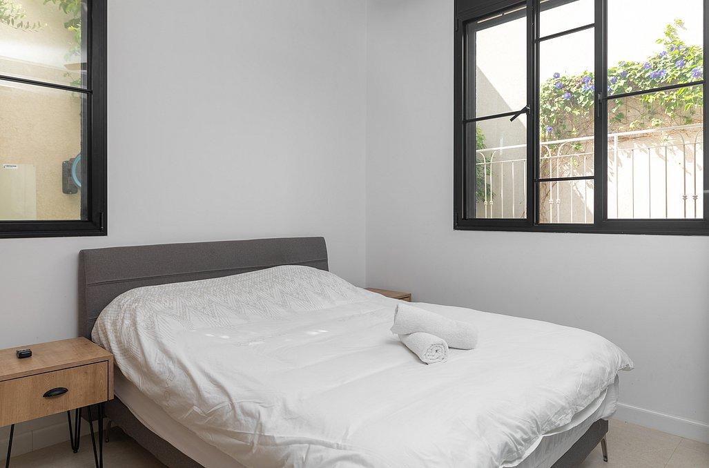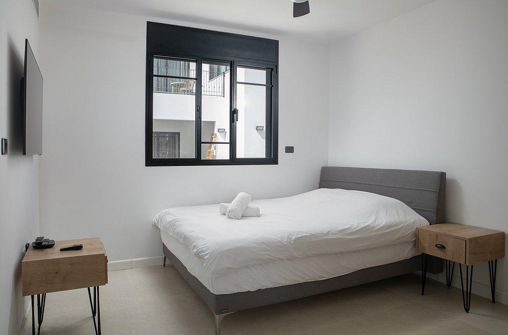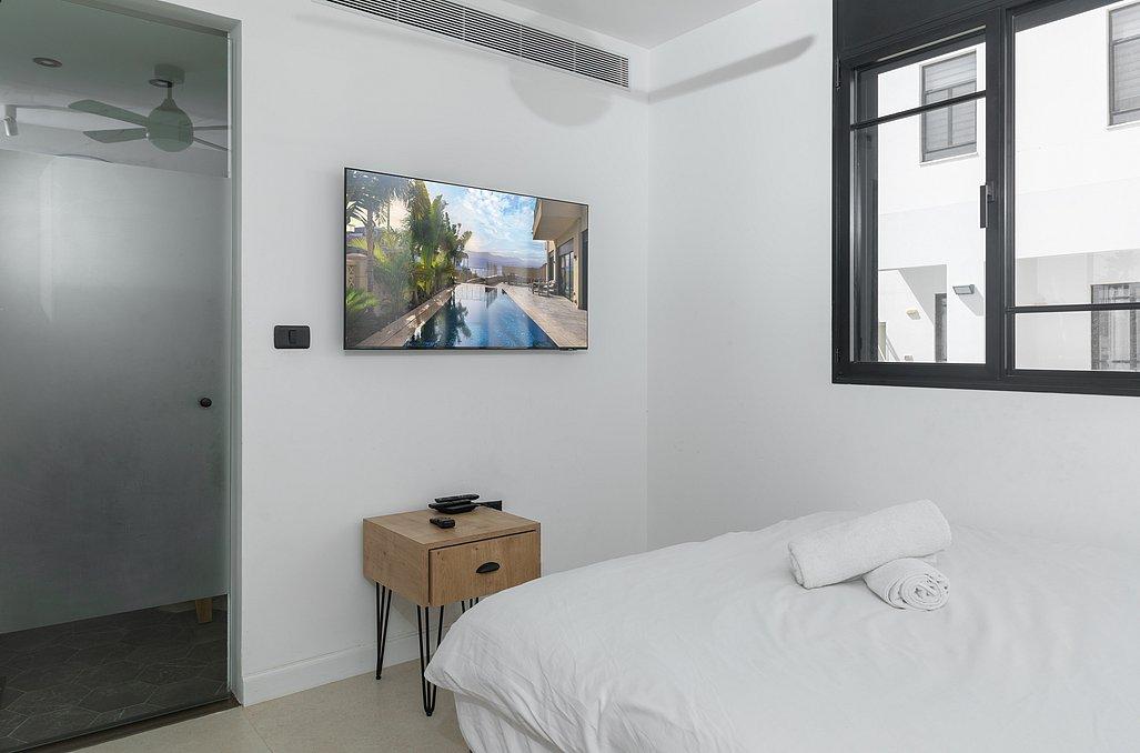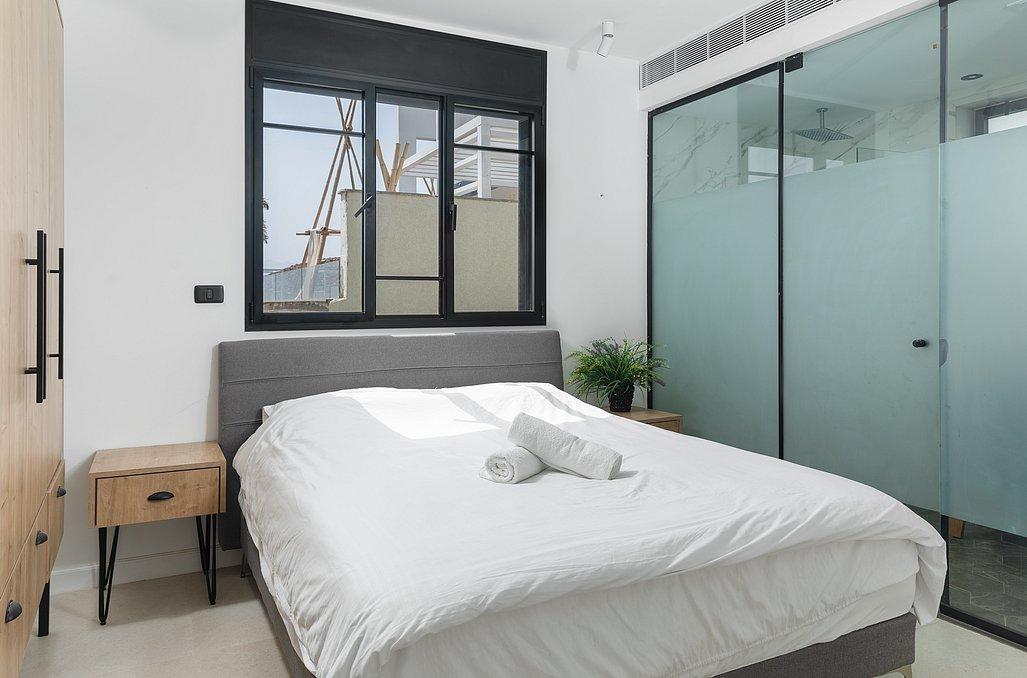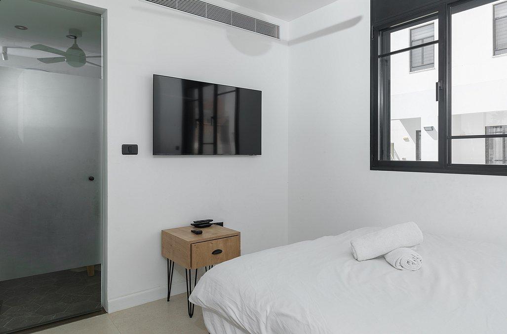מיטה זוגית עם מצעים, מזגן, טלוויזיה, שידת אחסון וחדר רחצה פרטי
