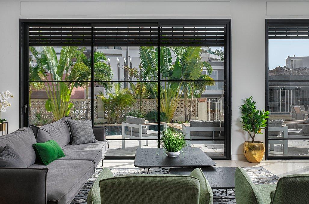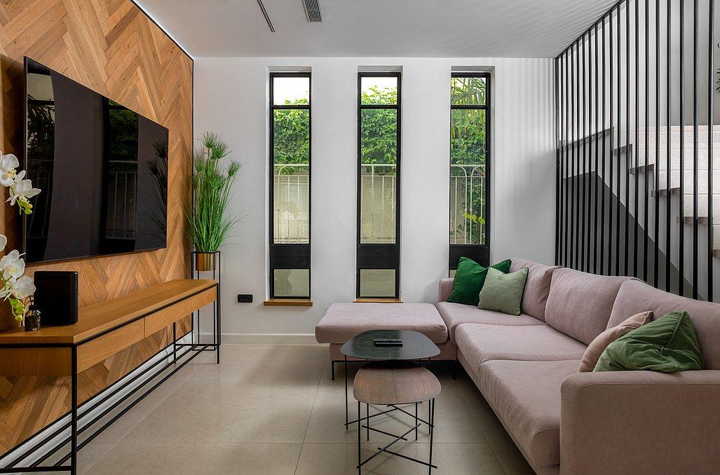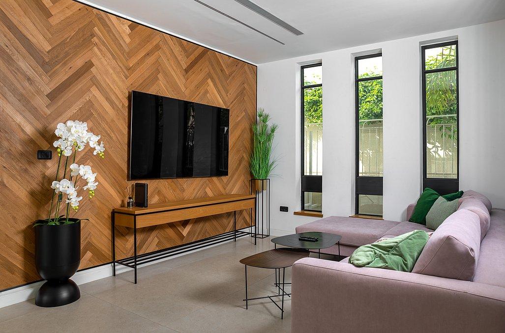 סלון מרווח עם מערכת ישיבה ומולה טלוויזיה.
