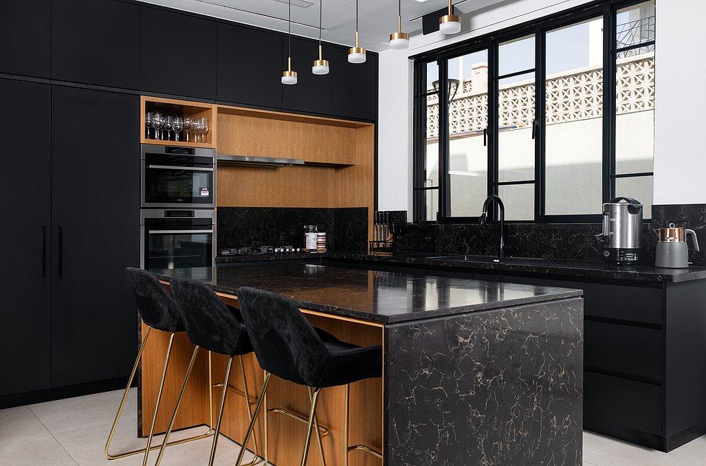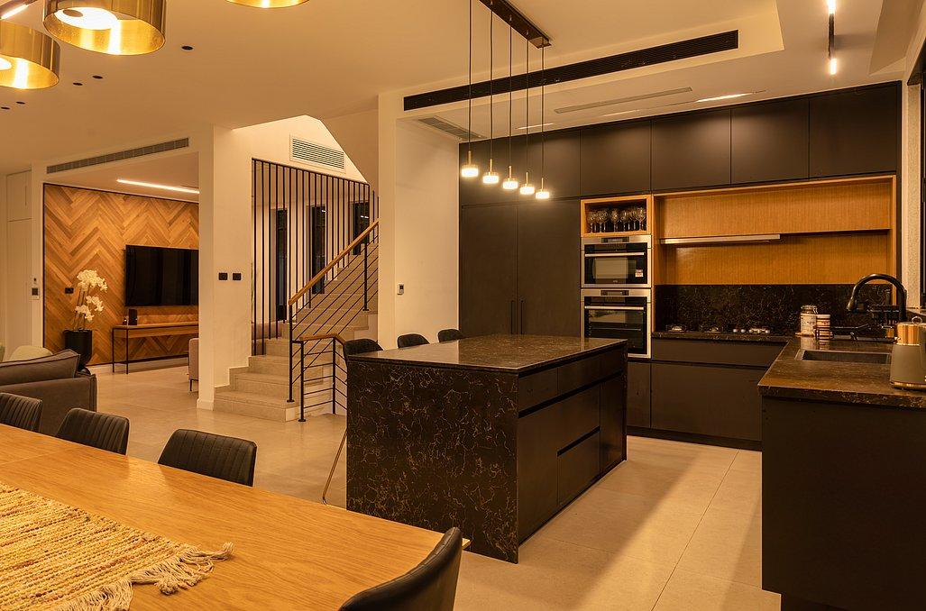 מטבח מעוצב ומאובזר הכולל מקרר גדול, תנור אפייה, כיריים גז, קומקום חשמלי,