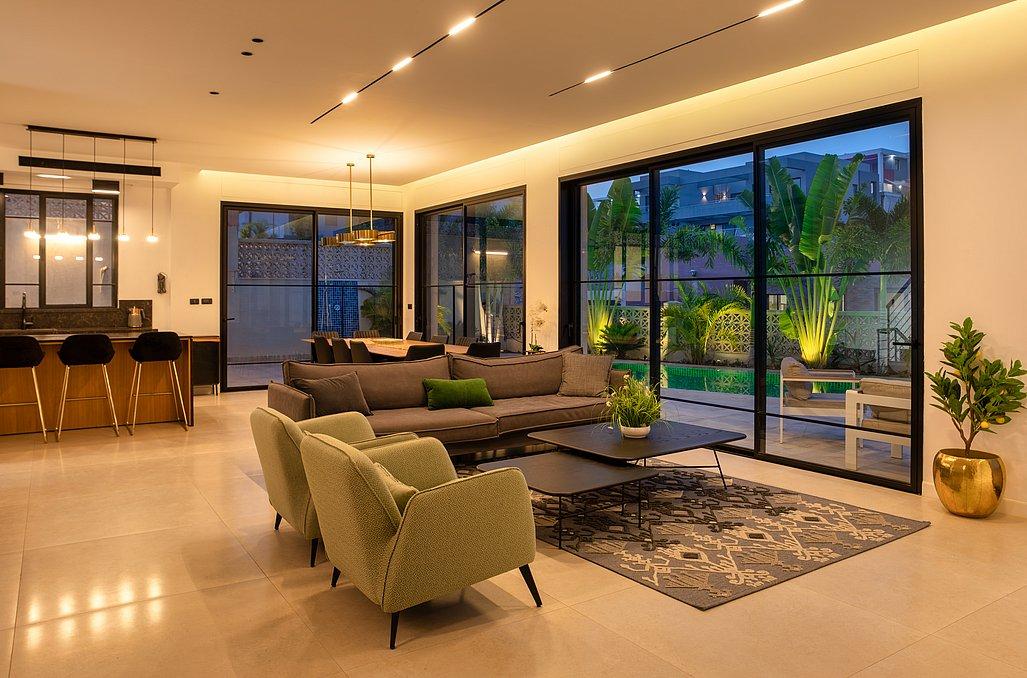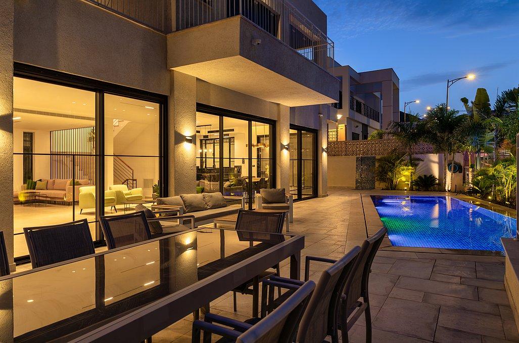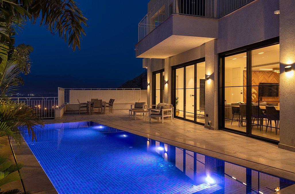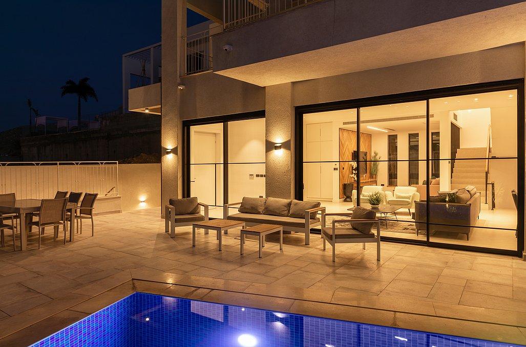 הוילה כוללת 8 חדרים מתוכם 2 חדרי מאסטר כאשר לכל אחד חדר רחצה ומטבחון פרטיים, מתחם חוץ עם נוף הצופה לים, בריכת שחייה, עמדת מנגל ועוד.