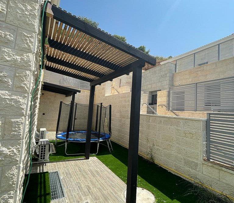 יציאה למרפסת הכוללת טרמפולינה לילדים ומגוון עצי פרי