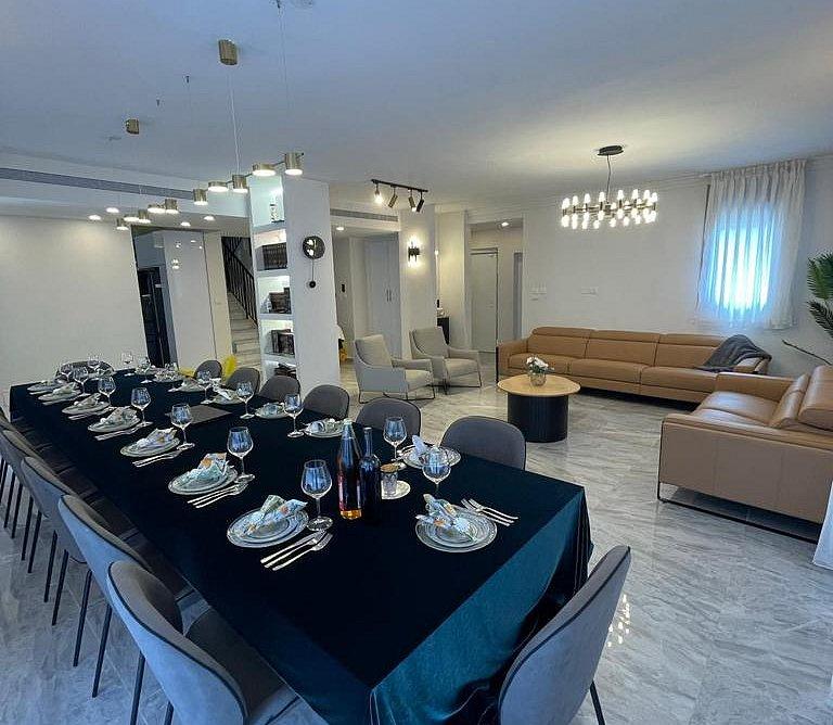 מטבח מאובזר ובו: מקרר, 2 תנורים, כירים גז וכיריים חשמליות, מדיח כלים ומיני בר, פלטה ומיחם לשבת.