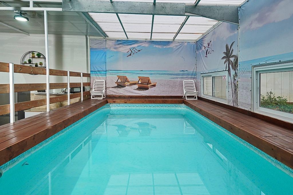- בריכת שחייה צלולה בחיפוי עץ מחוממת מקורה