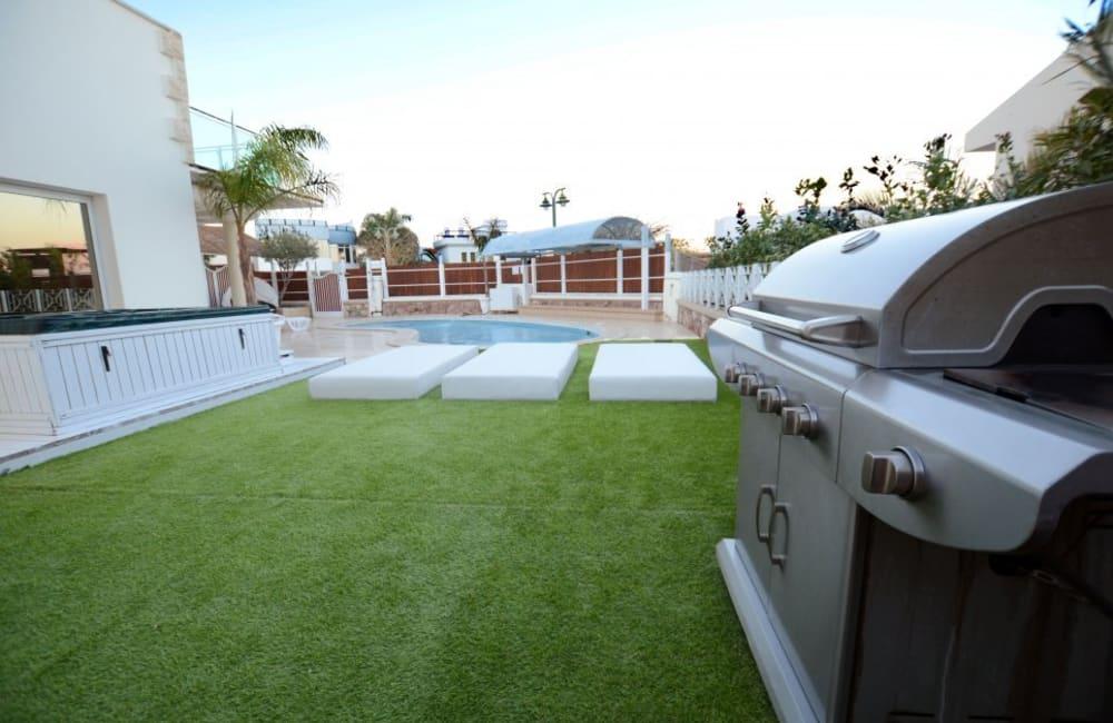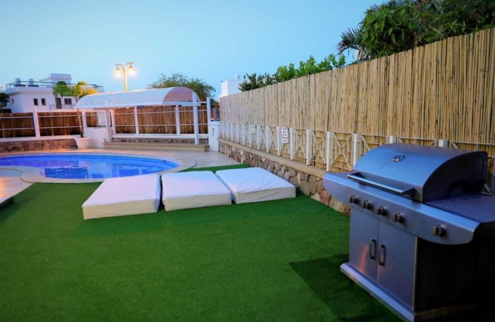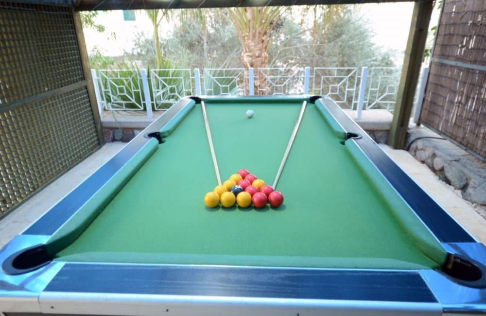 מתחם חיצוני: בריכת שחייה מחוממת בטיחותית ומגודרת בגודל 12 על 4 ומקלחון חיצוני, ג'קוזי ספא גדול, שולחן סנוקר מקצועי, פינת ברביקיו איכותית, פינת אוכל מוצלת , מיטות שיזוף  מעוצבות, תאורת גן וכורסאות נוחות
