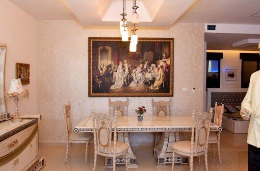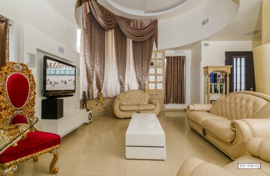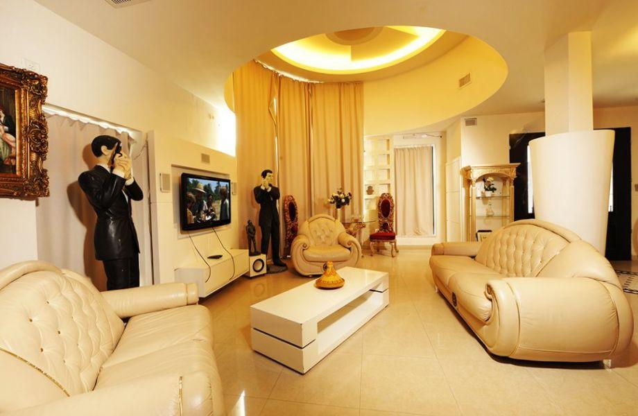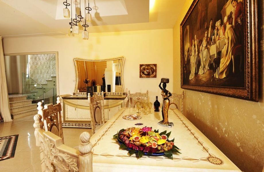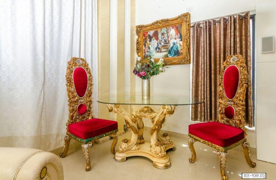 קומת ביניים כוללת: סלון יוקרתי, שולחנות וכיסאות שיש איטלקי וחדר סוויטה מאובזר.