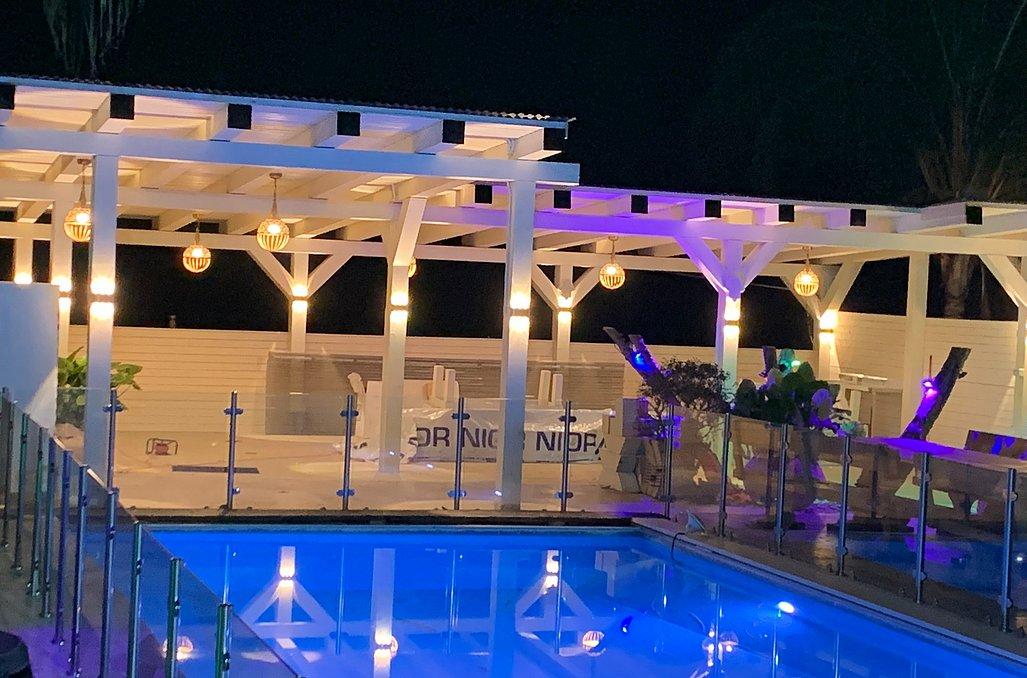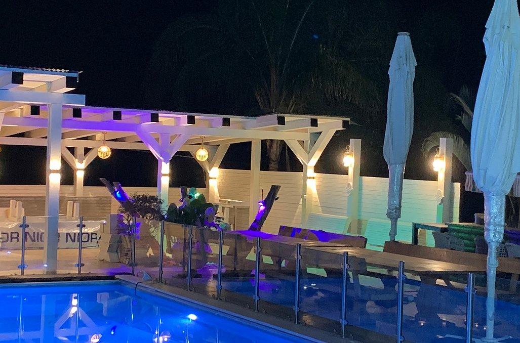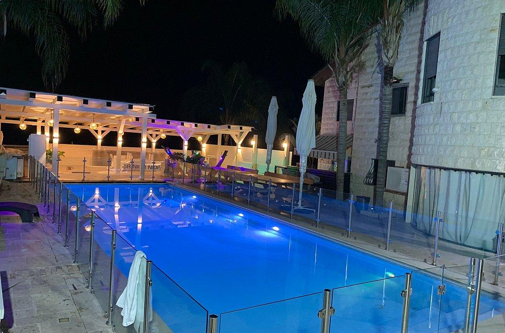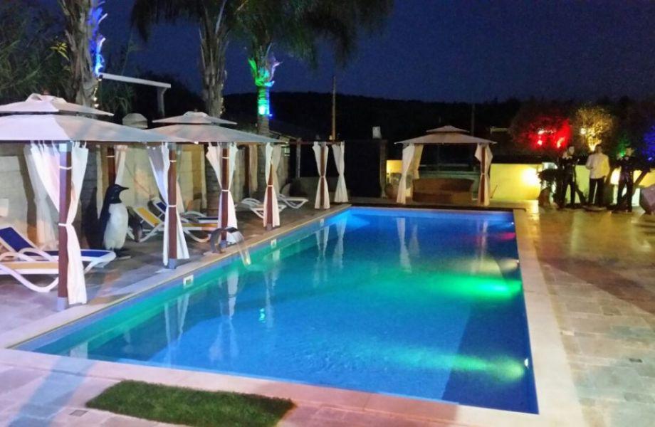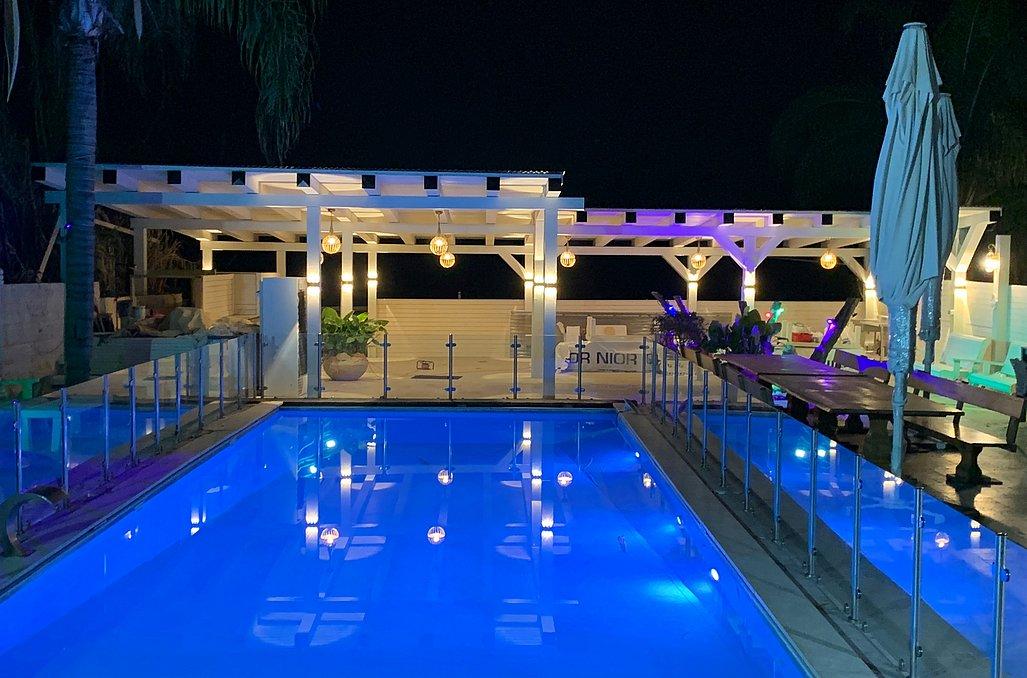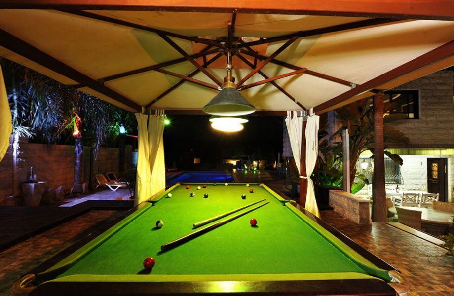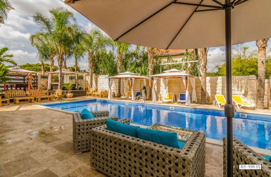 מתחם חיצוני: בריכת שחייה ענקית, מיטות שיזוף וכיסאות נוח, מקלחות (דוש) חיצוניות, 4 חדרי שירותים, ברביקיו מקצועי, שולחנות משחק- סנוקר ופינג פונג, מערכת שמע חיצונית, ג'קוזי ספא גדול, חצר מטופחת עצים, צמחייה ומדשאות.
