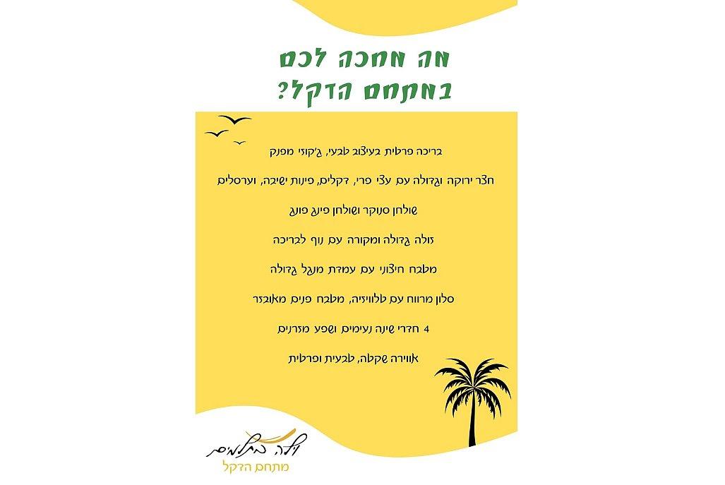 מתחם הדקל -  הכולל 4 חדרי שינה גדולים ומתוכם סוויטת הורים עם שירותים וחדר רחצה פרטי, מרפסת, אינטרנט אלחוטי חופשי, 2 חדרי שירותים, אמבטיה, DVD, מטבח מאובזר שיש בו כלים ומכשירי חשמל, טלוויזיית LCD מחוברת לכבלים, מערכת שמע מתקדמת ועוד.