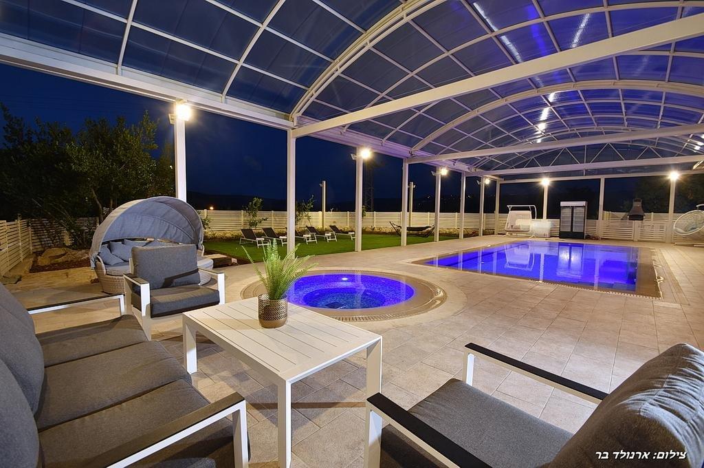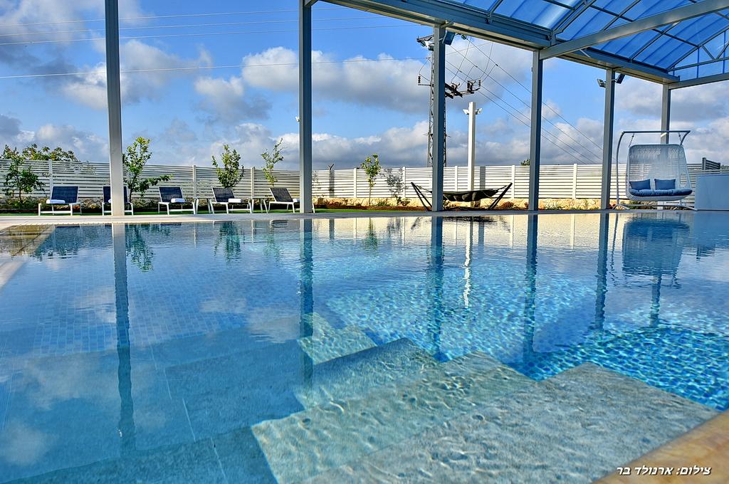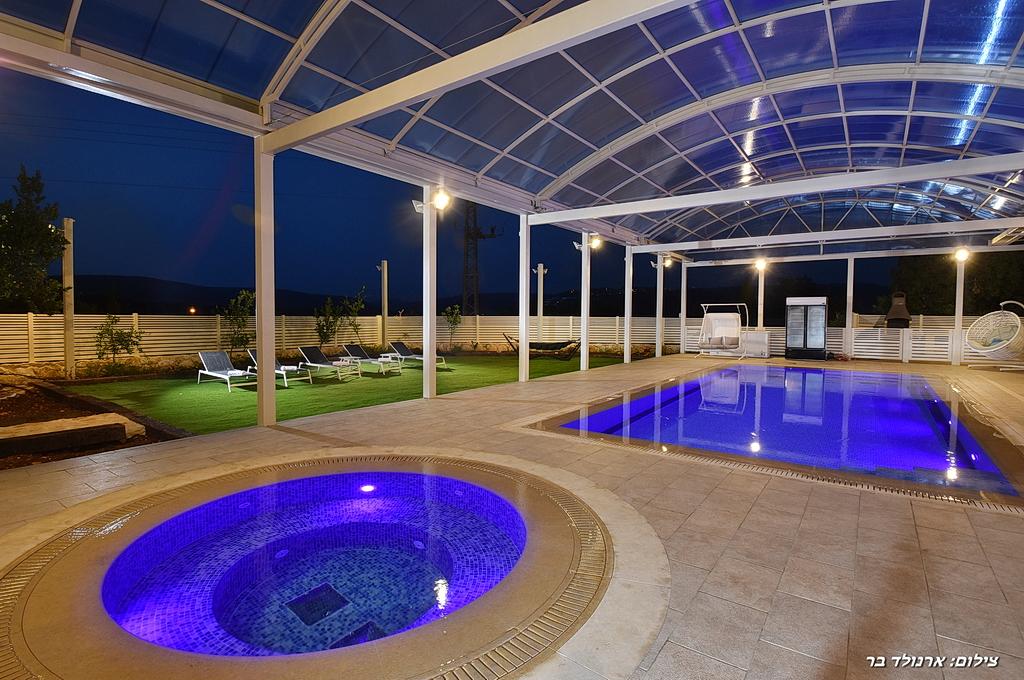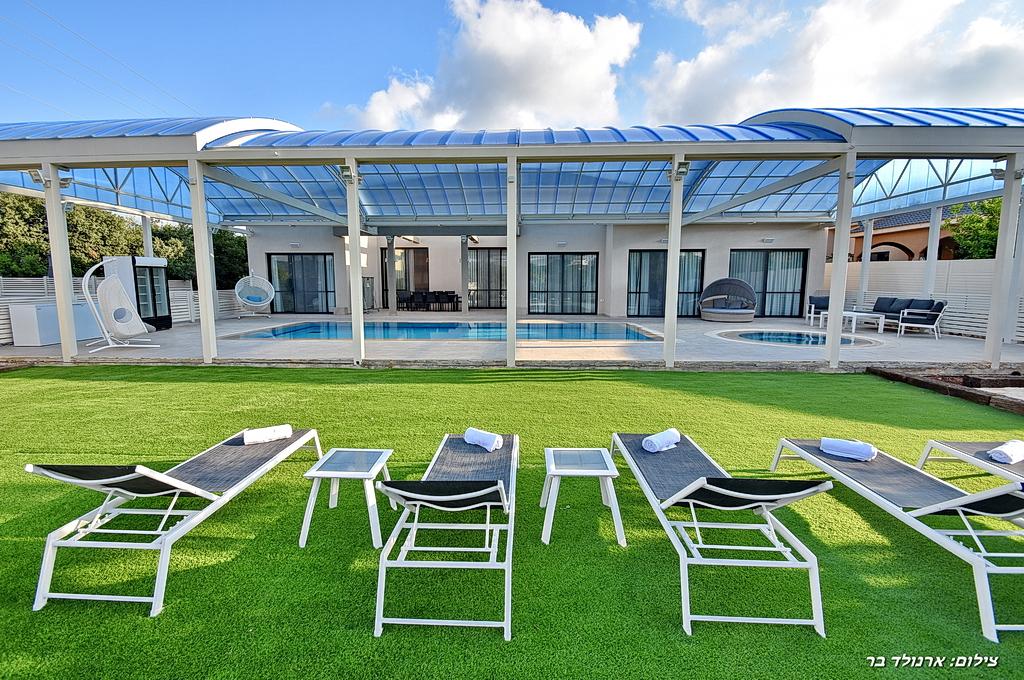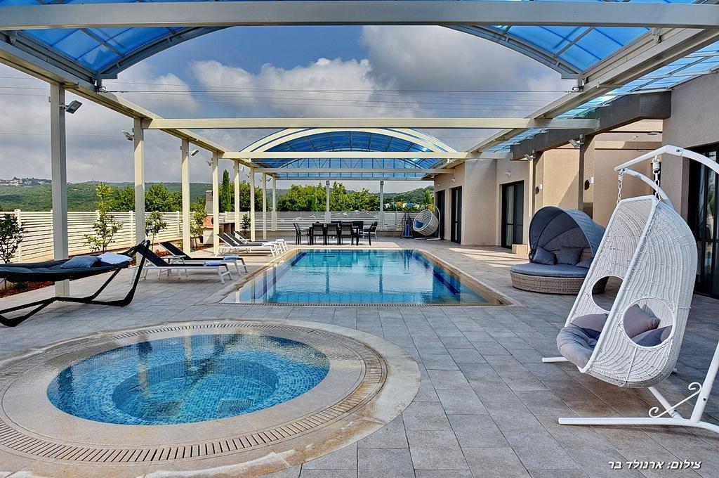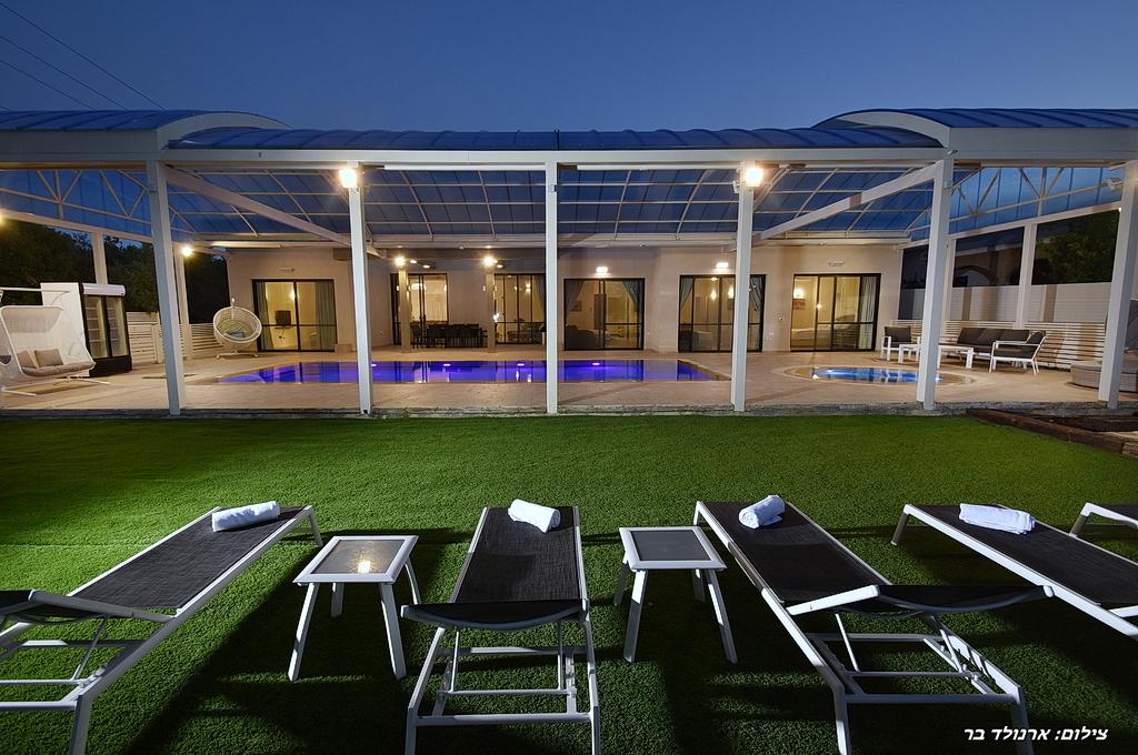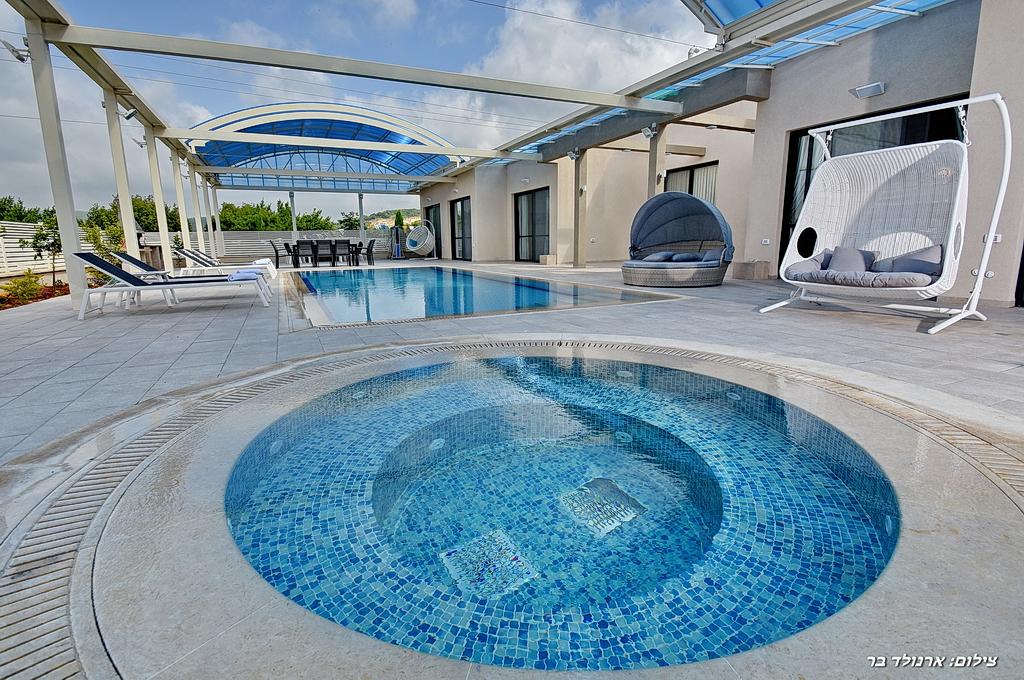 מתחם חיצוני - בריכה גדולה במיוחד עם מערכת זרמים וג'קוזי בתוך הבריכה. הבריכה מחוממת בימי החורף, פינות שיזוף, ערסלים, פינת ברביקיו, ריהוט גן יוקרתי, מקרר, מקפיא וג'קוזי גדול ומפנק.