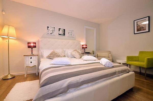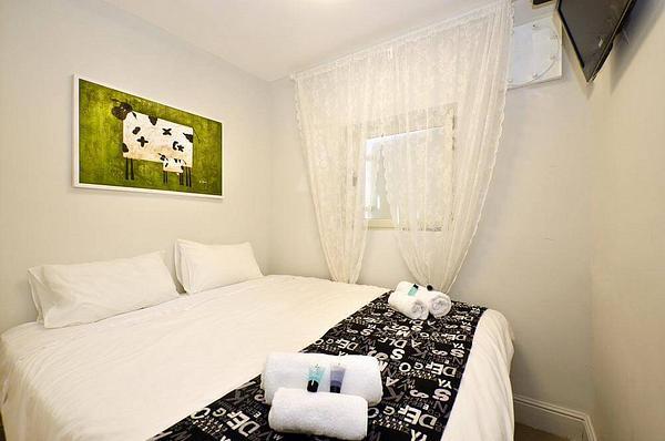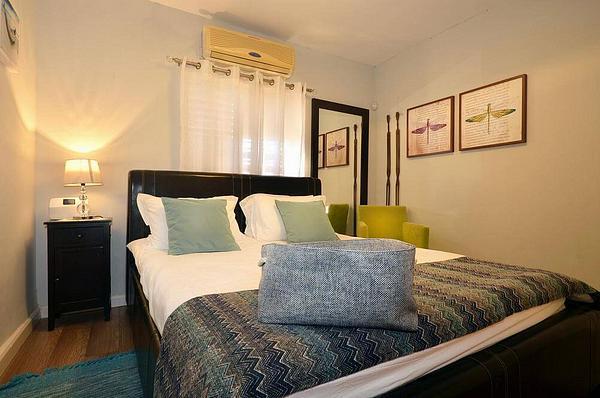 מיטה זוגית עם מצעים איכותיים, מיזוג אוויר, שידות אחסון ומסך LCD.