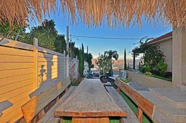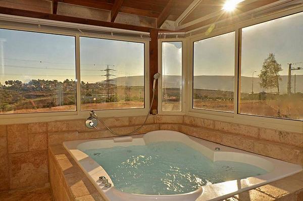 חצר מטופחת מול נוף עוצר נשימה שלא תמצאו בהרבה מקומות, ריהוט גן עשיר ופינות ישיבה, בריכה בנויה ומגודרת (8.5×4.5 מטר, עומק 1.7) מחוממת בעונה, סאונה יבשה, שולחנות סנוקר ופינג פונג, מתקני שעשועים לילדים (בית עץ, מגלשה ונדנדות), פינת BBQ על גז, ג'קוזי ספא מחומם, עמדת טאבון סאג' מקצועית ותנור פיצות חשמלי.