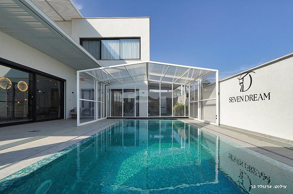 חצר ענקית עם בריכת שחייה מחוממת ומקורה בחודשי החורף.