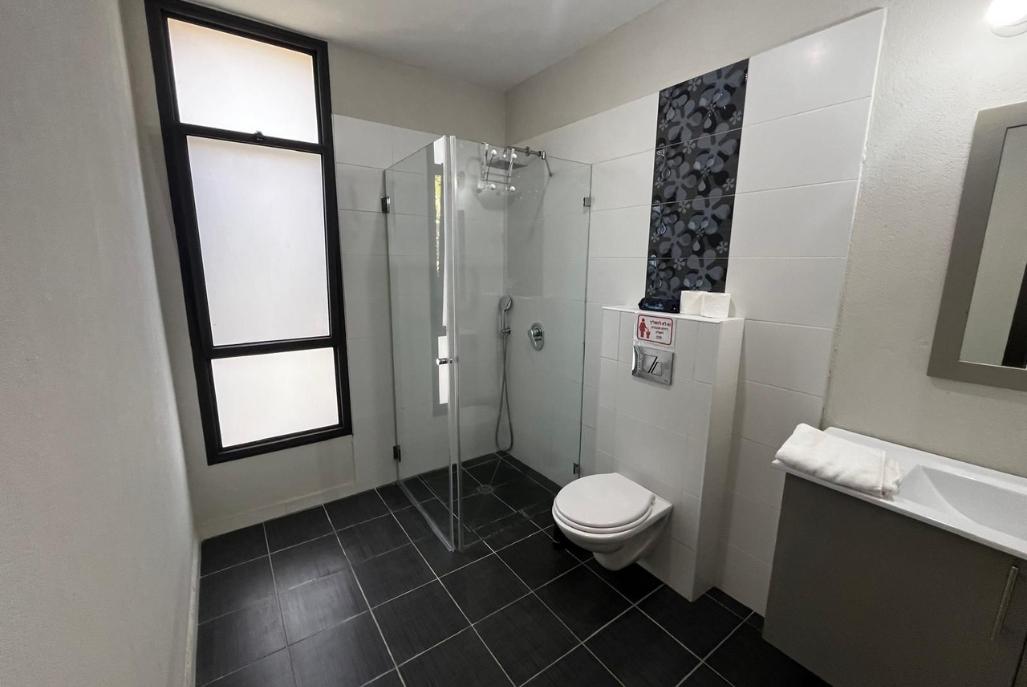 חדר רחצה אסתטי עם מקלחת ושירותים