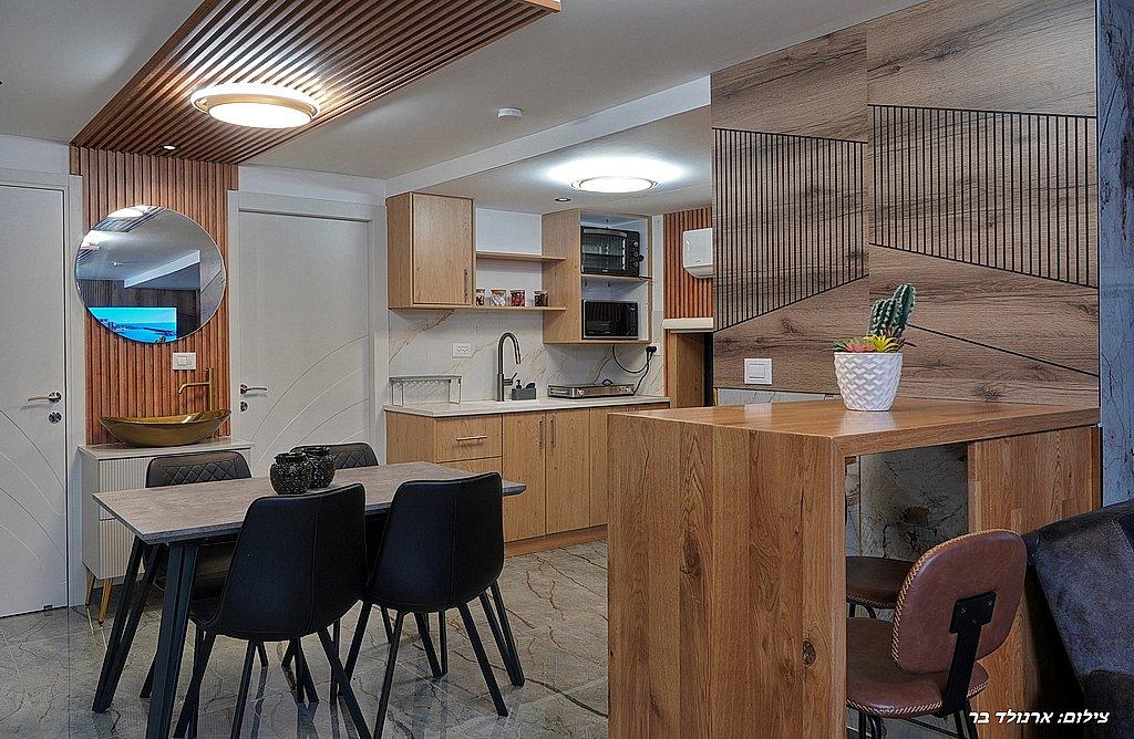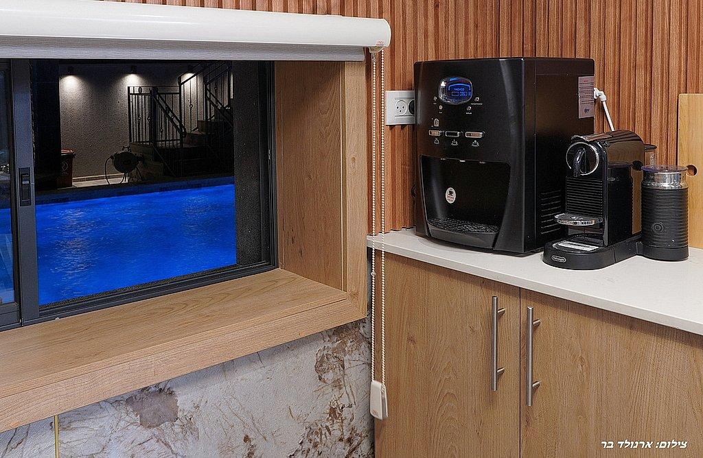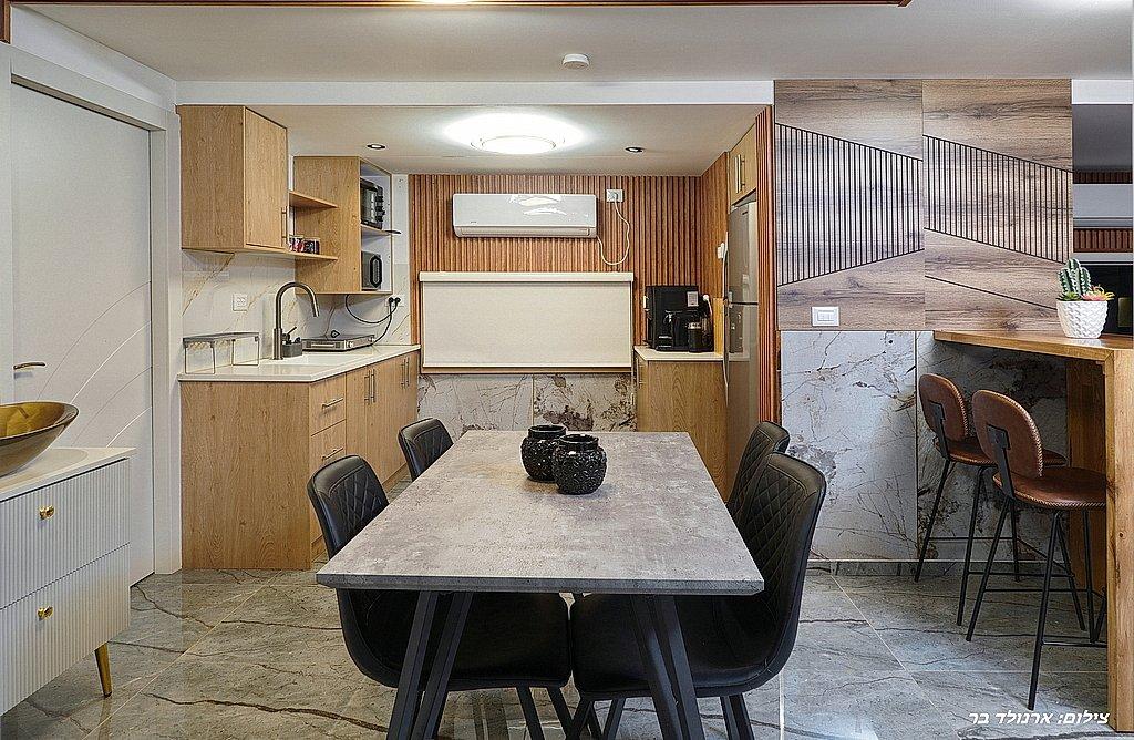 מטבח מאובזר: טוסטר אובן, כיריים חשמליות, מכונת קפה, מקרר, בר מים, מיקרוגל וכלי אוכל והגשה