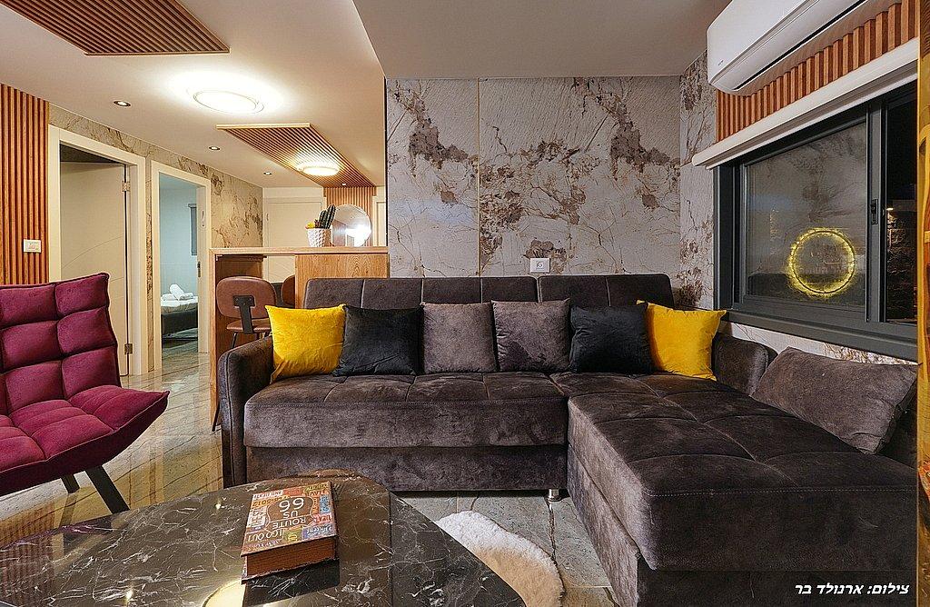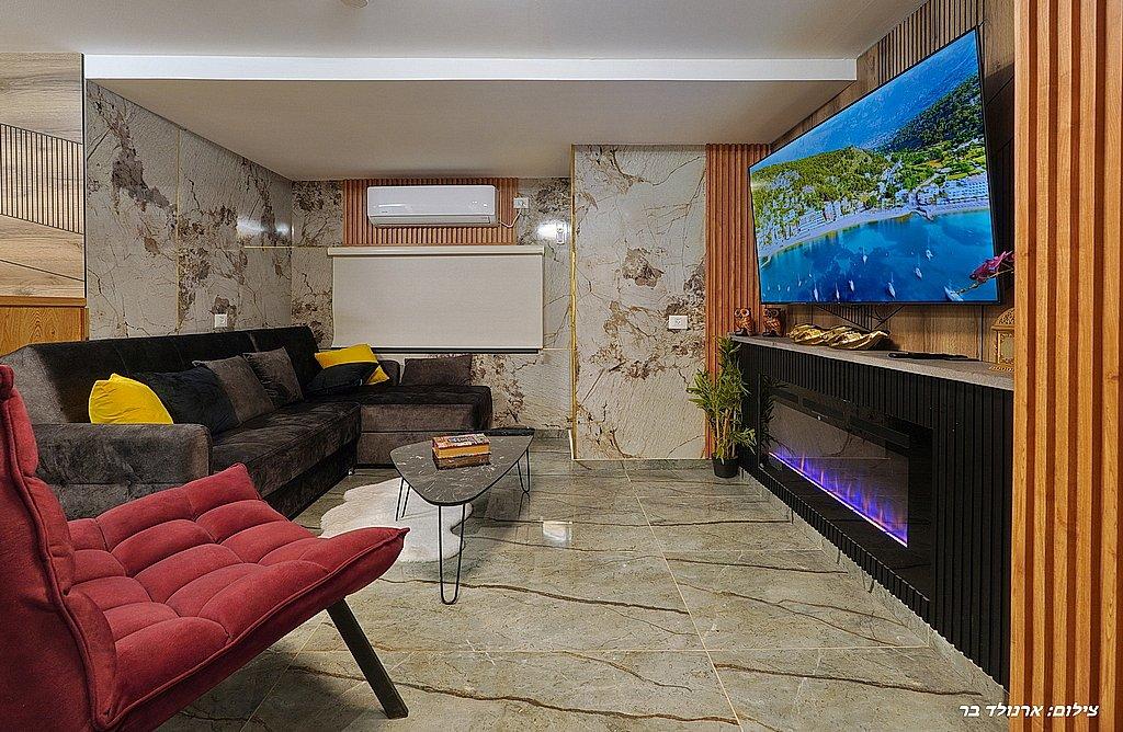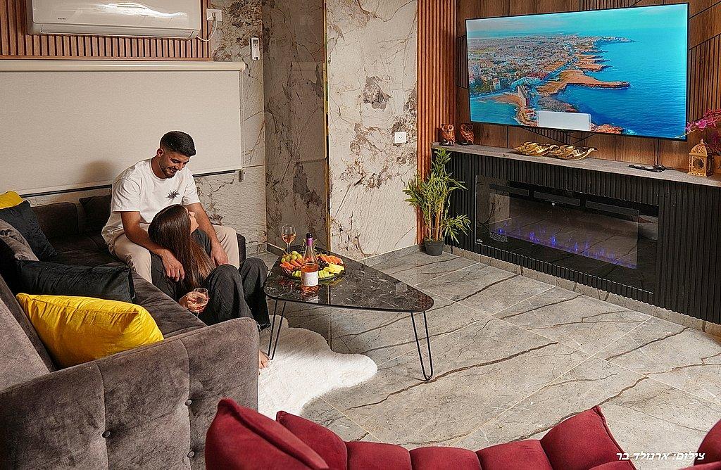 סלון הכולל מסך LCD, קמין חשמלי, מערכת ישיבה