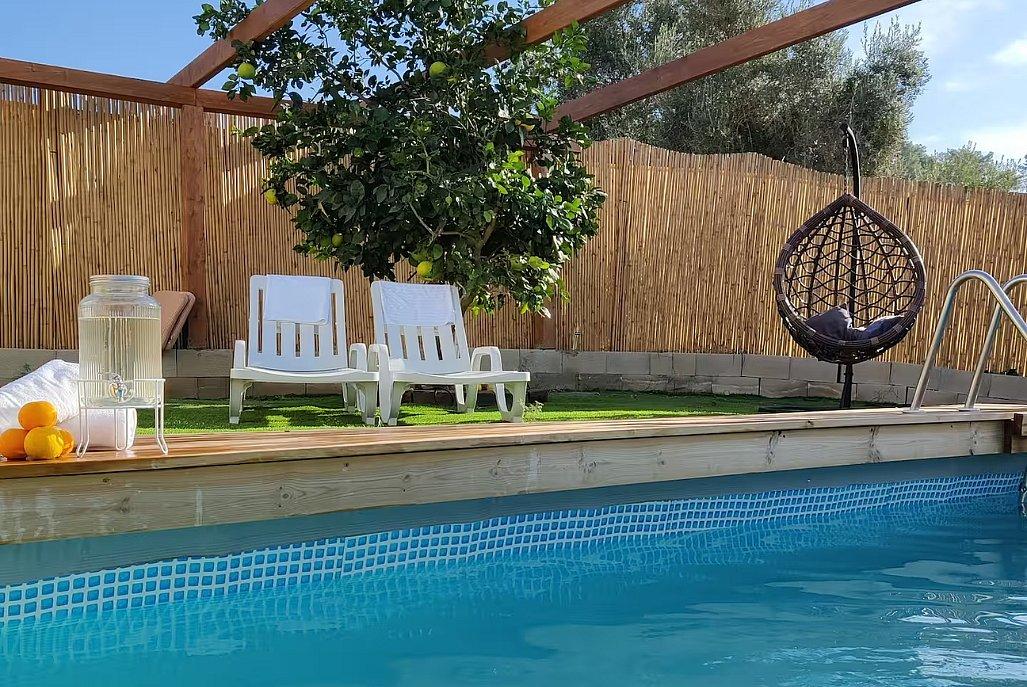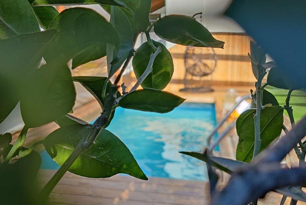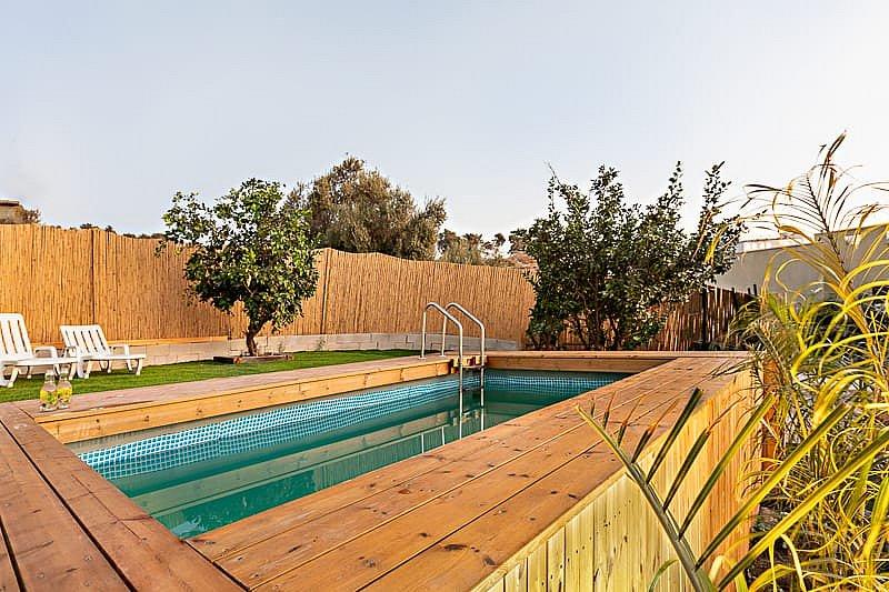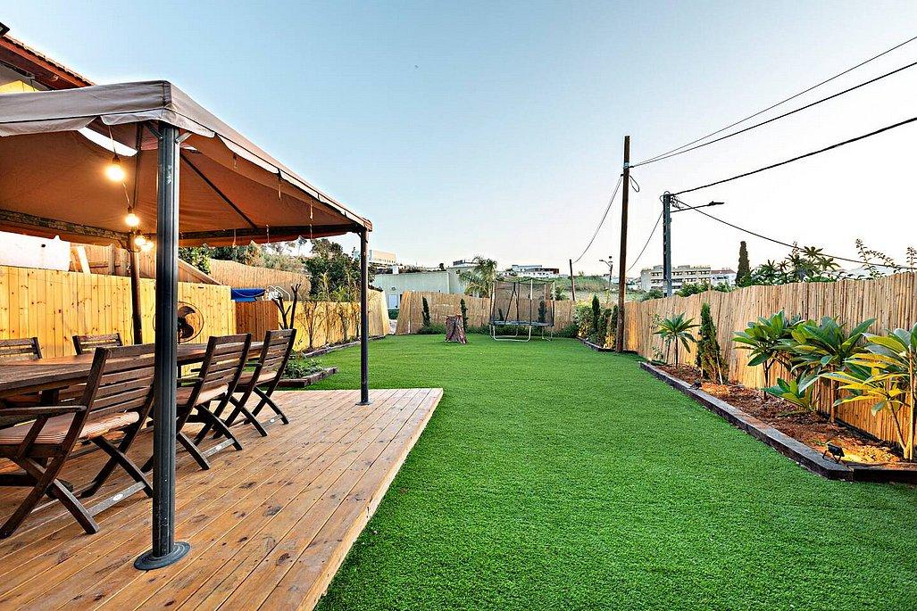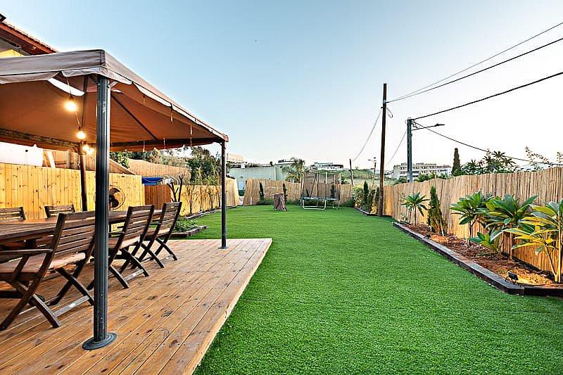 בריכה חיצונית מחוממת מוקפת דק, מדשאות רחבות, עצי פרי, פינות ישיבה מוצלות, פינת גריל איכותית, טרמפולינה לילדים ועוד.