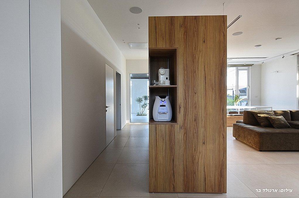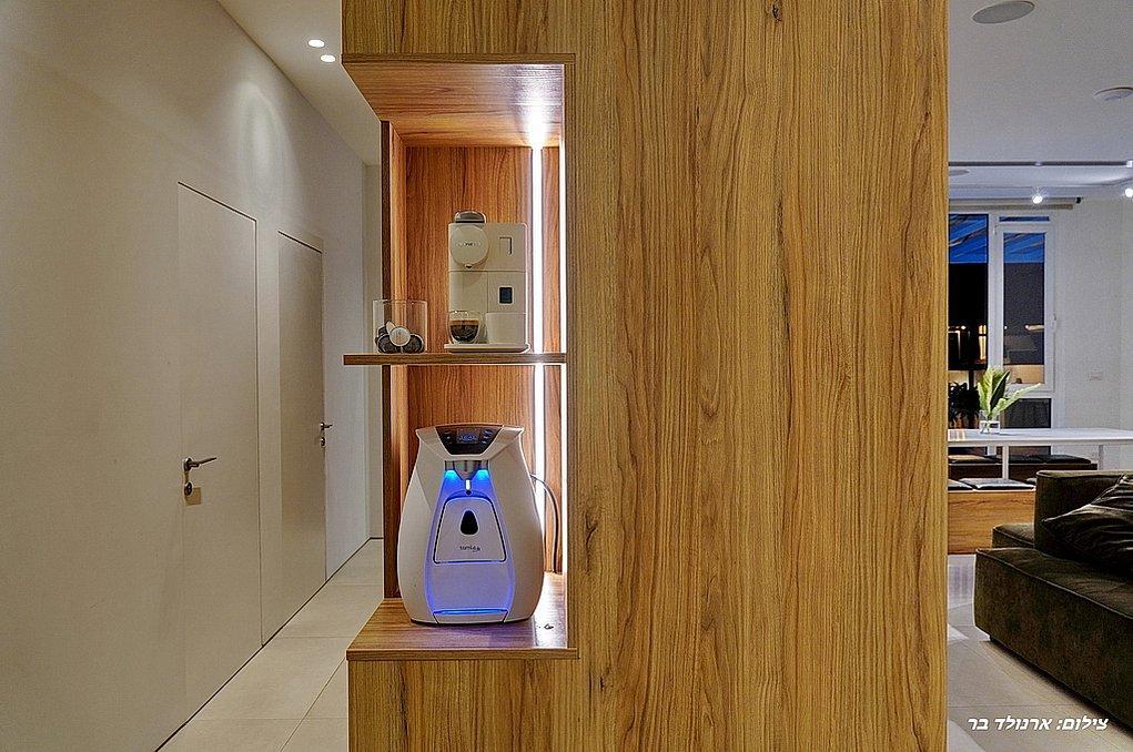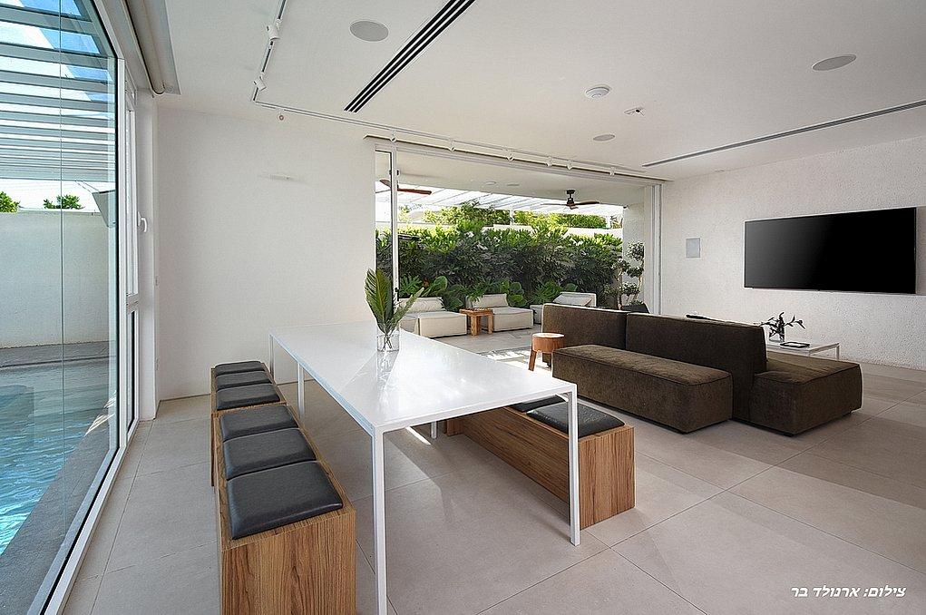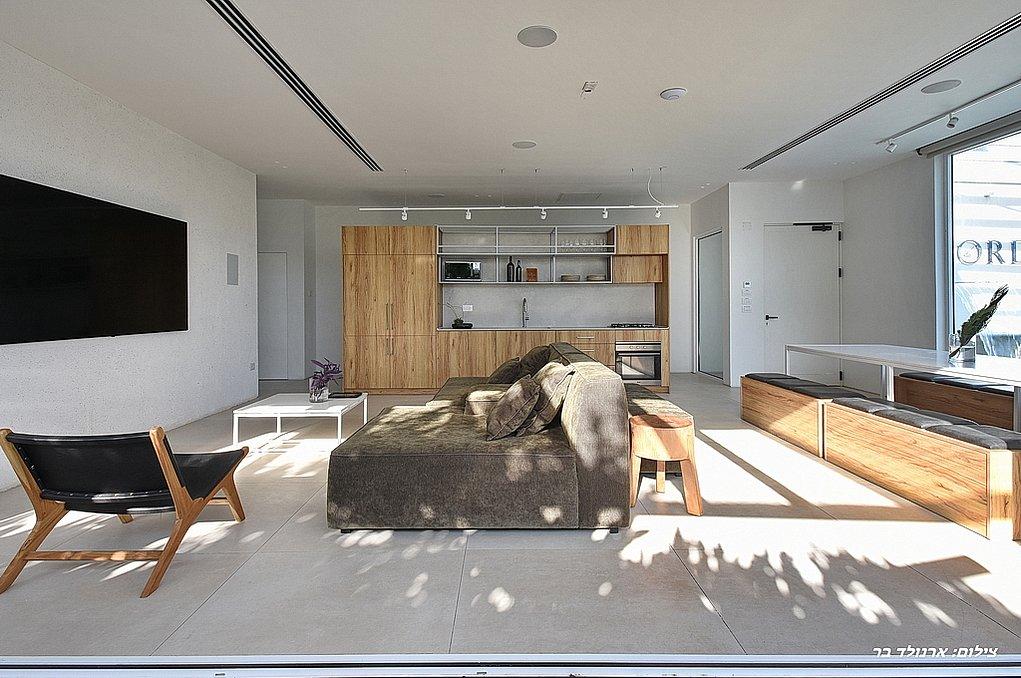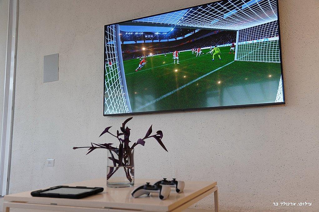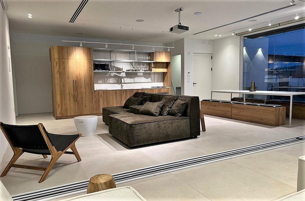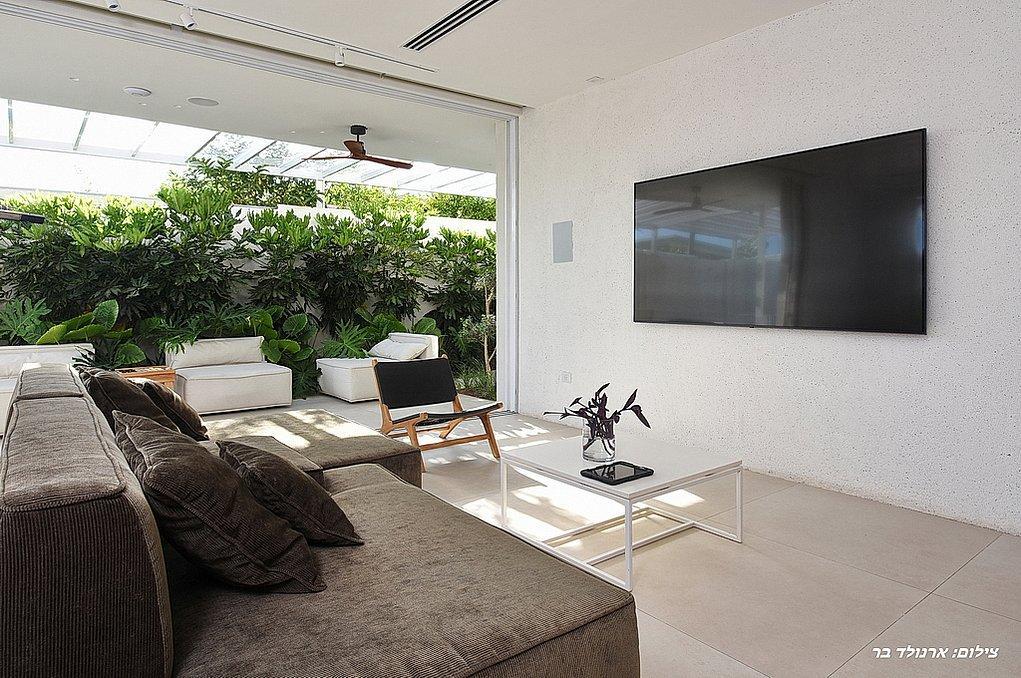 סלון מעוצב עם מערכת ישיבה, טלוויזיה ומערכת קולנוע ביתית הנשלטת ע"י טאבלט