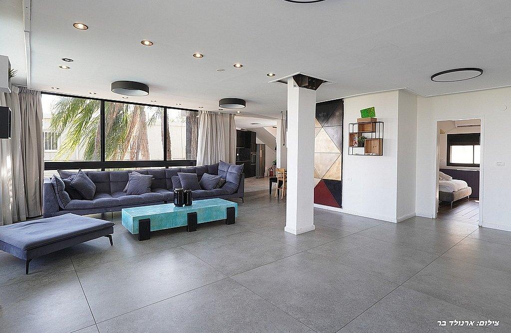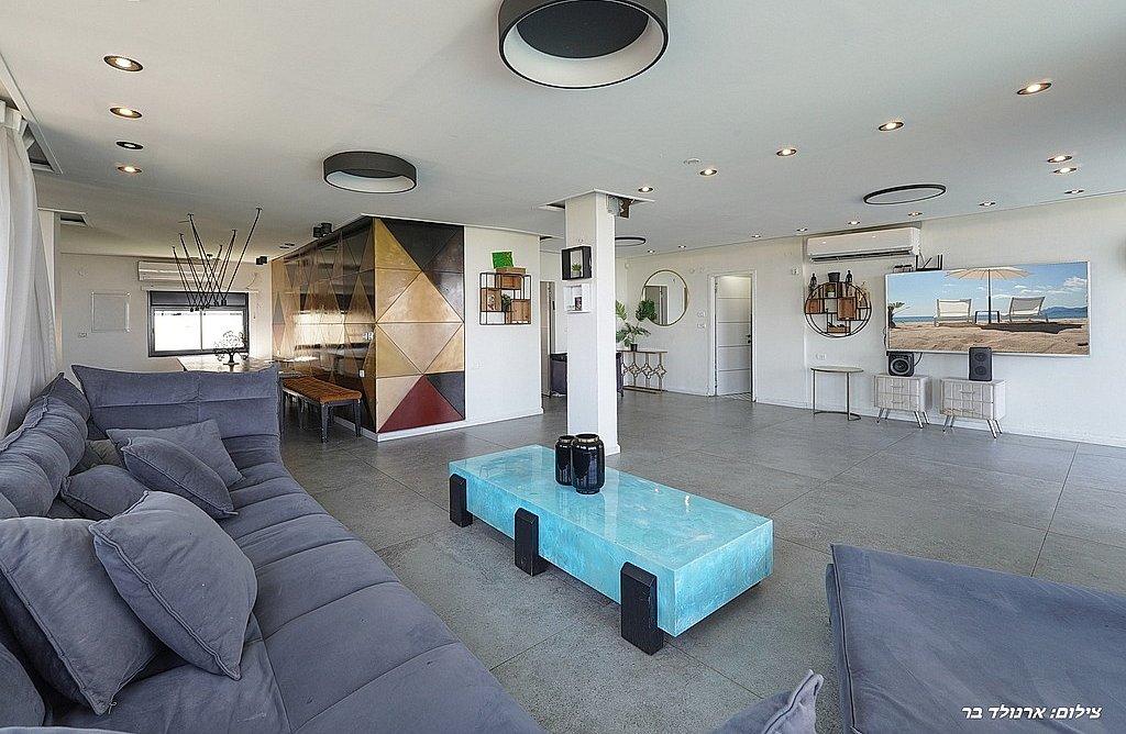 סלון רחב ידיים עם טלוויזיה ענקית עם חיבור לערוצי YES.