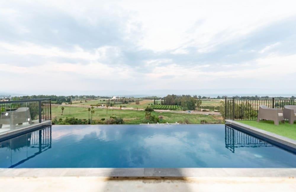 בריכת שחייה אינפיניטי הנשפכת לנוף בגודל 10X5 מחוממת בעונת החורף.
