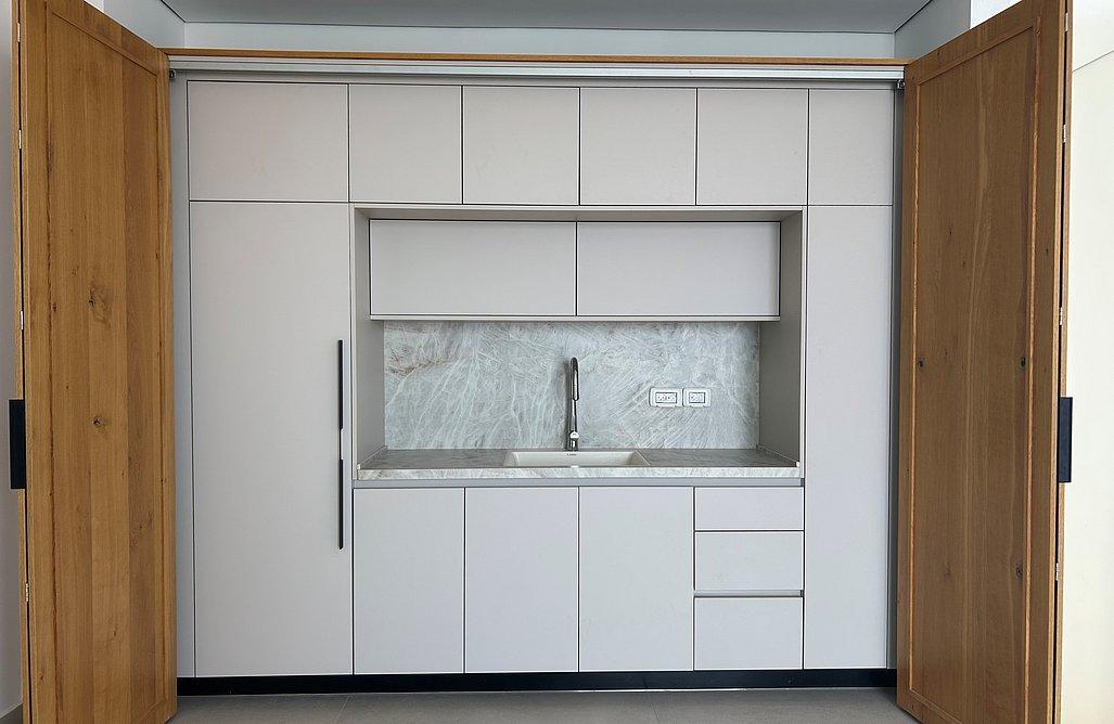 מטבחון: מקרר, כירה חשמלית, קומקום, עמדת קפה